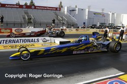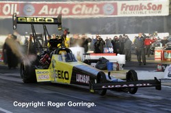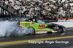 In round one Brandon Bernstein blew the tyres off against Morgan Lucas, the following bout was a good race as the 3.830/318 from Doug Kalitta saw off the 3.831/317 charge from Steve Torrence. The left lane then suddenly went sour as TJ Zizzo then Bob Vandergriff blazed the tyres against Shawn Langdon and Del Worsham respectively. Ron August Jr continued the blazing lane losers as Spencer Massey put down a 3.782/324. Troy Buff fireballed as Schumacher took the light in their pairing. Mike Strasburg clicked off early with problems as Brown went through and finally, in a huge upset, Larry Dixon slowed to a 4.486/223 as Terry McMillen fireballed another motor but took the win with a 4.188/207. Round two opened with McMillen tossing a blower belt to end his day, a 3.945/266 against the winning 3.858/317 from Lucas. Kalitta suffered a big engine detonation at three quarter track losing the race with Brown, 3.828/320 to 4.373/190. Worsham continued to impress in his new ride with a 3.810/322 win over a tyre hazing at half Massey. Another shock occurred when Schumacher blazed the slicks at half track and despite pedalling lost with a 5.375/127 to Langdon's 3.841/309 to end the round. The semis kicked off with Antron Brown in the Matco Tools/US Army car suffering a big fire and oiling the track from the halfway mark as Shawn Langdon charged to the win with a 4.033/313. Del Worsham's luck in the Al-Anabi car ended when his 4.291/186 was not enough to hold off the 4.049/220 from Morgan Lucas. The final pitted the two team cars of Morgan Lucas in the Geico Powersports/Lucas Oil machine against Shawn Langdon in the Lucas Oil Fueller and it was Langdon away first only to be reeled in by Lucas with a winning but fiery 3.835/316 to the 4.047/313.