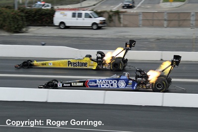 No huge surprises in round one with wins going to Clay Millican over Khalid alBalooshi, Shawn Langdon over Steve Torrence, Brandon Bernstein beating Dave Grubnic, Antron Brown seeing off Cory McClenathan, Morgan Lucas over Rod Fuller, Bob Vandergriff took out Terry McMillen, Spencer Massey trailering Steve Faria and Tony Schumacher winning against Doug Kalitta. Round two witnessed top qualifier Morgan Lucas winning by a nose in a great drag race over Shawn Langdon, 3.792/323 against the losing 3.791/319. Brandon Bernstein went into instant tyre smoke slowing to a 10 dead as Antron Brown carded a great, close to the centre line 3.771/323 for the win. Bob Vandergriff's good year start was ended by Tony Schumacher as the 3.790/324 beat the 3.815/323. Spencer Massey continued to impress with a slight lead turning into a win against Clay Millican, 3.776/326 to a losing 3.847/315. The semis showed three Don Schumacher Racing machines in the chase and it was Spencer Massey that led the way against team owner's son Tony Schumacher, a wheels up second quickest time of 3.745 at a fastest-ever speed of 328.62mph over the one thousand foot track put Massey in the final as Schumacher's 3.809/322 failed to catch up. The last of the DSR cars had Antron Brown face Morgan Lucas and it was Brown's 3.819/320 that got the win as Lucas slowed with problems at half track. An all DSR final pitted young gun Spencer Massey in the FRAM/Prestone car against the Aaron's/Matco Tools machine of Antron Brown and despite a good holeshot coupled with a 3.794/320 Brown lost as Massey charged past with a winning 3.750/325.
