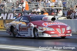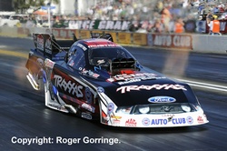 All eyes were on the new name in the class, one Courtney Force who on her début recorded a twelfth place in qualifying with a 4.199/307. Round one losers included Jeff Arend to Gary Densham, Johnny Gray to Tim Wilkerson, Bob Bode to Jack Beckman, Robert Hight to a jubilant Todd Lesenko who had hazed the slicks and got close to the wall but won. Tony Pedregon lost to Mike Neff whilst Bob Tasca lost giving Courtney Force her first round win. Alexis DeJoria lost to John Force in a close call and ending the round, out went Champion Matt Hagan to Ron Capps. A bizarre occurrence took place in the opening pair as Jack Beckman who was ahead of Gary Densham suddenly ended up in his lane, the pair just lightly colliding nose to tail but giving the win to Densham. Todd Lesenko's weekend ended in shake and tyre smoke that deployed the chutes coasting him to a lose as Ron Capps' 4.086/311 got the light. It was Courtney Force's turn next to go away with the lose as her 4.143/313 was not enough to catch teammate Mike Neff's 4.070/315. The final pair had John Force lead the way with a holeshot 4.160/311 as Tim Wilkerson chased, losing with a slowing 4.574/208. Gary Densham's wounded machine red lit away his chances as he faced John Force in the semi final, a 4.141/312 was Force's winning number. A close race followed with Mike Neff passing Ron Capps to take the light with a 4.074/314 to the losing 4.101/308. An all John Force Racing final ensued as Force in the Castrol GTX High Mileage Ford Mustang took the event win with a 4.080/315 as Mike Neff made a somewhat somnolent leave recording a chasing 4.036/316 in the Castrol GTX Mustang.