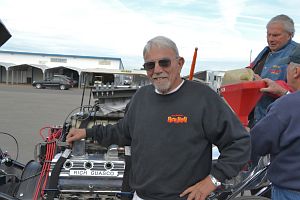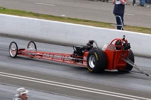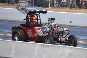 Winner of 7.0 Pro Richard High runs a dragster built in 2005 with a Chevy 500 cu in engine. His opponent in the final run was Brad Denny and his '32 Bantam, who red-lit
