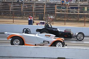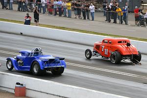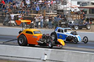 In Nostalgia Eliminator III the '23 T of Tim Beeman is ahead of the Brogie Roadster of Ernie McAllister, however it was Ernie who prevailed on a holeshot.