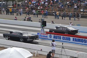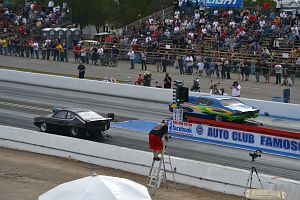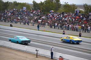 Jessie Wootton (left lane) in his '65 Malibu went against Cliff Boyles '74 Arrow and it was Boyles who came out the winner.