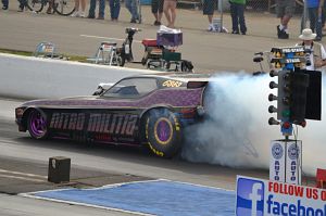 During gaps in eliminations several Funny Cars came out for test passes. Here Jordan Pawlick from Alberta in Canada warms the tyres before carding a 6.00 pass in the Nitro Militia Mustang.