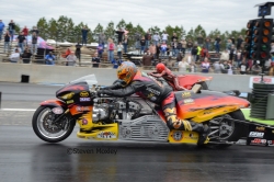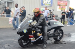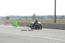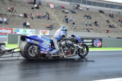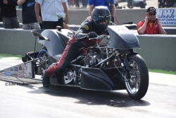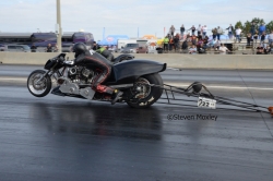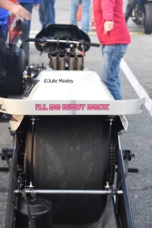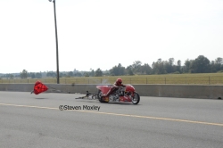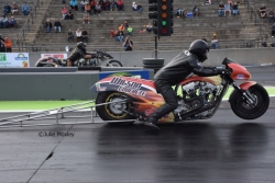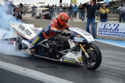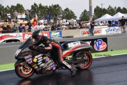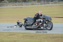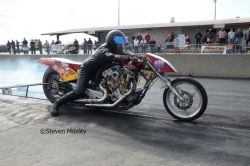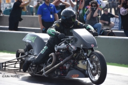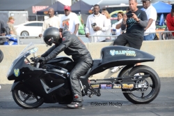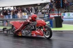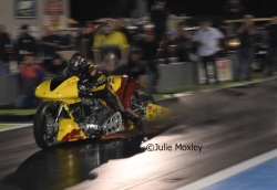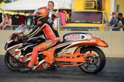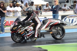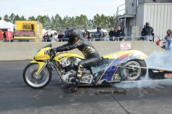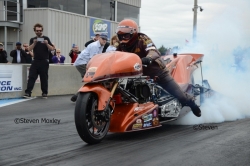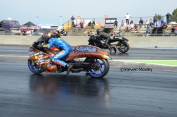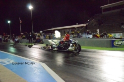 Dave Vantine ran 5.93 in testing before the event and ran another 5.939/230.76 for number two spot. Korry Hogan ran 6.022/238.47 with the sump leaking. The next pass a bolt broke on the blower pulley. Chris Hand had engine issues and changed motors after qualifying with a 6.306/183.17. Top Fuel Harley rider Mitch Brown was doing licence runs on Dennis Bradley fuel bike. Wills constructed the bike, Mike Dryden, did the fuel system and Brown constructed the billet cylinder head. Brown qualified with a 7.213/141.02. Sam Wills had a weekend to forget. He overpowered the track on every run in qualifying and changed the motor for the final session running a best of 9.044/134.75. The first round saw McBride against Wills to decide the title. McBride hooked up and was gone (6.050/245.09) while Wills smoked the rear tyre again and did a controlled quarter mile burnout to a 11.739/117. Vantine had a bye 5.864/238.17 after Brown was a no show due to a broken transmission. There was drama in the last race Hogan against Hand. Both launched well but at mid-track a con rod broke on Hogan’s motor coming out through the sump and dropping oil in front of the rear tyre. The bike leaned at the 1000 foot mark and hit the wall in the shutdown area, burst into flame and the went across to the other lane hitting the wall. Hogan was taken to hospital and was OK and returned to the track. Hand (5.916/226.16) was ahead when the bike crashed. McBride had a bye to the final and smoked the tyre off the start line. Vantine ran low et of the event 5.795 to beat Hand 9.091. In the final McBride won the event 5.990/234.09 and the Championship when Vantine smoked the tyre off the start line. Top Fuel Twin Tracy Kile made a last minute decision to come to this event and do some testing for the new fuel bike he is building for 2017. Kile ran a 6.550/206.26 for number one qualifier. Takeshi Shigematsu ran 6.561/208.71 on his Pro Charger V-Twin. Next up was Jim Page on a new bike and ran 6.640/202.00. Billy Jack was riding the ex-Jim Fagin bike that Mike Romine delivered to the track. Jack got very close to the wall in the shutdown area during the second qualifying session with a 6.697/205.85. Tadashi Saito only got his bike three days before the event and did some shakedown passes to a best of 8.766/143.90. Both fuel bike classes suffered rear tyre chunks (holes) on nearly every run as the track prep had been very good. Kile had a bye run and ran low ET of 6.503 at 211.13. Page ran Personal Best figures of 6.594 with a top speed of the meet 217.49 to beat Jack 9.875. Saito had a problem in the staging lane and Shigematsu solo 7.749. The semi-finals had a great race between Kile and Page. Kile put a holeshot (reaction time of 0.035 to 0.116) over Page and held on to the win 6.755/169.98 to a quicker but losing Page 6.740/203.80. The final was another great race Shigematsu with pro-charged motor against Kile's normally aspirated bike. Shigematsu put holeshot (Reaction Time of 0.038 to 0.096) over Kile and took the win light 6.529 with a p/b speed of 215.48 (with this new combination) to Kile's quicker but losing 6.524-189.79. Pro Fuel There was plenty of excitement in the opening qualifying session with two of the quickest runs in the history of the class. Kirby Apathy ran 7.071 at 180.28 to become the quickest Pro Fuel Bike. But that didn’t last long, Michael Ray riding Johnny Vickers bike ran 7.063 at 179.85 to become the unofficial record holder. Apathy ran 7.11 in a later pass to become the record holder. Jannette Thornley was the next rider with 7.324/176.84. The Championship was decided in round one as Championship points leader Tyler Wilson got knocked out by Apathy and Cliff Holley ran Personal Best figures 7.347/179.02 to beat Rocky Jackson, meaning Wilson was the Champion. Jordan Cruz had problems in qualifying, but come race day everything went well and he reached his first Man Cup final. Ray took the win light in the final and ended Cruz day 7.324 to 7.638. Pro Street The final of the Rockingham meeting was run during qualifying. Terence Angela, who only managed to qualify eighth with a 6.933/210.11, beat Rodney Williford who was the number one qualifier with 6.782/217.00. Just ahead of Mark Paquette 6.791/214.48, Ehren Litton 6.794/218.83 top speed in qualifying. Joey Gladstone was just behind in fourth 6.828/213.23. Eleven bikes qualified in the six-second zone with Jordan Haase 6.966. In round one of eliminations Brad Anassi's bike fishtailed at three-quarter track when racing against Ryan Hable. Anassis parted company from the bike when he hit the wall, but fortunately he was OK. Pro Street eliminator was finished on Monday. Gladstone beat Angela in the semi-final 6.847 to 6.882 to win the Championship. Jeremy Teasley beat Paquette in the other semi-final 6.954 to 7.096. Gladstone won the event when Teasley was a no-show in the final. Shootout Twenty nine bikes entered the DME All-Star Pro Street Shootout and there were a few Personal Bests set during qualifying and eliminations. Rodney Williford was the number one qualifier 6.760-217.88. Ehren Litten was just behind with 6.769 with a top speed of 221.60. Mark Paquette was in number three spot 6.826 at only 198.35. Round one and Paquette ran a jaw dropping 6.707 at 211.63 (quickest ever run by a Pro Street bike) to beat Tony Ficher. Paquette had to change his motor and lost in the next round. The final was between Williford and Litten, which was decided on the start line when Williford spun the rear tyre and Litten was gone, storming down the track and taking the win light 6.81. Litten collected $10,000 for the win. Report and pictures by Steven and Julie Moxley