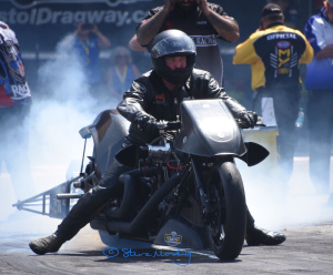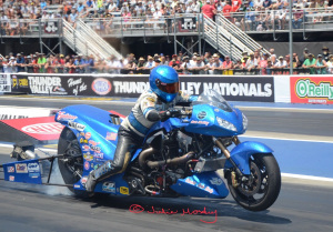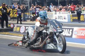 Tutterow red lit in round one against no 16 qualifier Jose Gonzales. Reigning Champion Mike Janis 5.879 lost a close race to No 14 qualifier Bob Rahaim 5.872. Sidnei Frigo ended Jackson weekend in round two. In the semi-final Frigo motor blew at track against Rahaim. In the other semi Enders lost to Gonzales 5.850/256.02mph to 5.906/256.21mph. Gonzales won the event when Rahaim's motor started to smoke and lose power at the finish line. Top Fuel Harley. There was a good entry for round six of the Mickey Thompson Tyre Top Fuel Harley race series. Twelve bikes competed for the eight-bike eliminator. Jay Turner on his pro-charger V-Twin was the number one qualifier with a 6.319 at only 212.76mph (low et of the meet). Mike Scott just edged Series points leader Beau Layne for number two spot with 6.340/228.04mph (top speed of the meet).