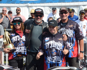 In eliminations, Turner lost to Tracy Kile when he smoked the rear tyre just off the start line. Reigning champion Tii Tharpe beat Doug Vancil who was fighting to keep the bike in the lane. Layne won on a holeshot at 6.635 against Rickey House's 6.447 and Bob Malloy, who got in the show in the final qualifying session, beat Scott. In the semi-finals Tharpe ran his quickest of the weekend, 6.356, to beat Kile. In the other semi Malloy ran his best of the weekend, 6.417, to reach the final, edging out Layne who ran 6.462. The final turned out to be the best race of the day. Malloy led from the start and slowed in the last 300ft, Tharpe powered past to take the win light. Mountain Motor Pro Stock. This is the third of four NHRA appearances for the Mountain Motor Pro Stock series this season. Thirteen cars tried to qualify for an eight car eliminator. John De Florian Jr ran low et and top speed of the meet at 6.345/221.82mph in qualifying, just ahead of Todd Hoerner's 6.346/220.94mph and Johnny Pluchino's 6.364/220.01mph. De Florian beat John Konigshofer in round one, but lost on a holeshot to Frank Gugliotta in the next round. Hoerner eased past Steven Boone and Elijah Morton who both had troubled runs. Hoerner beat Gugliotta in the final, 6.425 to 6.998. A special wedding took place at the top of the main tower during the eliminations. Lars Andersson, (he competed in the World Finals, I think that was the title of the event, at Santa Pod Raceway in 1991 in his 59 Plymouth Fury Estate) got married.