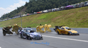 2019 NHRA Thunder Valley Nationals at Bristol Dragway by Julie and Steven Moxley Click on any picture for a large image, hold mouse over any picture for a caption Back in the mid-eighties when Pro Mod raced in the IHRA, one of the tracks that always looked very picturesque in the magazines and videos was Bristol Dragway. I said one day I would like to go there... We arrived in Atlanta on the Wednesday 12th June, and the following day drove up through the Smokey Mountains National Park. It was in readiness for Friday, our first day at Bristol Dragway for the NHRA Thunder Valley Nationals. This was round eleven of the twenty-four race series of the NHRA Mello Yello Drag Racing Series, coinciding with Fathers' Day weekend. On arrival we checked in at the media room with the NHRA. What a stunning place Bristol is, with its track cut in between the mountains. The weather was hot over the three days we attended; temperatures started at the mid-seventies and on Sunday reached 96 degrees, with track temperatures of 129 degrees. I was at the top end taking parachute shots, and the NHRA track crew gave me a bottle of water and said 'Its 20 degrees cooler than last year'. Top Fuel. Former champion Brittany Force was the number one qualifier after the opening session, but Doug Kalitta came out on top at the end of qualifying with a low ET of the meet of 3.755. Clay Millican had a fireball at the finish line in the second session; a new motor was fitted for Saturday. Dutchman Lex Joon qualified in fifteen spot with his spare motor, after damaging his number one motor (after ten runs) the previous weekend in Topeka. He brought another motor and built it up at the track. With a limited budget he was planning three runs over the weekend. There were a couple of shock results in round one of the elimimations, which saw Joon win his first race of the year when Leah Pritchett went up in smoke at mid-track. Force also lost traction against Dom Lagana. In round two Joon lost a blower belt against Lagana and Kalitta just beat Terry McMillen to the finish line after a pedalfest.