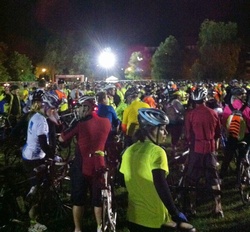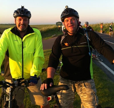I didn't have a clue where we were most of the time so I can't say "When we were at..." so bear with me. My tracking is here if anyone wants to look and maybe work it out: maps.google.com/?q=http://share.abvio.com/4e9b/13be/4dd8/85f0/Cyclemeter-Cycle-20120527-0042.kml After a few miles we started a long uphill stretch, several miles of fairly steady climbing with very little respite. Even with that we managed to maintain an average of over 12 mph which was our target pace as we wanted to be in Brighton by 6.When we eventually did hit a decent downhill slope it was a monster, to the point where a Marshall was positioned a hundred yards from the bottom shouting "Watch your speed, main road at the bottom". We skipped the first rest stop at 12 miles. It just felt too soon to be having a break so we carried on to the middle stop at 29 miles. It was very well organised with water, fruit, oat bars, chocolate biscuits, jaffa cakes, tea, coffee, mechanics and portaloos. We topped up with water, grabbed an oat bar each, popped to the loo and head off again. Most of the ride was fairly uneventful, but there is something a little bit special about riding through the countryside with only the sound of tyres spinning on tarmac at 3 or 4 in the morning when the people in the houses you're going past are wrapped up in bed. I can't really describe it, but it's pretty cool. There was a massive downhill stretch at one point, somewhere around the 33 mile point, a good mile or so in length. I hit just 35mph down it and I was riding my brakes ! It was bloody terrifying. I've come close to that sort of speed before, but not at night, and I was very conscious of the fact that any stone, crack in the road, anything, would have sent my flying. Not a particularly nice feeling. We stopped again at the 43 mile rest stop, again very well organised, and fuelled up for the final stretch. Devil's Dyke, what a bastard of a hill. There's a pretty steep but manageable hill to start with, but that obviously takes a bit out of you, when 50+ miles has already taken most of it out of you already. Then you have a little respite for a mile or so, then the big one. I reckon I managed 30 yards or so before I was off and walking. My riding partner, who normally eats hills, managed about 50. Very few people made it up that, and there were numerous piles of vomit on the verge to attest to had bad it was. Then we witnessed something nothing short of spectacular. I heard some quite alarming noises behind me, grunts and wails and loads of AAAARRRRRGGGGHHHHHHs. I turned to see a bloke of about 20 on a knackered old folding bike with wheels no bigger than 14" wobbling all over the place but grinding his way up the hill. To a man we stopped and stared at him, including the lycra boys with their 10k bikes, with everyone willing him on and shouting encouragement. Bugger me if he didn't make it over the top. Now assuming he had done the whole ride, this bloke had ridden 54 miles to that point and fought his way up this beast of a hill and was stood on the sea front when we finished, and he must have started after us ! We stopped at the top and got someone to take a picture of us (above) then headed into Brighton. It's about a 4 mile descent into Brighton which is great for no better reason than it lets you recover and enjoy the finish. A couple of miles along the seafront under blue skies then through a proper finish line with a couple of dozen locals leaning over the barriers clapping and shouting is a pretty good feeling. As you go through a pretty little thing hands you a medal, a bottle of water and a smile, while a bloke with a mic shouts out some congratulations and thanks for taking part. After a breather the bikes were loaded onto a lorry and we got on the coach. 2 coaches per lorry with the coaches following the lorry back to Clapham Common. Now the best air conditioning in the world isn't going to cope with 56 very sweaty people so there was a bit of a pong, but it was a smell with a sense of achievement in it J Bikes collected at the other end we set off for the car, loaded up, changed into some dry clothes, and headed home, stopping along the way for a big fry up ! Total time taken was 5 hrs 13 minutes, with 33 minutes of stop time we were in the saddle for 4 hrs 41 minutes at an average speed of 12.75 mph. I'm very pleased with that, not bad for a fat bloke who hits 45 this year :-)