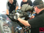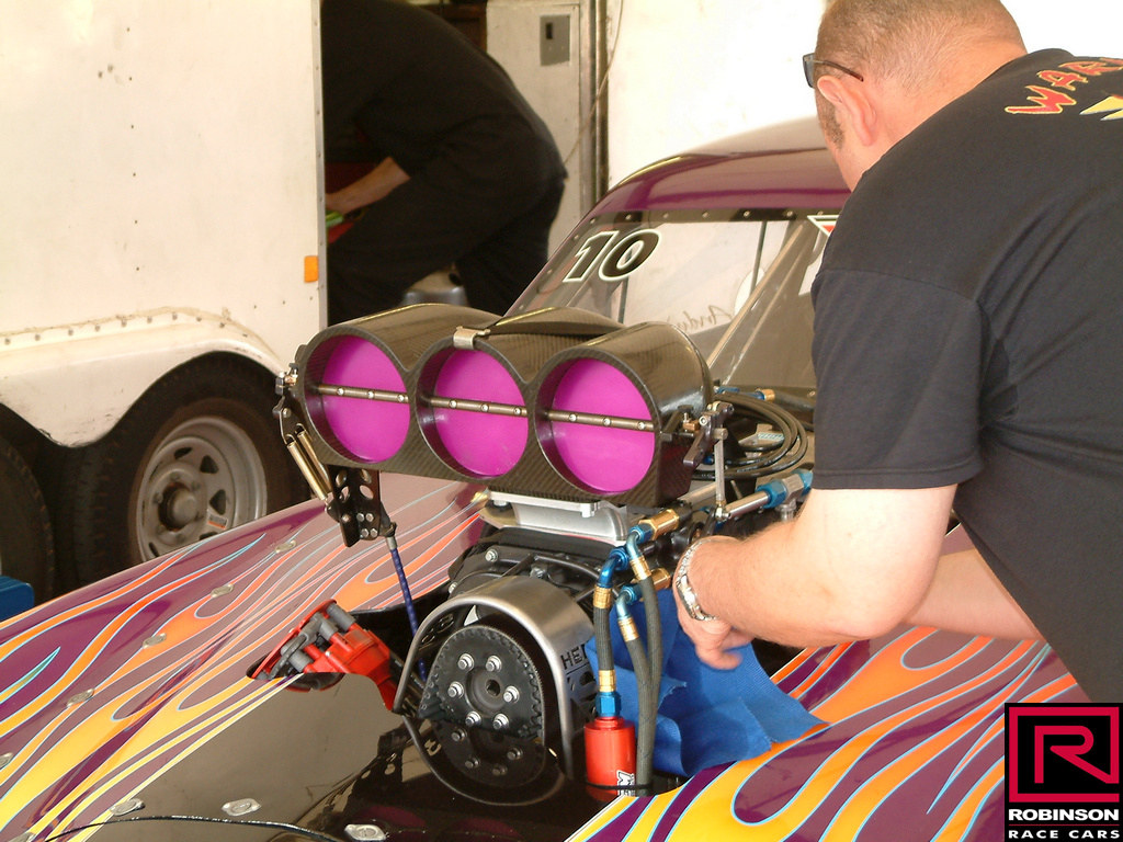 All was well for our first competitive run on Saturday morning. We were in a cannonball type competition with the best three of four runs to count and the two fastest cars to run in a final. We ran a 6.4, which was 3/10ths ahead of the rest of the field. Between rounds we pulled off the blower to re-torque the heads.