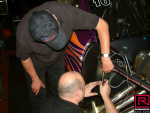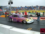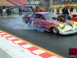 Sadly Sunday morning dawned wet and windy as you can see from the shiny track (pic31). Things had dried up a bit by 2:00 pm so a number of cars were asked to do a burn out and launch to reward the spectators who had waited patiently in the rain (pic35). The burnout was as wild as you would expect on a dampish track as you can see from the wavy black stripes (pic37). Danny Cockerill's RRC built 57 Chevy in the other lane (pic38). One of the unusual things about the NitrOlympxx is that dinner is provided for the racers at the awards ceremony after the end of racing. Although there had been no racing Rico decided to award the trophies anyway. Because we had the two fastest times we were given the Pro Mod Thunder trophy.