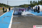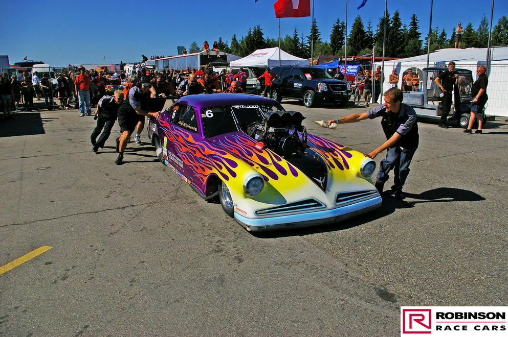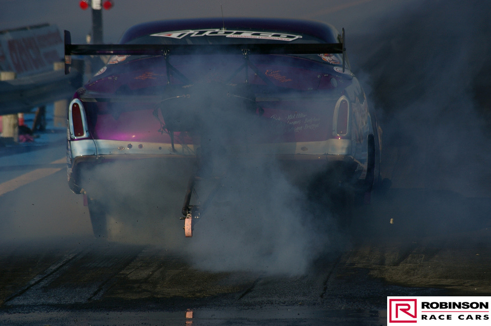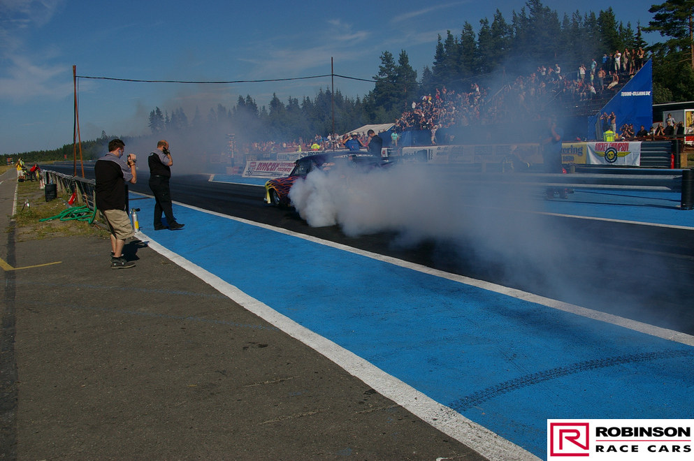 How not to start a ProMod car: the starter problems that first showed themselves the previous weekend in Mantorp visited us again in first qualifying. Here (Pic 9) we see Luke desperately trying to squirt fuel into the butterflies while the rest of the crew and most of Gordon Appleton's crew push. The car started but on the run the car went quickly into tyre shake so Andy shut off early.