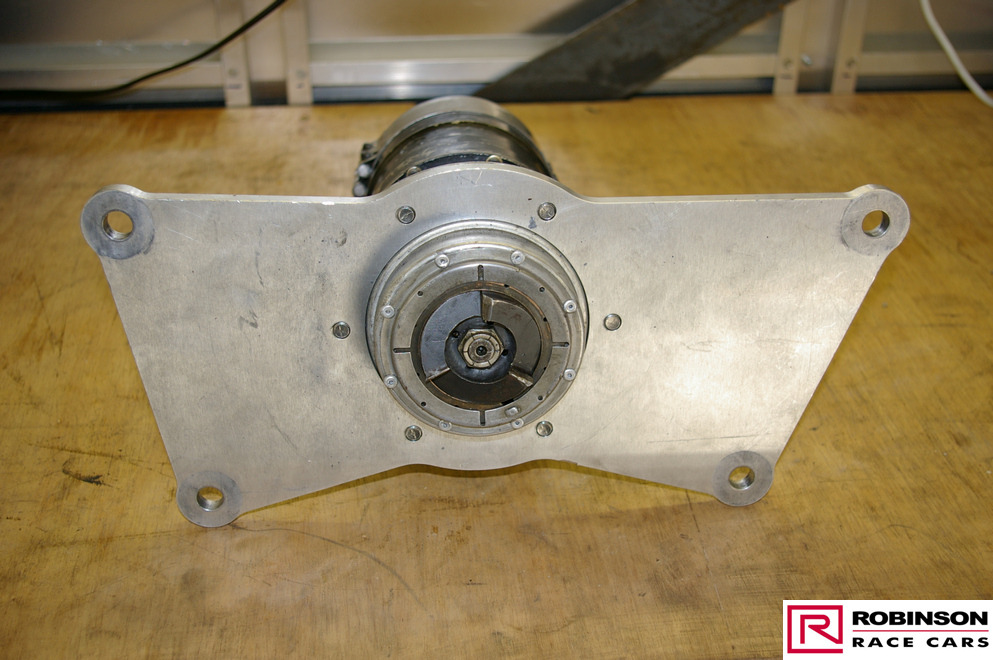 At a late stage on Friday, the team decided to convert to a conventional starter arrangement rather than the front mount. The problems were that we didn't have a conventional starter, we didn't have a ring gear on the flywheel for the starter to engage, we didn't have a mounting on the motor plate for the starter or a hole for the starter pinion to go through and no pocket on the bell housing to cover the starter pinion.