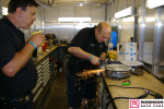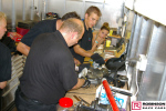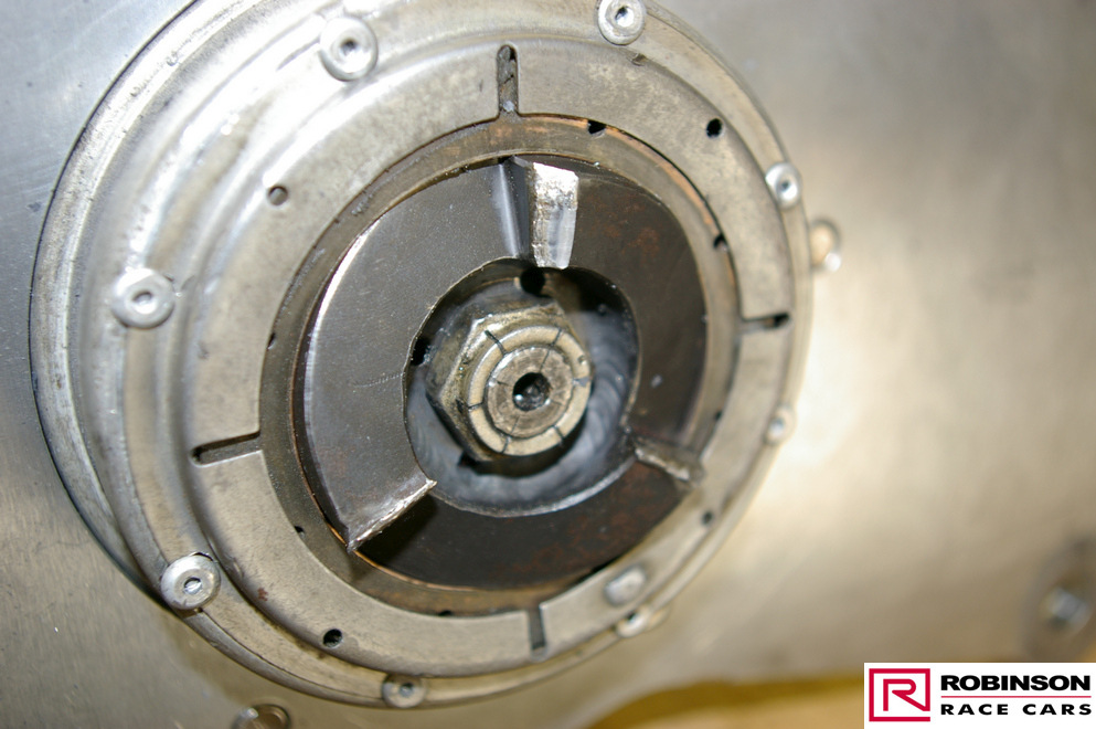 After two rounds of racing, the jury rigged ring gear gave up so another one had to be fitted, this time borrowed from Sverre Kahrs. In one of the pictures you can see Bowser, Andy and Luke struggling to fit a cold ring gear on a hot flywheel while Tom and Stefani look on (Pic 33).