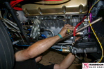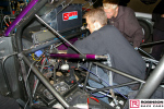 We borrowed a starter motor from Gordon Appleton, a ring gear from Mats Ericksson and tools from just about everybody in the FIA pits. Some welding was required on the ring gear which Andy did followed by Bowser dressing off the welds with an angle grinder (Pic 16). You can see Andy drilling mounting holes in the motor plate with Jerry and Bowser providing light and checking alignment (Pic 17). Luke and Tom checked the inside (Pic 18). Then Andy made a trial fit (Pic 19).