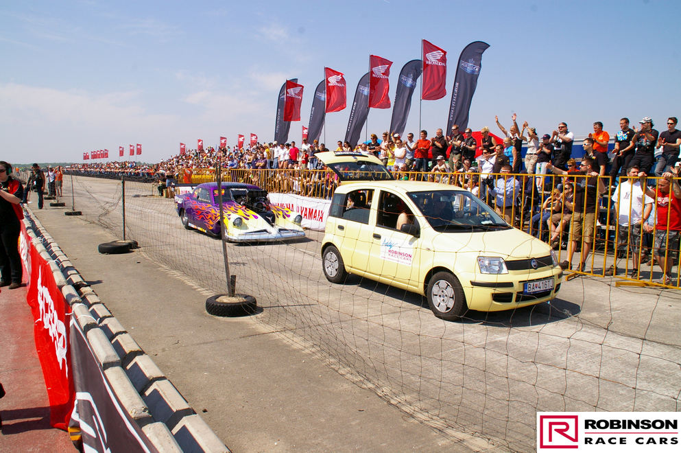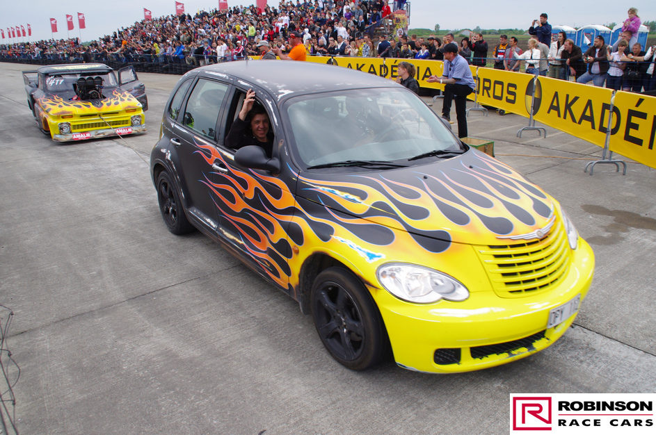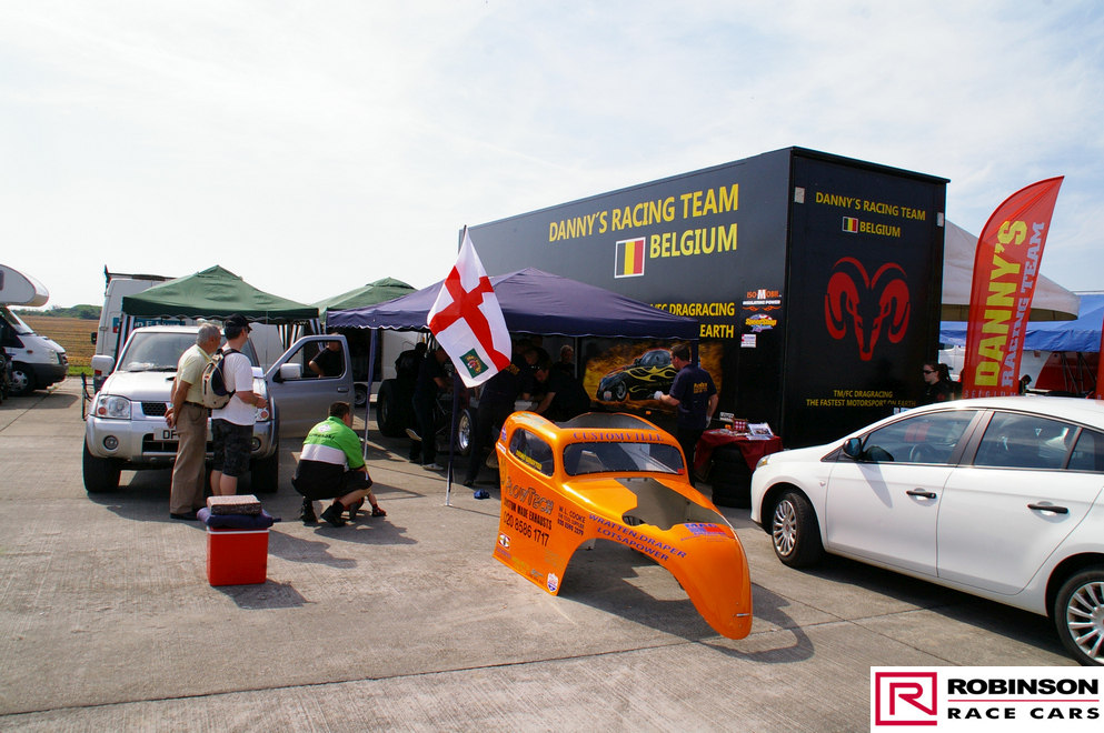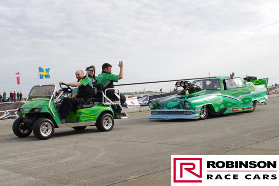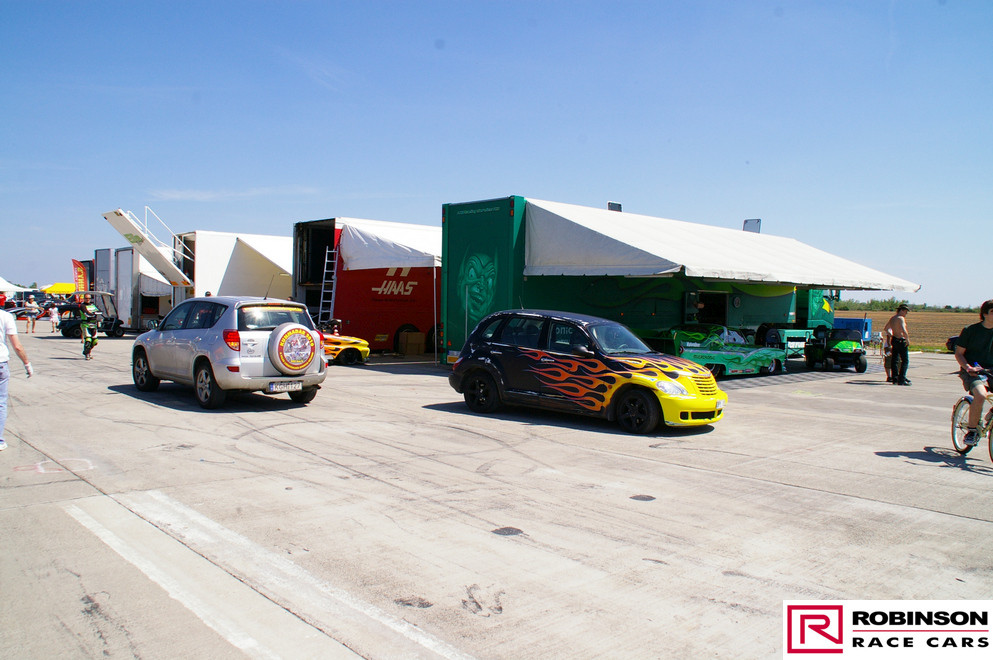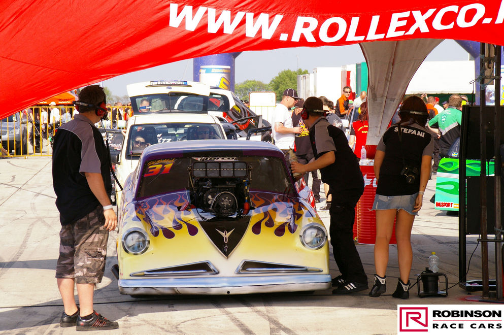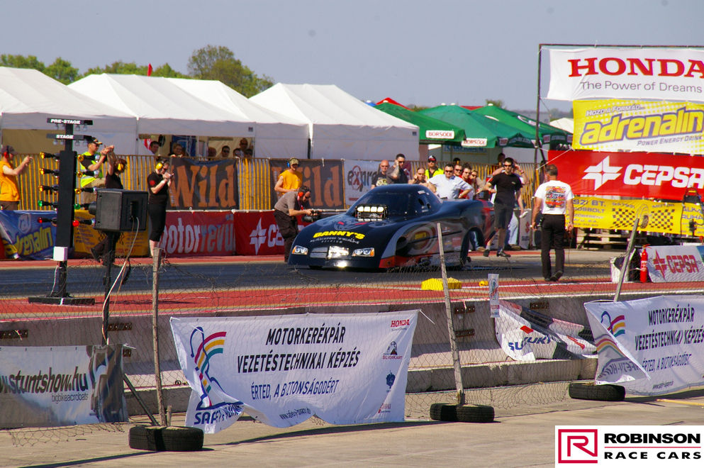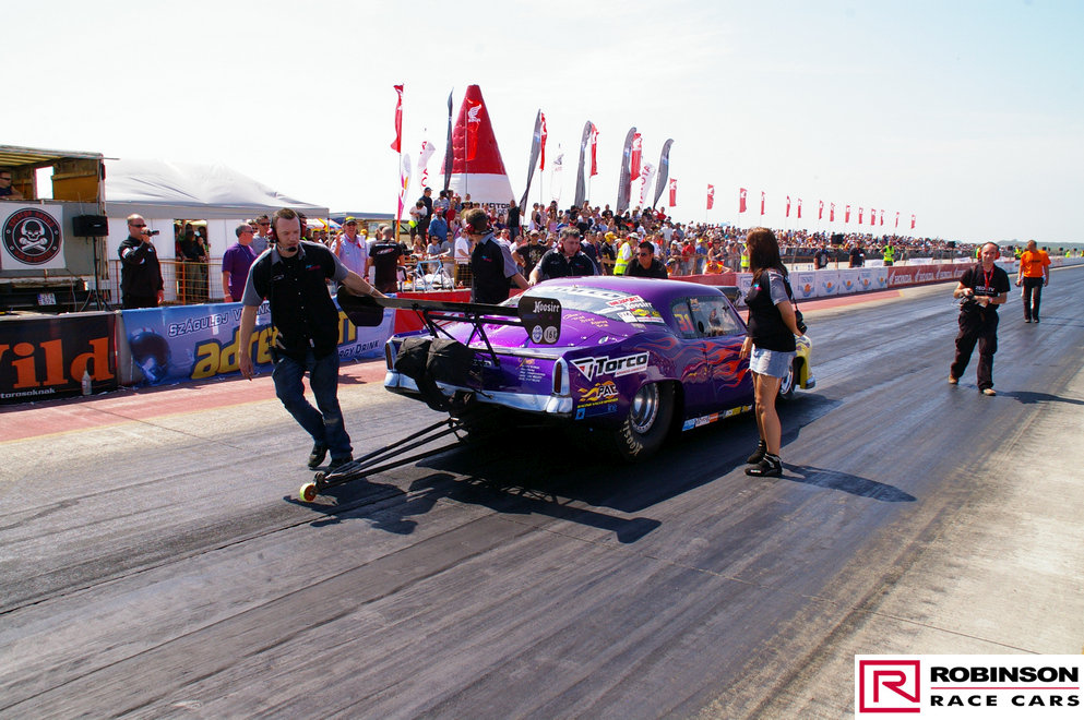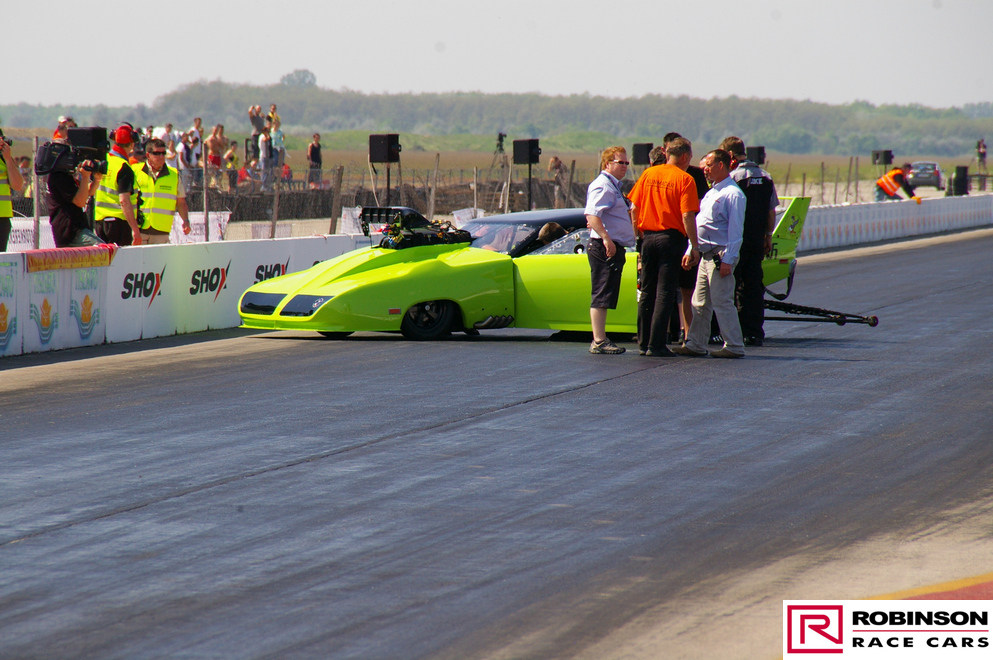 In summer of 2010 RRC and others were invited to a race meeting in Hungary to promote Drag Racing there. There was a pretty active bike scene and Kunmadaras is still in the FIM schedule but very few cars. The show included two of Rune Fjeld’s fuel cars driven by Risto Poutiainen and Jari Halinen, Danny Bellio’s methanol funny car, the Wratten Brothers Topolino altered and (stars of the show) four Pro Mods with Andy, Graham Ellis, Mats Eriksson and Freddy Fagerström.