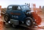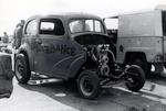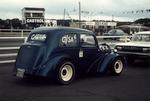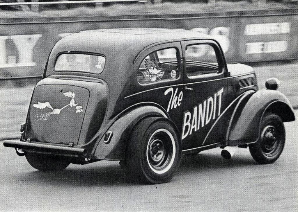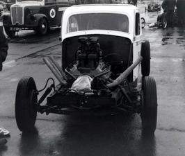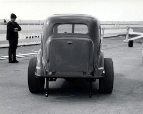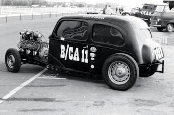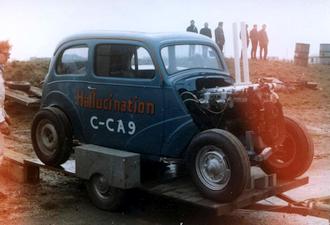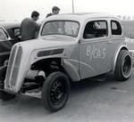 1967 saw Ed Gurney and Pete Smith at the drags with their Ford Pop known as Hushabye. They elected to be different and junked the Pop chassis, mounting the body sans front wings on a 1938 Hillman chassis and fitted a well set-back 322 Buick V8 and Mercury rear end. Front end was the original Hillman beam axle on parallel leaf springs.