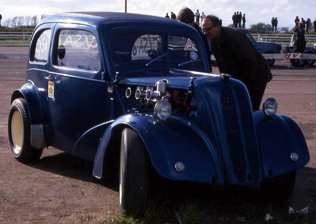 Another circuit racing Pop turned up at Santa Pod when Nick Lees towed in to Santa Pod with Mike Berman’s 1648 Ford powered Berpop at the last race of 1968 in December, and it was chilly. He returned home with the Junior Competition Eliminator title having shut down Mick Hill’s Jag powered Anglia, Bob Fisher’s Ford Falcon and Mike Bennion’s 292 Ford powered Morris Minor in the final with a 15.23/90mph to 15.64/92mph. You can see Berbop and Good Vibrations in this Youtube video. Russ Ward built and ran a Street Altered 3.4 Jag powered Pop which sat low on an Austin chassis. It was street legal and Russ ran it at the Drags during 1969 and 1970.