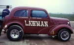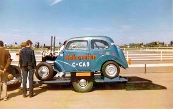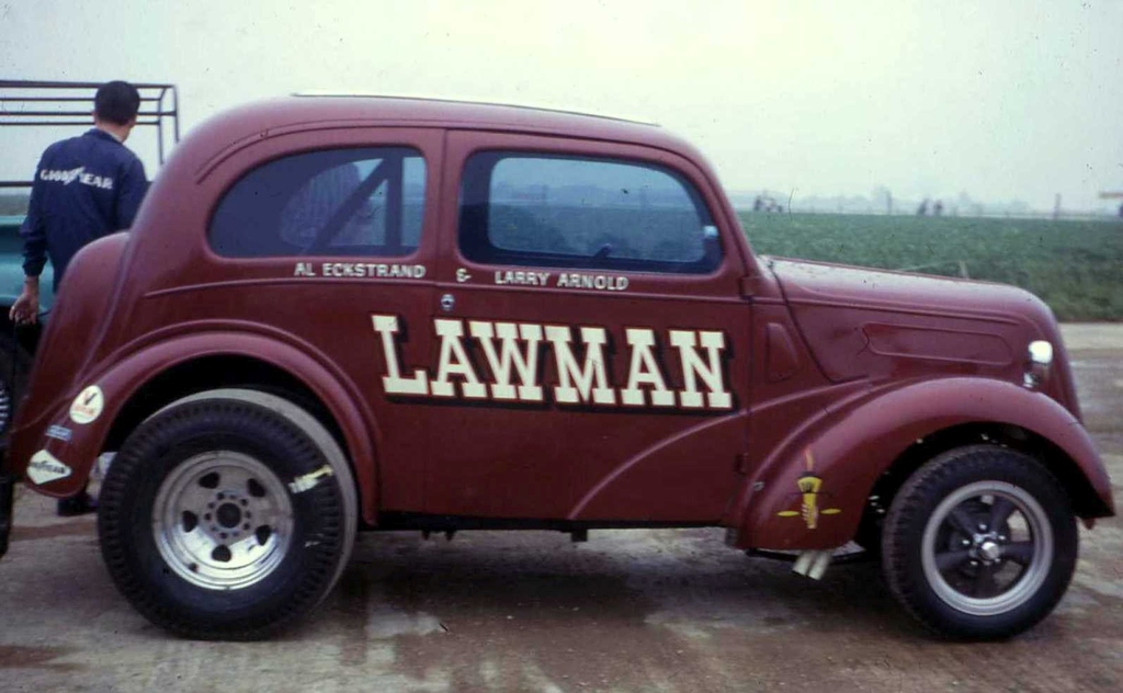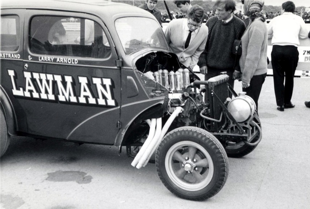 Anglia fans were in for a treat in 1966 when Larry Arnold showed us how it was done bringing over the Lawman Anglia to Santa Pod as part of the US Masters Commando Drag Racing Team. Powered by an injected 327 Chevy it ran several wheelstanding 10 second passes and looked good too in Candy apple red paint with blue plexiglass windows. It had Mag wheels up front, chrome wheels with huge M&H slicks protruding out the rear wings and made good use of the wheelie bars out back.