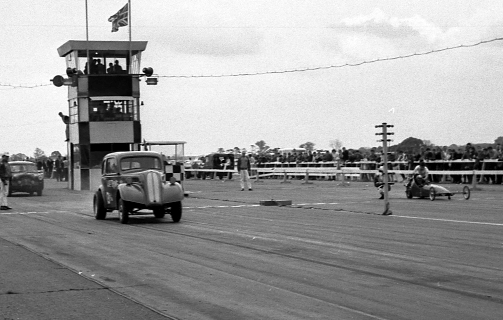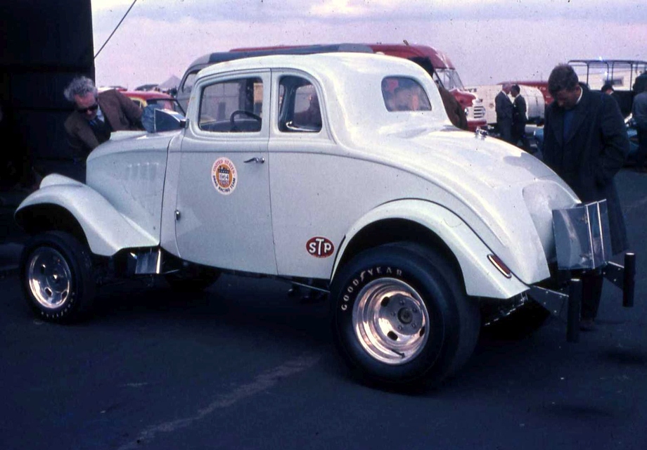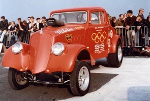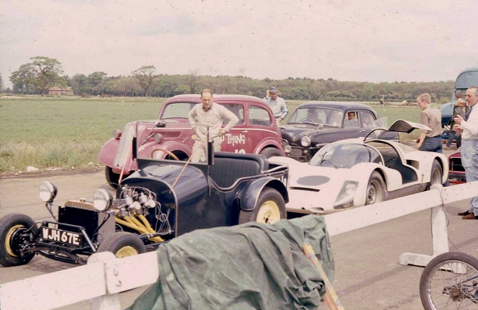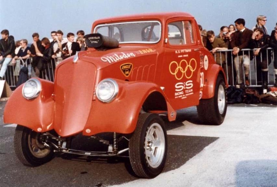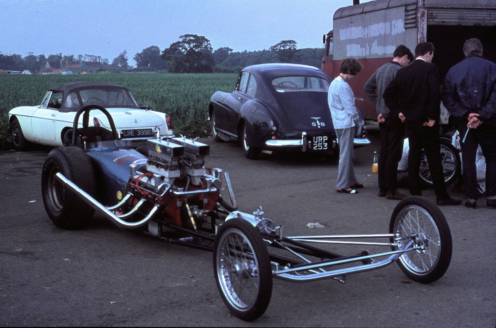 We often saw American cars in the area of South Ruislip where there was a USAF airbase. I believe the service personnel were allowed to have their own vehicles brought over to the UK while serving here. When they returned home a lot of vehicles were left behind and stored in a car park on the base at Victoria Road. It was out of bounds to us enthusiasts and sadly the cars, left out in all weathers became derelict. I remember seeing an almighty Edsel sitting there parked up and being extremely jealous of it. Several of the local newsagents stocked Hot Rod magazine, I think as a result of the US service personnel being there. This was my first exposure to hot rodding and I picked up the occasional copy in 1959/1960. I left school in 1962 age 16 starting an apprenticeship at EMI in Hayes using a motor scooter to commute. My best friend from school was Bob Venison and we were both interested in cars. We saw the Dragsters in Hot Rod which fired our enthusiasm. I didn’t know much about Drag Racing until I saw them in the magazine and loved the fanatical detailing on them which really captured my enthusiasm for the subject. Then in 1964 the International Drag Festival came to Blackbushe for the first of six rounds including Don Garlits and Tommy Ivo with their Top Fuel Dragsters along with other cars in different classes making up the US team. Bob and I went to Blackbushe for the first event and we were both blown away by what we saw. What totally captured our attention were the Willys Coupes of George Montgomery and K S Pitman.