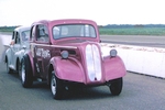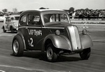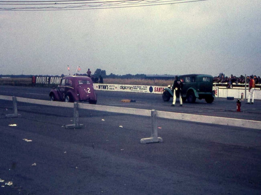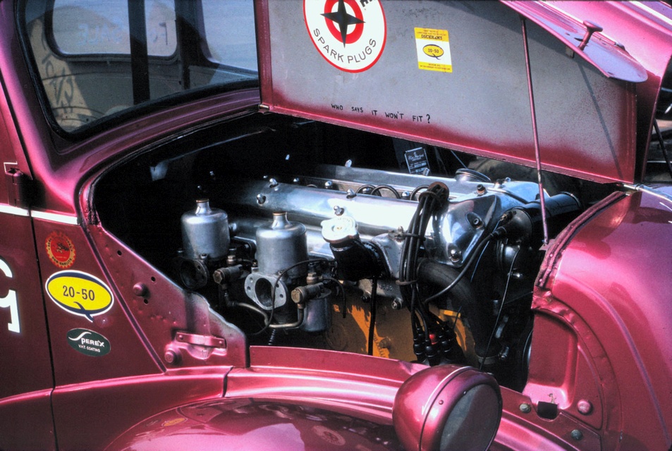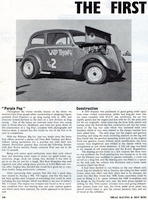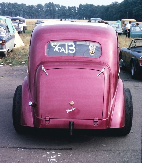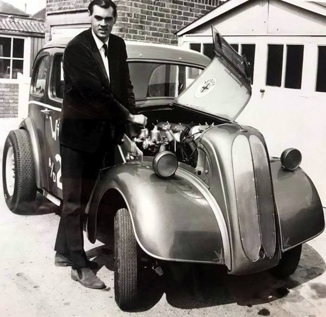 We could relate to these more than the all-out Dragsters and saw many features in Hot Rod Magazine on what the Americans called Gas Coupes. They were often based on ‘sit up and beg’ Ford Anglias which we knew better in this country as the Ford Popular. So, we decided we could do a home brewed version of an American Gas Coupe, even though I hadn't yet passed my driving test. There was no class for Gassers in the UK so we would be classed as an Altered. We had the raw material as Ford Populars were cheap and fairly easy to find. Bob got hold of a 1955 Ford Popular locally which cost £5 and then sold the engine and gearbox for £5! Not being well heeled enough to afford an American V8, we settled on a Jaguar straight six engine. We were friendly with a couple of guys who raced F1 stock cars at Edgware and one of them got hold of a MK 7 Jaguar, which we broke up keeping the 3.4 litre engine, gearbox, rear axle and any other useful parts. We started out with the stock 3.4 litre engine but later added a ported C-type head and high lift cams. We also upgraded the SU carburettors from 1 3/4 inch to 2 inch venturi size. We started construction in late 1964 or early 1965. We gutted out the car and I was interested in learning how to weld, so I brought some acetylene gas bottles and welding equipment. We did all the chassis modifications and alterations ourselves, building the car in a single garage at my parent’s house in Malvern Avenue, South Harrow. Still living at home made it easy to work on the car at any time. Neither of us had any connection with the motor trade. I was an electronics engineer and Bob worked in the printing trade. At first my dad was totally against it, he thought we were mad, risking our lives which could only end in disaster, but he quietly knuckled down and contributed to it helping us with the build and he also sprayed the metallic Royal Purple colour getting the paint from Trimite Paint in Uxbridge. We were quite naive at the time and used articles in Hot Rod for reference, copying what we saw. Not having the knowledge to engineer the rear suspension we mounted the Jag axle solidly to the chassis. This was technically illegal according to the RAC rules which said all cars had to have full suspension and four-wheel brakes. An example was the Allard dragster which was built with front brakes but was given dispensation as a dragster to run without rear suspension. We fitted front brakes from a Ford 100E, again copying an example from an American magazine, but not long after the rule was dropped so we took them off. Rear brakes were stock Jag drums which we later replaced with smaller drums from an Armstrong Siddeley which used the same Sailsbury axle as the Jaguar. This was so we could replace the 16-inch wheels with 15-inch fitted with Goodyear Blue Streak 'Stock car specials' ex-NASCAR tyres.