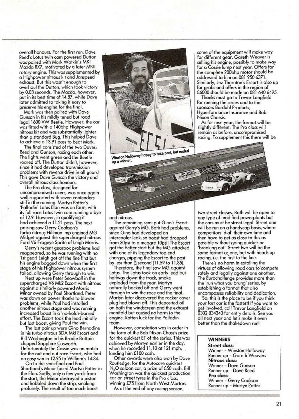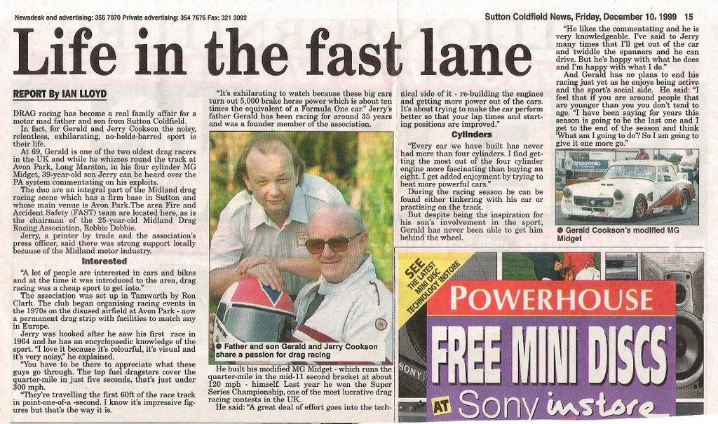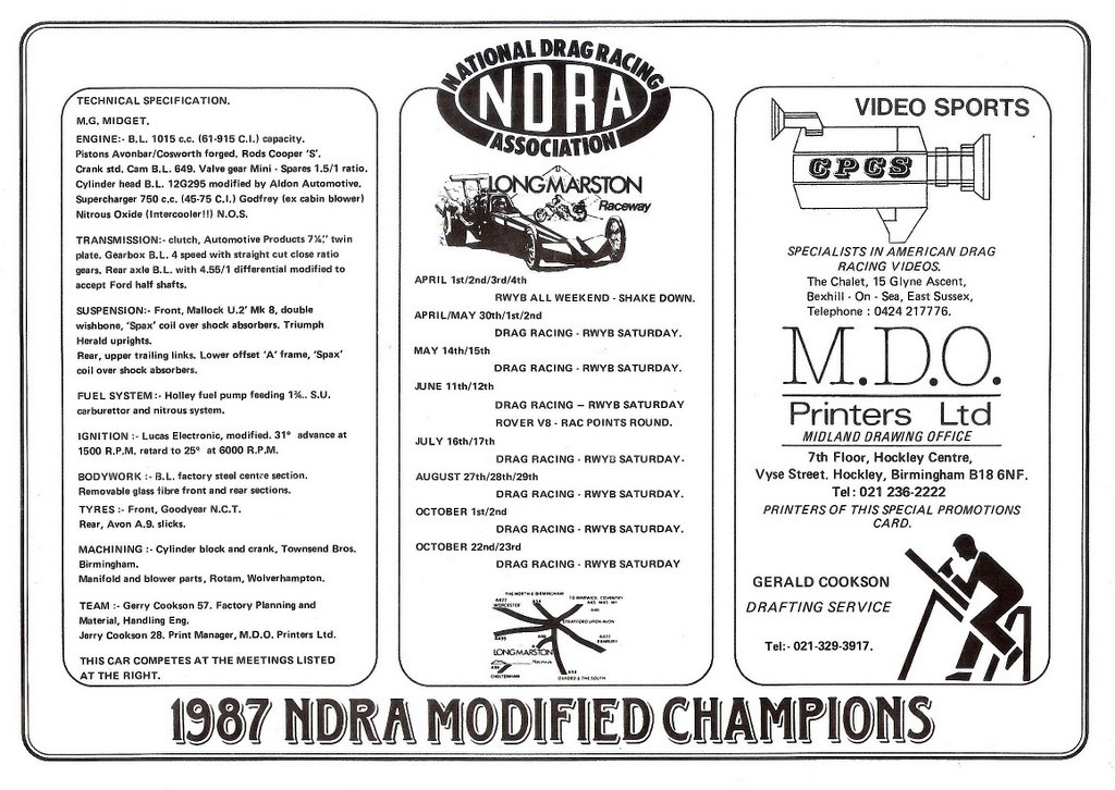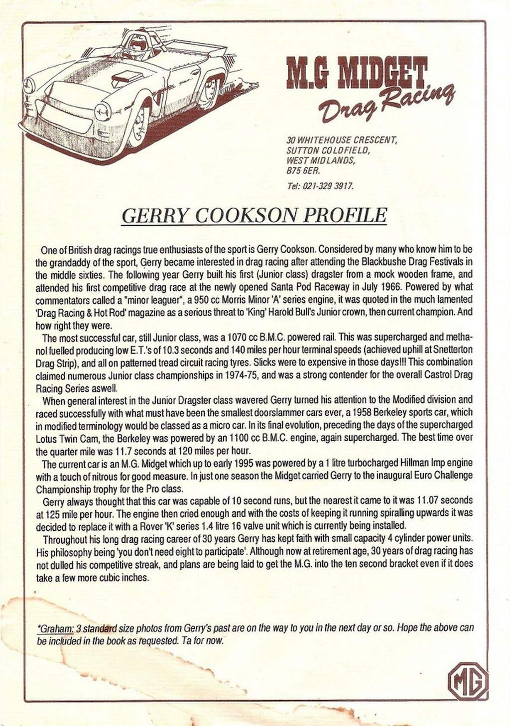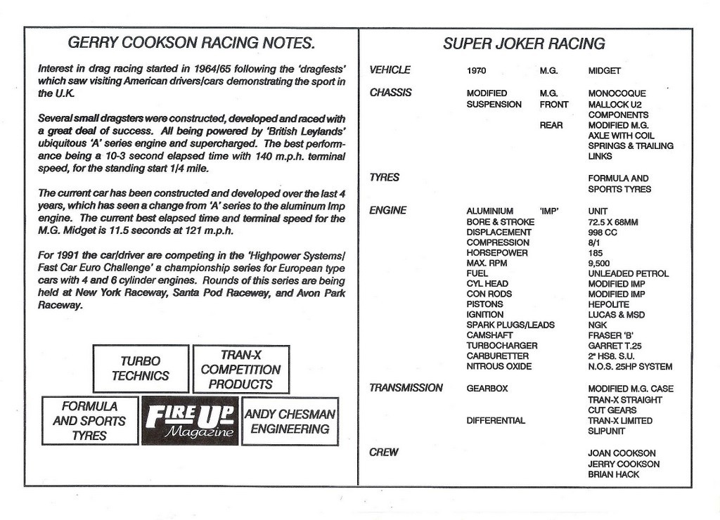 John Hunt mentioned how he had come to discover through doing these interviews that in the case of those who ran dragsters nearly everyone's wife was the only team member, whereas with the Competition Altereds there were 2 to 4 crew members to a team. Gerry replied... my wife never missed a meeting, she provided all the food, was a gofer, back up lady, you name it she did it. Jerry continued... I think also it was the social side for her, all the wives and girlfriends got together while the racing was happening. I think that’s why the dragster side of it was more of a close-knit family and they all really helped each other out. There was almost an equal split between the dragster drivers who ran BMC and Ford engines. Also there were 4 or 5 competitive Drag Karts which most likely came from Sprinting. The jokers of the pack then were Ken Penfold and his son Derek. There was also Brian Parkins, Peter Gayton, Bob Harman who went onto drive the Lolitre rear engined dragster. He also took over Watford Motor Accessories from Pete Atkins. At one time mum didn’t want to drive anymore, I didn’t drive at the time, so a few of the NDRC marshals would help out. John Fordham, former NDRC start line marshal from 1973 to ’74, was always there to help out as did Big Pete and a guy called Bomber. That’s why we raced more at the NDRC meetings than Santa Pod as we had struck up a great friendship with these guys as well as Alan Wigmore, Chris Ulwin, June Nokes and Cliff Jones. One time back in the mid-sixties on the A45 going to a meeting in the pouring rain the mudguard blew off the crudely built trailer, it was just a piece of aluminium bent to shape over the wheel and just bolted on. Right at the beginning we had a puncture on the trailer and no spare. Fortunately, someone unknown to us just happened to be following us from Santa Pod, drove into Wellingborough, found a scrapyard and got another tyre for us. We were stopped many times by the police, just wanting to take a look at the dragster! Back in the early days we used to drive our push cars up and down the strip to dry out the track after it had rained. We were going up and down at one meeting in our HA Viva and the sweeper hit our car. We were due to go on holiday only a few days later. John Bennett of Santa Pod offered to help out and took our car to FGR to be repaired and lent us a Triumph Herald so we could go on holiday but it wouldn’t run any faster than 40mph. We’ve been to several shows, the Town & Country Festival at Stoneleigh two or three times with the Berkeley. We were on the Banbury Drag Racing and Hot Rod Association stand, doing a burnout on one of the inner roads there. Birmingham’s Bingley Hall, NEC MG show with the Midget alongside a Frog eyed Sprite with a V8 engine. Trevor Langfield put together a Euro car challenge, the Four Port Challenge and we won that. Gerald continued... I’ve enjoyed my time drag racing, when it was much more for the amateur than it is today. I’m pleased with my time being involved. Not just drag racing but anything to do with wheels including my very early days cycle racing, my bike’s hanging up in the garage still and did a couple of Auto Test’s in a field. There I hit a tree stump whipping the sump of the family Herald at Shenstone, Litchfield when I was in the Lucas Car Club. Of course, the biggest accolade to my career in the sport is the family name being inducted into the British Drag Racing Hall of Fame in 2018. It also sits alongside the year I won the ‘Don Garlits Spirit of Drag Racing Shield’ presented by the Wild Bunch in the 2000s along with many other distinguished Life Time Achievement awards. There was also one presented on the start line at Santa Pod in the late 80s or early 90s but we can’t remember when that was so if anyone knows please let us know! John Hunt did this video in Gerry's garage where his Berkeley and MG Midget still sit along with a few bits from the slingshot (look out for the flying watering can!) Click here Gallery: click on any thumbnail for a large image. Back to pioneers index Back to News page  |