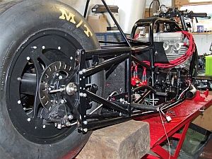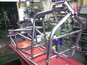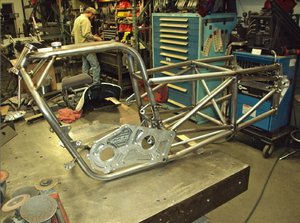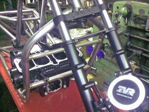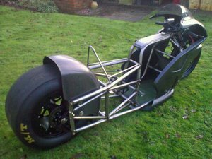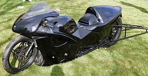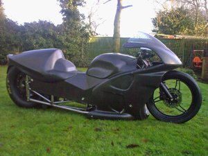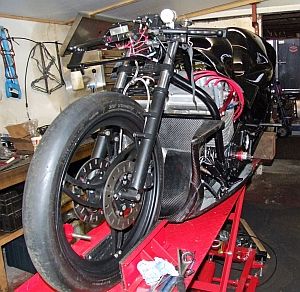 My super crew of Ric and Tom arrived for the weekend early in January to start to get the build underway. The frame was bare metal and needed a lot of brackets fabricating, so fellow Pro Stock racer Jerry Collier brought his welding gear as well. The guys worked very long hours for three full days, starting early and finishing close to midnight. Jerry did a fantastic job of fabricating all the seat rails, brackets and other bits and pieces, even including parts like gear levers. It all looked a million dollars when Jerry had finished, great fabrication and very neat welding. I would recommend his work to anyone! On Monday I took the frame up for powder coating. After talking with Dom at TVR Power we decided to go for the black 'stealth' look, so the frame and all the chassis parts and wheels got the black powder coat treatment. The bike was also treated to a new carbon fibre body kit as well. The final touch will be a new paint job in TVR Power colours.