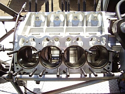 So we got back to the pits and were all quite upbeat that we had qualified in the quickest TMD field ever, although I explained there was quite a pop during the run and the engine just died, so the team removed the plugs and rather than just windmill it with the starter we turned it over by hand, and our worst fears were confirmed: the motor was seized solid. Off with the diaper and a quick look around the block and pan and sure enough there was a ding in the block, but at least no windows. Well, during the tear down, the pile of broken parts just kept getting bigger, it would seem that the wrist pin in number six cylinder had broken and parts of the rod and piston were everywhere. The look on our bottom end guy James' face when he dropped the sump with its pile of bits in it was quite a picture. Usually James diligently goes through the hot oil in the sump and brings us the odd slither of bearing or whatever for us to diagnose, but this time the pan was just full of broken bits. Whilst this was a disaster for us, we were in fact quite lucky; what was left of number six piston had stuck up in the bore and the rod stayed pretty much intact from the wrist pin down and just damaged the liner as it went up and down after the break rather than coming out the sump or block. Also parts of piston got up to the cam and stopped that turning which obviously stopped the mags and killed the engine which was just as well or it could have been much worse. Later that night the pile of bits included: