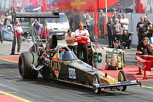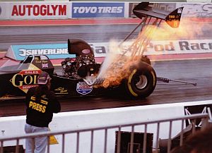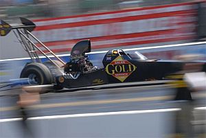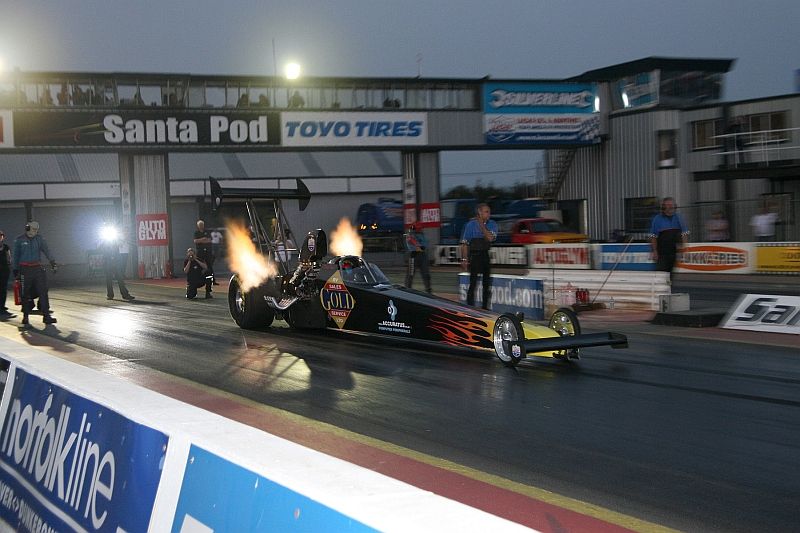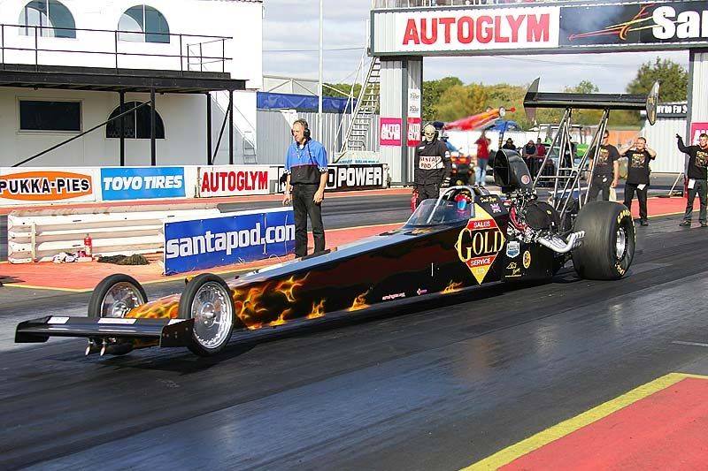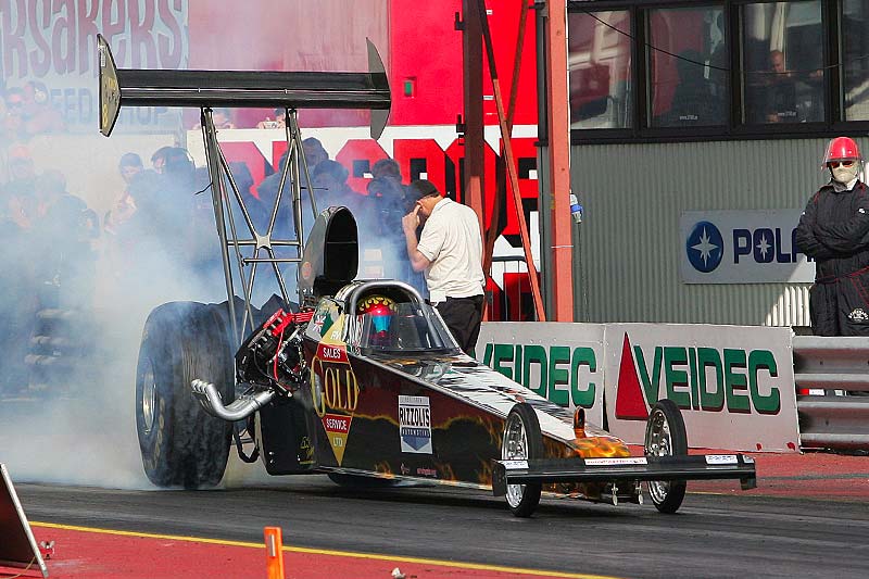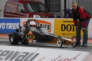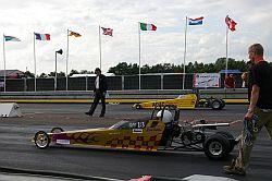 Wow, what a weekend that was, with my crew chief away and the Americans gone home, it was really neat to put on a good show. Not only did we achieve number one qualifier again, but I also think we achieved the quickest run ever in an A/Fuel Dragster in Europe to date. Special thanks have to go to my stand-in crew chief Vladimir as well as our Dutch contingent, Jaap and Jan Selles who helped us out brilliantly for this event. As usual, a huge well done to the rest of the Go Gold Crew who took on board everything we were taught and were absolutely brilliant. Thank you to John Foster, who has been our clutch-man-in-waiting, as we ran a torque converter until this year. He has been like the proverbial pig in you-know-what since he has had a clutch to play with; absolutely black as the ace of spades with clutch dust apart from the huge white grin on his face after each and every run. Thanks also to his wife Sarah who was assistant crew chief. Well done to Mole, our bottom end guy who was rather busy, and new team member James who fitted right in and was blown away by his first ever drag race meeting. Thanks also to the light of my life Fiona who looked after everyone, and thanks to Bob Glassup who was a star again. The weekend was not without its trials and tribulations though; we missed the first qualifier due to a timing sensor failure on number one mag, but with a replacement kindly loaned to us by John Spuffard we were soon ready for the next round. I must say I was a little nervous for this event as my business partner, co-sponsor and usual crew Chief Gary Jenkins was not with us after booking a holiday to join one of the biggest Harley rallies in Europe when we had lost our ride earlier in the year. Gary is the man that usually leads the team as well as strapping me in, so it was down to my good friend Jaap to strap me in, and, as soon as the car was fired up, the nerves disappeared. The Turners had put down a rather stout 5.47 in the first qualifying session that we missed but we had tuned up our car a little from our last run at the Euro Finals and were hoping for a bit better. The car sounded great once we switched it over to nitro, a bit angrier than before due to the extra fuel we were now giving it. The burnout was all good and as we were on a solo run we could stage at our own pace. Once I hit the throttle the car launched real nice and all was going well until about 2.5 seconds into the run when I felt it shake quite badly. The back stepped out a little and I had to correct it but kept my foot in until the line and although we had dropped cylinders again at the top end I got the screams on the radio, 5.47, but it was not till we got back to the pits did we know that our 5.47 with a 2 beat the Turners 5.47. The Turners are a great team and good friends too and they were soon in our pit congratulating us on the run and the team's best run ever, this is something I really like about this class, whilst we are competitors a good run is always appreciated by the other teams. The dropped cylinders had caused some bearing damage on the opposite side due to the fact the engine was imbalanced and they were working harder. It was quite a team thrash to get us out for the next round of qualifying, but we just missed the call, which was a bit disappointing as we wanted to show off those bunny ears again as dusk had fallen. We fully serviced the car that evening, stripping the engine right down and rebuilt it just to make sure it was all ok and as it turns out it was just as well, as we had some minor damage to a main bearing that we had missed in the earlier thrash. In the morning we warmed up and whilst doing our usual pre race checks we found a missing screw from the injector. We could replace the screw easy enough, but where the hell had it gone in the engine? So, we missed that qualifying session too and played hunt the screw, but after further investigation we believed the screw was already missing and had not been there for a while. So straight in to eliminations and we were to run against Steph Milam in the Funny Car. I knew a 5.60 would be enough, so tuned it accordingly and went for the round win rather than backing up the MSA record breaking run we had done yesterday and would try and back that up in the final providing we made it through. Which I am pleased to say we did, although on that run, we dropped cylinders early which is not like our car and after the run we found out why. Two adjusters were damaged due to a lash cap coming off as well as a push rod jumping out. We had been lucky. We had to strip down the engine again and also inspect the cam just in case it was damaged as well as replace the damaged parts. With perfect timing, Andy Robinson visited our pits and he was soon stuck in re-tapping the rocker arm threads for us, thanks Andy. We were struggling to make the call and I would just like to say a huge thank you to the Turners. Not only did they lend us the replacement parts but they also agreed to run later than our allocated spot providing the race director agreed which I am pleased to say he did. Again, what sportsmanship from the Turners, rather than take the victory with a bye run that they were quite within their rights to do. They waited patiently for us be ready as they wanted to race us on the track and ensure the Top Methanol cars put on a good show for the crowd. The race director scheduled us for last pairing that would end the meet. As I said earlier, we still needed to back up our record run especially as the Turners had already bettered theirs with a 5.46 and currently held the record in their eliminations. With Sarah showing me the Kestrel 4250 that displayed how the temperature had fallen nearly ten degrees from when I set the tune up earlier and the fact I was now all strapped in, we had no option but to run with the fairly aggressive tune up in it, so we were either going to break the record, blow the tyres off or shake real bad. I could see Steve c