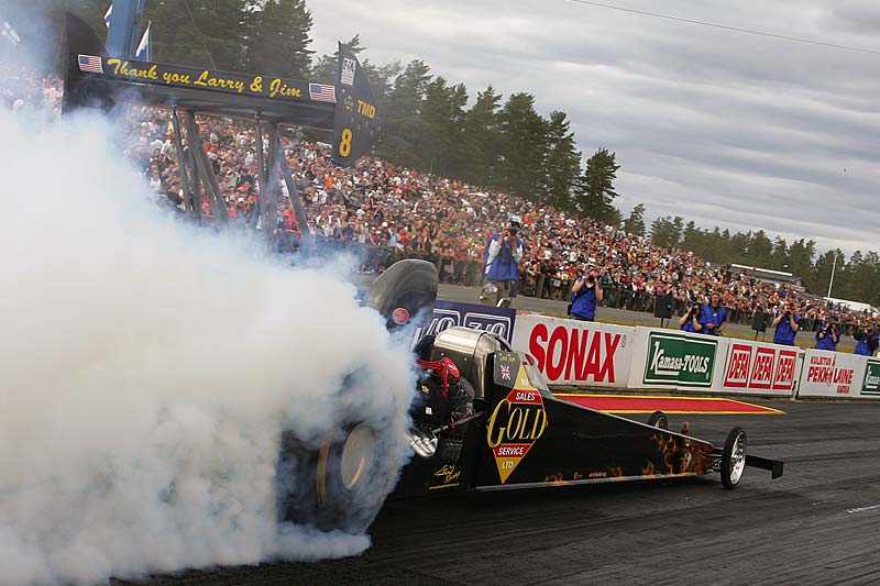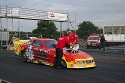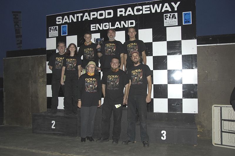 The whole team was gutted again not to qualify and after checking the data we found that the BDK valve that controls the fuel system and had been serviced the night before, and had worked perfectly on the previous run, decided it was going to stick wide open and drowned the engine on the hit causing the cylinders to go out. Aghhhh! This sport can be so frustrating sometimes, and I am sure from the outside it looked like we still had the same problems, in fact it was different parts that all caused the same problem. I would really like to thank Jim and Kay Rizzoli for coming over and helping, and whilst Jim was absolutely beside himself that we had not made the show, the team and I really appreciated all the help he gave us and I would like to say, no matter how good the tuner is, all the bits on the car have to be right for the tune ups to work and Jim was brilliant at diagnosing the problems as they arose. Personally, we learned so much dealing with all these issues under Jim's guidance that I still feel quite up beat about the future, if things had all gone perfect we would not have learned about all the little details of our fuel system etc. Also, had Jim not come over, I don't think we would have got to the bottom of the various issues we were suffering from and they could have cost us another couple of meetings before we got to the bottom of them. So the team and I have to bounce back just like last time from our DNQ and do all we can to try to win at Hockenheim, I would also like to say a huge thanks to all the Go Gold Crew - you were brilliant yet again and hopefully we will keep this roller coaster run going for just one more meeting! Pictures courtesy and ©Ivan Sansom Thursday 9th July 2009: Team Zeroes to Team Heroes. Well who would of thunk, after such bitter disappointment at the Main Event to the elation of winning our first ever FIA event and I believe the first for an A Fueler! To say the whole team is delighted is an understatement, we were all hurting really bad after the DNQ and I could tell as soon as we got to Finland there was a steely determination about the crew and even though we did not speak about it we all knew we had a point to prove and prove it we did, the team was excellent the best I have seen them, with six perfect turnarounds in two days, well done guys now we must keep this momentum going to have any chance in the championship. Special thanks have to go to Larry for coming out and helping, it was really neat to send him home so elated as I know he was absolutely gutted after the Main Event. Things did not quite start as we would have wanted with a tyre smoking launch and an idle through for an eleven second run, but personally I was quite happy as it meant the beast was back and we had obviously cured our problems of the Main Event, so all we had to do was tame the beast and we should be in the show! We ended up number five qualifier with what turned out to be our only full pass in the qualifiers due to weather and down time which meant we had to race our good friends the Turners in E1 and they would have lane choice, it was a very close race and I am pleased to say I got it on a hole-shot! However once we got back to the pits we found we had damaged a head, number six cylinder that had refused to stay lit after the launch during the Main Event obviously decided it was going to try and do all the work to make up for it, well it eat both spark plugs and damaged a valve seat and this is where the Go Gold Crew really made there point with an absolutely awesome turn around, I am so proud of you guys, this was not like the mad thrash we had at Easter, they just went about the tasks at hand as if they had been doing it for years, rather than just the two or three meetings some of them have now been with us. I have to say my crew chief and business partner Gary Jenkins was awesome orchestrating the turn around and Larry also jumped in and was soon up to his elbows in oil helping out our new bottom end guy James who was doing a grand job. Next up was Krister who was number one qualifier with an excellent 5.47 in his A Fueler, but this time we had lane choice and we managed a rather nice 5.48 to get round him, to set up a final against the TMD points leader Timo. The turnaround time was the minimum 75 minutes allowed and again the Go Gold Crew did a great job and we pulled down to the fire up road and waited for the Haberman's to show. We had lane choice again as we had just ran the fastest run in eliminations, everyone knows Timo is a bit of a demon on the tree, but not to blow my own trumpet to much I was not doing to bad myself during this meeting and although we tuned it up just a little we thought a 5.47 could probably win it as long as I was on my game. Even though I did not see him mainly due to the shroud and to be honest I was so focussed keeping it in the groove that I was not looking, but according to the timing ticket, he pulled an absolute storming 0.016 light to my 0.058 and he was ahead up until the 1000ft where I passed him, winning by just .038 of a second, awesome, you just gotta love these A fuelers they just keep pulling until you lift. The grin on my face was huge when the team came to pick me up and Timo and his team were really gracious in defeat congratulating me and the team on our first ever FIA win. Now, huge thanks have to go to the star of this show who in fact was not even with us but locked away in his spare room at home in the US, glued to his PC and phone and that star was Jim Rizzoli, due to the time difference this meant he had to stay up all night to assist us and assist us he did, before and after every run Jim was on the phone and computer analyzing every run from the data we sent him as well as keeping up to date via Eurodragster with who ran what where and when, it was like NASCAR where they have a spotter telling you what the other teams were all doing. Obviously this help and support is a magnificent advantage for us an