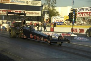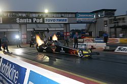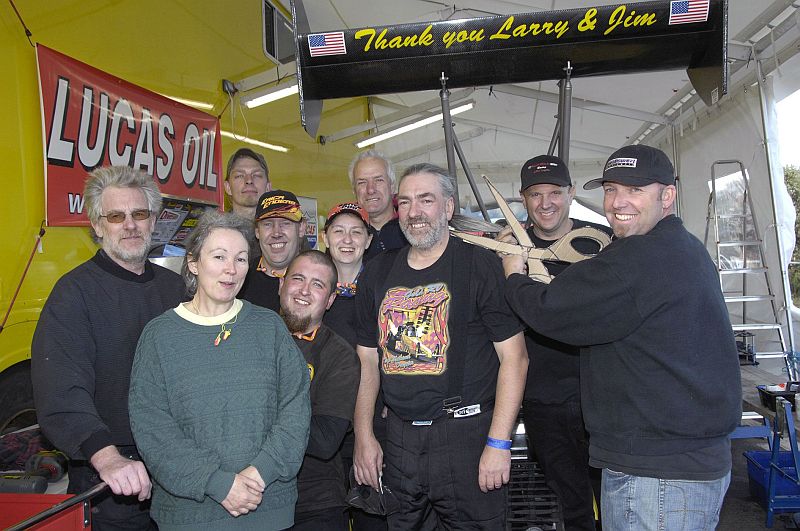 Thursday 3rd December 2009: Back to reality! Well I am finally back in the swing of things at home and work; it has taken me forever to get over my jet lag, waking up at all sorts of times during the night, feeling like I wanted dinner in the morning etc. etc. I think it is because we spent so long living the dream, my body did not want to adjust and just wanted to go back to the sunshine and the racing. What an experience that was and I would firstly like to really thank Larry Miersch for the opportunity to drive his car and huge thanks to Jim Rizzoli and the rest of the team, Charlie, Victor, Lefty, James Day, James Blackman, John & Sarah Foster, Roy & Diane Miersch, Kay Rizzoli and of course Fiona. I cannot thank all of you enough; you made me feel like part of the family and you all worked tirelessly to improve the car and get it ready and safe for each and every run. I must say I knew from the start that the car was not yet as competitive as Larry and Jim had hoped but by the end, we were definitely one of the most improved cars over the three meetings, knocking over 3 tenths off the cars previous bests and the two runs where we ran 5.30s we were still dropping cylinders, so we all know there is more to come! So well done one and all, it was just awesome! I was just so disappointed that I let the team down with my first cherry since running TMD/TAD, sorry guys I guess I was just trying too hard. It was a real shame as it looked like we had the better of our opponent in that round and I know if Jim and Larry were given more runs, the car would have continued to improve. I was in and out of the car several times over two days for the first round at Pomona as we were bumped the night before due to an accident, and then again during the next day and in the end we were waiting late the next night for what seemed like forever before we ran. It was getting later and later, darker and darker as well as cooler and cooler, it even looked like we may not even run due to curfew as the last Fuel qualifying session seemed to last hours. It was really neat though being in the pairing lanes with all of the Team Force cars, Dixon, Schumaker, etc. etc. not to mention the other Europeans in Top Fuel, it was really something. I could see Jim & Larry pacing up and down the track during hold ups checking and re checking track and weather conditions and Jim had changed the tune up several times during the delays. Finally the last pairs of fuel cars were pulled round and it was then that NHRA confirmed they had bought an extension and we would indeed be running. It was so dark now that I was strapped in under torch - oh sorry, flashlight and my visor was steaming up as it was now so cold. Just as I was waiting to be pulled through to the start line Jim said the track was still in great shape and we were going to go for it, he also said I don’t care what Larry has said, give me a good burnout as the tyres were so cold, you don’t have to tell me that twice, I love burnouts and that is something I miss from the blower days as normally in the A Fueler we keep them quite short. The team lined me up just behind the burn out box and I could see down track and unlike Vegas it looked really dark down there, and for those of you that don’t know Pomona, it is one of the shortest tracks on the NHRA tour. The adrenaline was pumping but I felt good, finally after 26 hours I was going to run my first real race in the USA, we fired up all OK and then I got the message to pull through the water and do the burnout. Well, I gave it some and I zoomed past where John was standing still high up on the tyres and figured he would have to run to catch me up to guide me back. Once I got it stopped and found reverse, John was soon there and he gave me the T sign, which always made us laugh, as in the USA a T sign normally means time out and we had joked that the crowd must think what are those Brits doing? stopping for tea, but for us it was actually a reminder for me to trim back the fuel pressure after the burnout. I looked down at the fuel pressure gauge but it was so dark I could not see a thing, so rather than over trim it and possibly kill the engine, I decided to go back as it was. John Foster is my clutch man from the UK and was living his dream too, his face was a picture grinning from ear to ear as he guided me back, it was neat to see him so pleased to be there too, once back the team went about their tasks preparing me to go into stage and one of the things that always made me smile was Victor, he is responsible for the bottom end but on the start line, just before I go into stage he pulls off the burnout limiter and shows it to me. It always amused me as from my perspective with the shroud and HANS on I can only really see straight ahead, but out of no where pops up this little Mexican face with a grin wider than Johns and he waggles the stop in front of my visor and then disappears just as quick as he appeared, I could not help thinking of Speedy Gonzales every time he did it, anyway I get the final signal from Jim that all was OK and then Larry called me forward to go into stage, OK, stake the brake several times to pump up the brake pressure, ease it forward nice and slow, just before I reach the beams Larry stops me and points at me to say OK it’s all yours. He acts out taking a couple of deep breaths which I did then bump it into pre stage and wait for my opponent, his light comes on, so hard on the brake, put it on the high side and nudge it in, wait for his lights, then I swear I saw orange and hit it but with a .123 red. I must have reacted to something else, a photographer flash or I purely had a brain fart and I nailed it. The car launched better than it had before and I was concentrating so hard on keeping it in the groove, which is something I have noticed is one of the big differences between our tracks and that of the USA, the grooves there were very narrow, also Jim had deliberately lined me a lit
