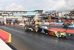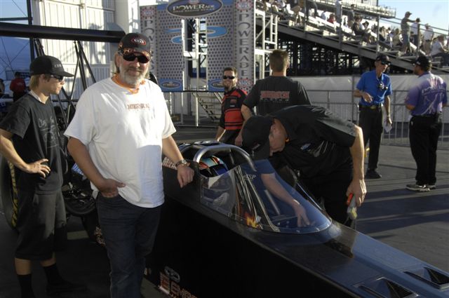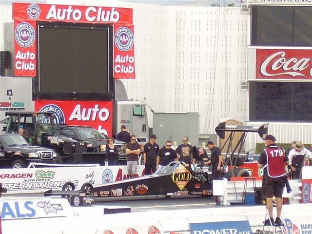 Jim was going to be pretty busy this weekend as he was helping Larry with his new car, assisting the Nivers with their A/Fueller as well as running son Kyle who would be pulling double duties with the Stock Eliminator and Comp Eliminator cars. We set up Kyle's cars, the stocker was ready to go but we had to move the dash back to fit Kyle again, and the rear end gearing was also changed to suit Pomona. Next day, once Larry arrived, we could get big brother out of the trailer and get it ready for its debut and fire it up for the first time. Larry's car, which is a brand new 300 inch Spitzer chassis, is absolutely stunning. The attention to detail of both Spitzer Race Cars and then Larry, who had virtually put it together single handed from the bare chassis supplied, really showed. There were a few subtle differences to our chassis and setup but overall it looked just like ours. The combination had not yet been weighed since it was built, so after dressing it all up, we towed it down to the weigh bridge, there was much interest in the new car and as Larry checked the weights, wing angles etc. the scrutineers checked it out and seemed pretty impressed with it and said it was probably a contender for best engineered car at the event. The car with Larry was under weight for the combination and we would have to add quite a bit, although there was no fuel in any of the fuel lines or tank which normally would equate to at least a couple of gallons or 18lbs even after the run. We got back to the pit and the rest of Larry's team had now got there, and it was finally time to fire up. Obviously the car had developed quite a bit of interest and once people heard Larry getting oil pressure it seemed like everyone and his dog was watching including most of Del Worsham's team who had all seen it or had helped a little in putting it together at Del's workshop, no pressure then! The car fired up for the very first time on methanol, and was quickly shut down for some adjustments and then fired up again and the timing adjusted, it was now running nice. The grins on everyone's faces was a picture. Unfortunately time had cracked on and by the time we had fuelled it with nitro and primed the systems we were about to fire it up again and put it on to nitro but the curfew was upon us and the pit marshals were busy shutting teams down and advising no more fire ups till tomorrow. We would all have to wait to see if ran OK on nitro, which must have been so frustrating for Larry, for those that don't know the Methanol uses it own separate gravity fed fuel system, which obviously meant that none of the nitro fuel system, pump etc. had been tested. I checked out of Jims RV and left for my hotel and then it was off to Ontario Airport to collect my team mates John and Sarah Foster who were flying in to the US after having to go back to work for a week after the Vegas Nationals as they did not have enough holiday leave to stay the duration. Talk about keen, just about get over jet lag and it was time to go back again, goes to show what drag racing means to these two and I am so lucky to have them on the team. We got to Pomona bright and early Thursday with TAD qualifying due to start at 12:00. Larry did not have much time to set the car up, suffice to say Larry had done a great job in putting it all together and it fired up just fine on nitro, so the team then went about setting the car up for its first pass. I had to add the additional weight required to the car and John got stuck in helping out where he could and he was loving it, "A dream come true, working on a car at Pomona, it does not get better than this" he said later. Well it did get better, as both John and I managed to get signed on as crew and we would be allowed on the start line, which we were both very excited about. The 30 minute call came and Larry's pit was frantic, especially as he was to be in the first pairing. I kept out the way and let his team do what they do, and then followed them to the pairing lanes. It was neat to be amongst so many A Fuellers, BADs and TMFCs . After Larry was all strapped in and ready to go, I shook his hand and wished him all the best and made my way to the start line. The car was pushed into position and given the go ahead to fire up. It burst into life and was soon switched to nitro, I love the cackle these cars make once on nitro, especially when you let the clutch out and the motor gets a little bit of load as it moves forward. Jim gave the go ahead for the burnout and the car jumped up and smoked the tires instantly, Larry backed it up and with all the pre stage checks done, he was called into stage. Now personally, I would have liked to have done a check out pass before nailing my new car, but not Larry, such was his confidence in Mike Spitzer and the chassis he builds. He just floored it! The car seemed just a little lazy from the line but soon picked up and was nice and straight, but holes out by half track, still a nice 6.1 at nearly 200 mph straight out the box. I stuck around to watch the rest of the qualifying and see how the Nivers got on. Unfortunately the tire smoking was still plaguing them, as well as ex-pat Manners. This was my first chance to see Bill Reichert run who had already won the Championship again and has run the fastest and quickest runs ever in TAD. I showed more than a little interest in this car as he is Dave Wilson's Guru as Dave has purchased a Reichert tune up and Bill seems to be helping Dave like Jim and Larry help me. He ran a 5.34, dropping cylinders at the top end but at a massive 273 mph, WOW! It was great to see the Force A Fuellers doing better after both DNQ'd at Vegas with Courtney grabbing number one qualifier with a 5.28/263 and Brittany number six after the first session. Once I got back to the pits, the service was nearly complete and all seemed OK, but Jim and Larry spotted that the BDK valve which controls the fuel had stuck, and that is why the holes went out. That seemed 
