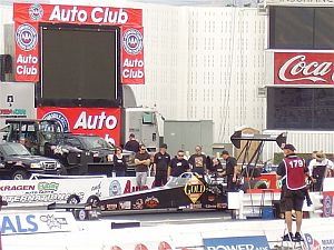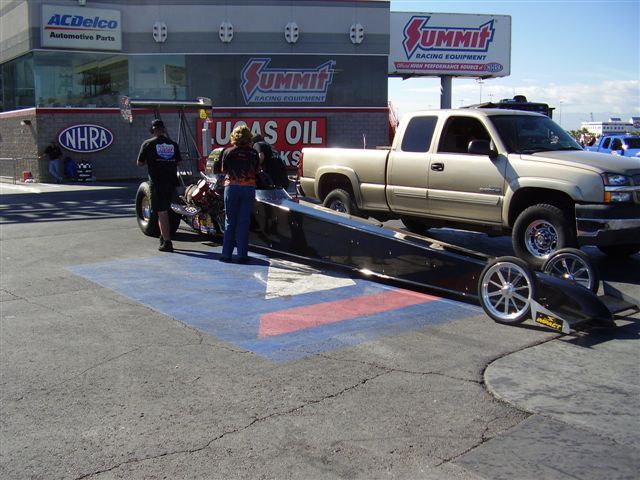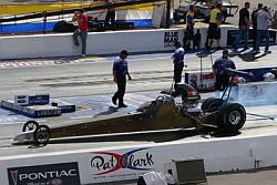 Wednesday 31st December 2008: Three Great Weekends of Racing: Part 2, Vegas Divisional. With the Vegas Nationals finished, Jim and I had a few days to kill before he had to get the Comp car and the Stocker ready for the Divisional, so we decided a trip to the casinos was in order. We packed up his RV and made our way to Circus Circus Casino as they have an RV park. We had a great evening including one of the best steaks I have ever had. During the night we heard from Larry and things were not going quite to plan with his car build, so we checked out early the next day and hired a car and it was off to Del Worsham's workshop in LA where Larry was putting his car together. Del and Larry go way back when they both used to race the BMX tour. I hired a cheap shoe box, but it would not start so they gave me a Dodge Charger - nice! I really enjoyed the drive across the desert and we got to LA around lunch time, then worked all afternoon, most of the evening as well as most of the next day helping Larry put his car together. All the big stuff was done but there was plumbing and wiring still to do as well as a few brackets. The main fuel pipe had to be finished as well as the air systems. We helped for as long as Jim dared, as we had to head back across the desert to Vegas to meet Jim's wife Kay who was due to fly in around 4pm. Well all I can say is Kay is a true star and had already planned for the fact that Jim and I would no doubt be late, and we were - by about three hours! Kay said she would meet up with us at New York, New York Casino once we finally got there. We had another great night out and a meal and it was neat to meet up with Kay again, then it was back to the track. Thursday morning, and things were already building up for the Divisional and for me it was neat to see the the Alcohol Pits building up. I think there were some 19 dragsters and 24 funny cars going for eight car fields - amazing! Late Thursday night, we heard from Larry and the car was still not quite ready and he still had to collect his truck and trailer that was at his Dad's place a few hours drive away from where the car was. Anyway the long and short of it all was eventually late Friday night the car was finally ready and was all loaded up in the trailer and he would try and make it to Vegas very early Saturday morning for Saturdays qualifiers. Unfortunately all his work was to be in vain as, on the way to Vegas just outside LA, the truck broke down with a busted alternator. I felt so sorry for Larry and his team. He had busted a gut to try and make it but, after all his efforts the truck lets him down! He ended up fixing the truck the next day and taking it to Pomona very disappointed. With Larry out, it did at least reduce Jim's work load a bit and he could now concentrate on running the Comp car that was to be driven by its owner rather than son Kyle for this meeting. They were hoping for a Comp record that I am pleased to say they achieved it as well as running his son in Stock Eliminator. Jim also assists with the tuning and running of Mark Niver's A fuel dragster and obviously I showed a keen interest in the A Fueller and I must say a huge thank you to all the Niver Team for an absolutely brilliant weekend. They made me feel like part of the team and were more than happy to share information and race stories and even let me work a little on the car, something my team don't, or if I do it is under a barrage of comments like ‘watch out driver working on the car, check what he has touched' etc.etc.! In Mark's team it is the exact opposite as he is crew chief, top end mechanic as well as the driver. A machinist by trade, Mark is a true technician and I would say a bit of a perfectionist and it really showed in the way the car was prepared, serviced between rounds. The amount of equipment and tools that were on or around the car that he had made were pretty cool too, like the rear end housing that he made from a solid block of aluminium. The team's name is Billet Bullet and it is a real tight family affair of dedicated racers who want to have fun and win races. Again, many thanks to Mark, Tanis, Bobby, Ronny, Cory, Samantha and Alexis; I had a great time with you guys. Another A Fuel racer I got to know over the weekend was Mike Manners who was sporting a Union Jack on the car and also had Union Jack braces, so I had to introduce myself. I found out that he was originally from Manchester but had moved out to the US many years back. It was quite interesting talking with him, as like me he had only just purchased the A Fueller and loved it and had previously run in Top Dragster where he was the fastest in his class before stepping up. Previous to this event he had won both Divisionals he had entered with his newly acquired A Fueller, which was a pretty impressive debut. I must say the qualifying for TAD was just amazing, Manners had put in a very strong 5.26 and was number one and the last qualifying session on Saturday night was the best I have ever seen. As the night went on, both the Force A Fuellers had not qualified and my now good friends the Nivers were yet to get in. So it was last chance saloon, the Niver Team were all on tenterhooks, especially Marks wife Tanis who said after helping to strap Mark in she had butterflies doing summersaults in her tummy. Jim was doing his normal pacing up and down the track checking conditions between each pair, then finally it was Mark's turn to run. The bump was currently a high 5.4; his run was a nice and straight but dropping a few holes at the stripe, then the time came up 5.36 and the team went mad and he was currently number five and surely that was enough to get in. The team went to collect Mark whilst Kay and I watched the rest of the qualifying from the stands as there were still about four pairs to run. Well the bump just got lower and lower and ended up at a record setting 5.37 so Mark was just in at number seven and we had just witnessed the quickest TAD fiel