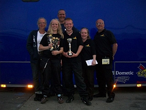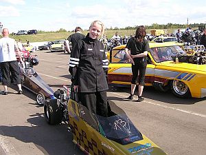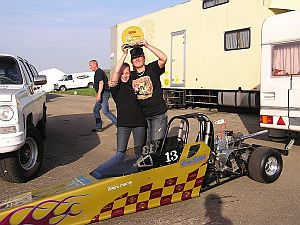 After getting sunburned on Sunday - of course we forgot to pack sun block - while watching our sponsor Gold RV Racing, and fellow Dutch racers as well as Danny Bellio, whom Lisa's Dad, Jaap also crews for, we had one run in: still number 13. We did get the Junior to run consistent 7.9s, so we headed on in to eliminations with a good feeling, helped by a visit to the Pod Shop for some much appreciated After-Sun! The first run of eliminations was a gift for Lisa: Charlotte red-lit, so we got ourselves ready for Rhiannon. That was a close battle; but Lisa came out winner. The next opponent was a tough one; Joe Kellet, winner of the Easter Thunderball. There was no way of telling who nailed it at the tree or hit the index: only when the lights came on, it became apparent that Lisa had beaten him. That left us finalists! We were up against Matthew Seamarks; and it was a great final to run against him. He knows Lisa from when she was crewing her sister's car and was exited to run against her. He beat her for the number one spot, but to us, being runner up felt like winning! Our gratitude goes out to our sponsors that make this all possible: Derek Flynn and everyone at Gold RV, Classic American, Briggs & Stratton and of course our loyal members of the Club of 100. Thursday 28th May 2009: Totally and utterly gutted. From hero to zero in just two meetings and the crew and I are totally gutted not to qualify, although it has to be said that was one hell of a meeting especially for TMD. Whilst our best qualifying time of 5.75 would have qualified us 7th in Top Fuel, this was not good enough for TMD which goes to show how far the class has come on in the last couple of years and I must say it was still really neat to be a part of the best TMD event ever in Europe - all this from a class that nearly lost its FIA status a few years back, so thanks to everyone who kept us as part of the show and hopefully your faith in our class is now being repaid. Congratulations to all our competitors in TMD it was just awesome seeing record after record being set. Our problems started with the late arrival of our block due to a certain courier that shall remain nameless. I would like to thank all at BAE for doing such a great job on our block and heads and for the quick turn around. Normally we would have fired up and tested our setup prior to arriving for a meeting but this time we actually finished building our engine at the track. Due to the fact we had hurt our engine at Easter, we were being conservative on our first run out, but due to yours truly really messing up whilst staging and the launch, this meant we had no real useful data from that run, so we had to be conservative in the second qualifying session too, but we lost a mag trigger after the burnout and were shut down due to the unusual popping and banging whilst backing up. This was just as well as we also found a push rod damaged when we got back to the pit and we may have been picking up engine bits if we had tried to run like that, so a big thanks to Ian and the start line crew. However, no data again, so we were up against it. The third qualifying session produced our best effort of 5.75 and we briefly made it to the bump and at last got some decent data to tune with but it showed we dropped cylinders early which is unusual for us and it really hurt our time. We tried hard to tune it up to overcome the dropped cylinders for the do or die fourth qualifying session and personally I thought we would get a 5.4 something or smoke the tyres on the hit but unfortunately the data shows a fuel issue and maybe a slight double step on the throttle by me which meant we still dropped a cylinder early so the car did neither and the power was just not there and that was us out. I guess we have to put this in perspective; we have had only sixteen full passes with the A Fueler and that includes my licensing runs and this car is so very different to drive and tune. We have achieved number one qualifier at two events, won one, runner up in another, a rain out and a DNQ, so that's not too bad, but to be honest even this does not make me feel much better right now. We have done really well getting down a tricky track in not so good conditions but this was a great track, probably the best I have ever seen in Europe and for once the weather gods gave us brilliant weather, which goes to prove how good the Santa Pod Track Crew are, especially when they get a break with the weather and they can give us a NHRA style track. Well done to them all and you cannot believe how I am kicking myself for not getting in the show and really showing what we can do on that type of track, although watching the rest of the TMD event unfold with the times achieved, it would have been really tough to go rounds and I think this year will be one of the best ever for TMD, and I am sure we shall play our part in the future! I would really like to thank Larry for coming over and helping us. I and the rest of the crew learned loads from Larry, which should really bode well for the future. Thanks also to the rest of the crew, you worked so hard and were great and I am sure this will make us more competitive as a team for the future as I know this DNQ hurt us all. Sorry to our fans, and thanks to all of you who popped by to cheer us on and then commiserate with us, but don't worry, we shall return with a vengeance and as a driver, I know I can do much better than this. Thanks to Mark P for the photograph! PS Have you visited our new online store with over 10,000 accessories for your RV at www.goldrv.co.uk/parts/? Sunday 10th May 2009: Looking forward to The Main Event. Unfortunately our first event win came with a bit of pain. As I reported in my last blog, we had blown a head gasket and damaged a head in our semi-final against Timo and after stripping the car down the following week at our workshop we found we had blown a head gasket on the other side in our win against the Turners. Unfortunately, 