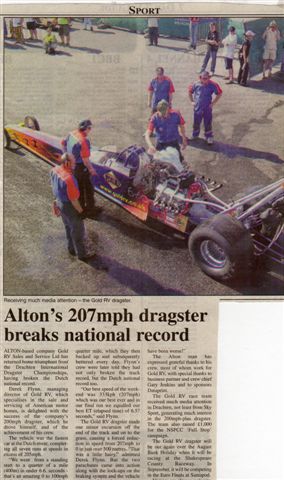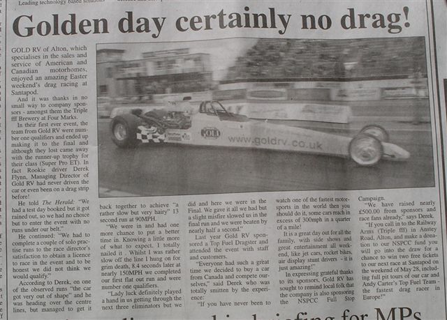 This year marks the tenth year anniversary of Gold RVs involvement in UK Drag Racing, thanks to Darryl Bradford and the Wildside Team who introduced us to the sport in the UK. And thanks to all you drag racerholics who also support our sport and special thanks to Tog and all at Eurodragster for all they do for European drag racing in assisting us to promote our sport, teams and sponsors. In association with Eurodragster, Gold RV have sponsored the perfect ET awards for seven years now and with Eurodragster we have paid out to many teams over the years well done guys and girls.. It was really neat seeing the reaction of Saskia Jell and her Mum when they won the whopping £150.00 at the Summer Nationals as it had rolled over a few times.