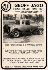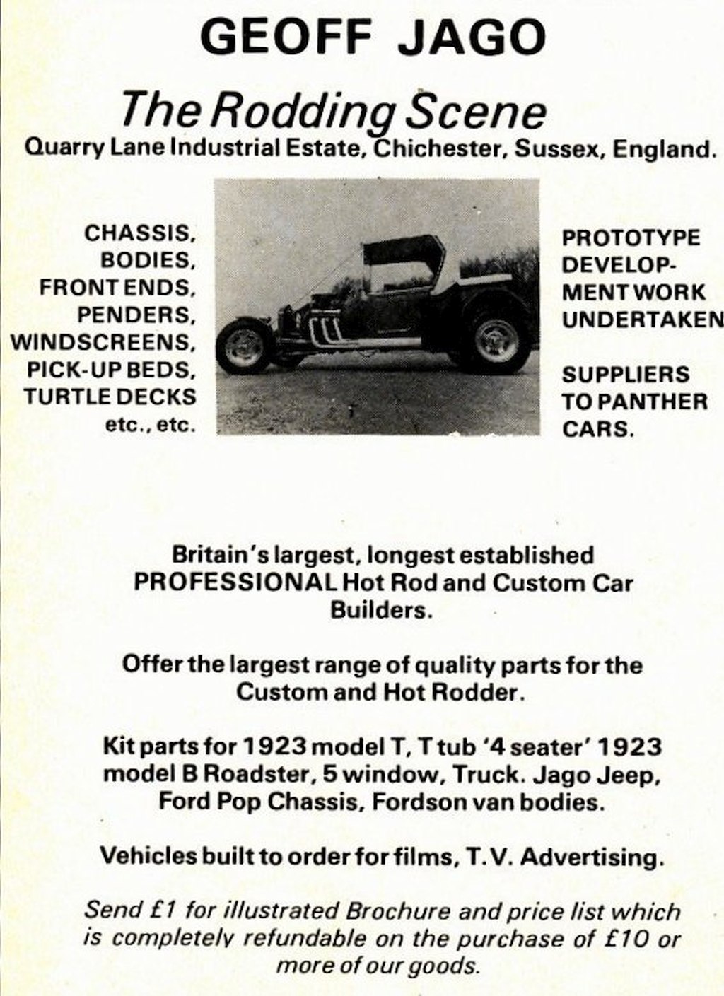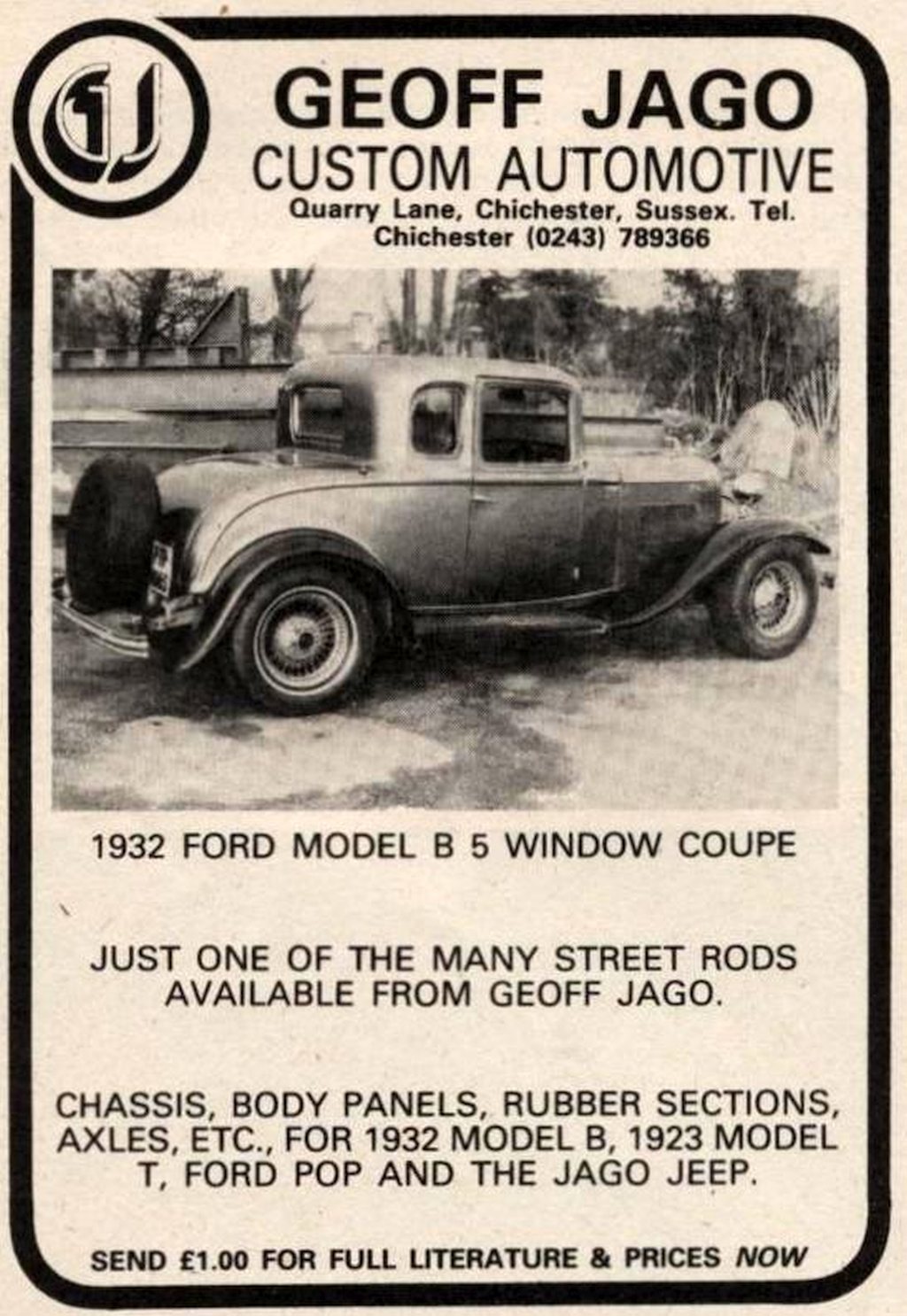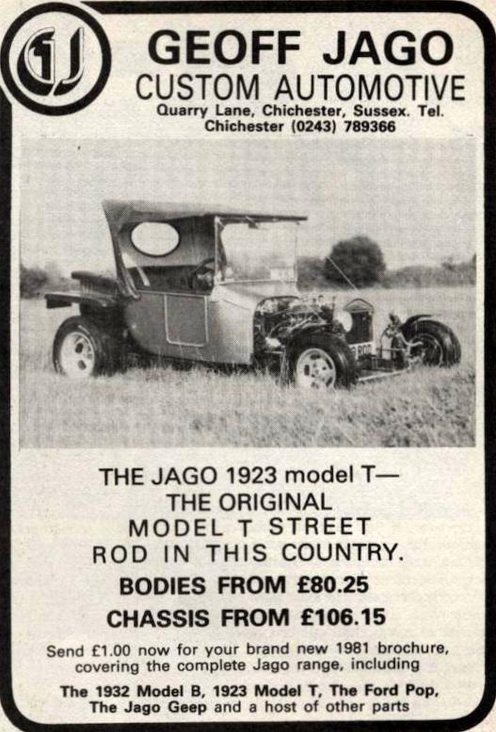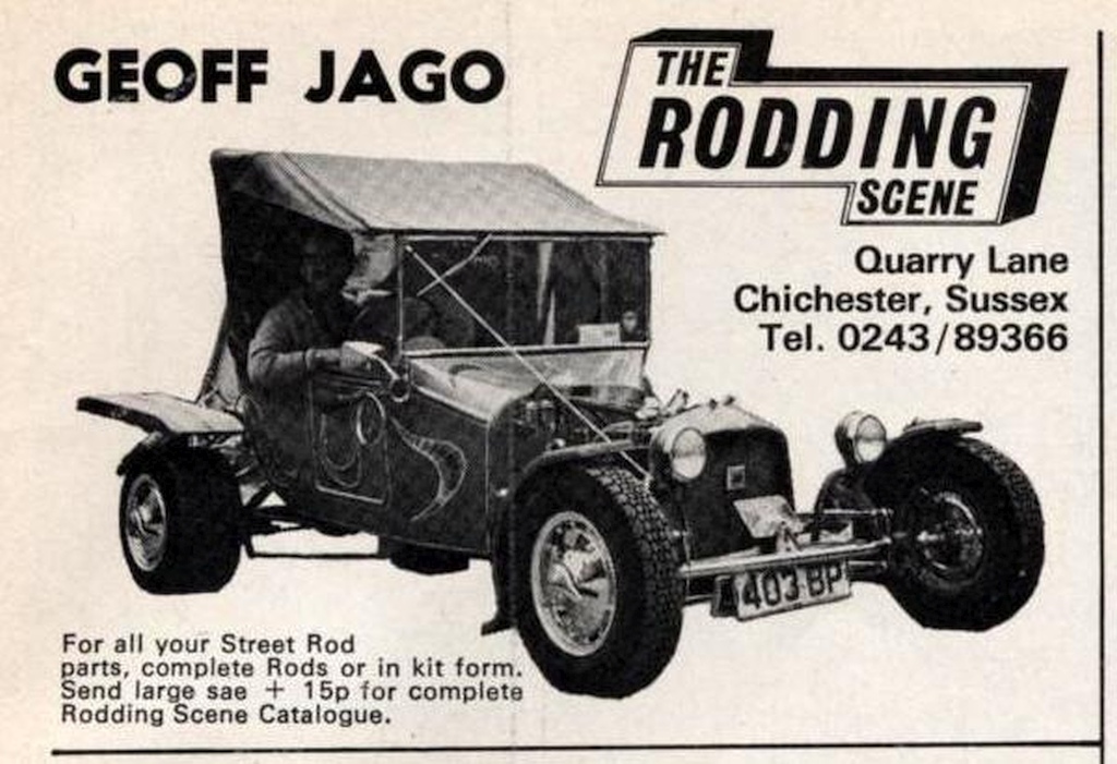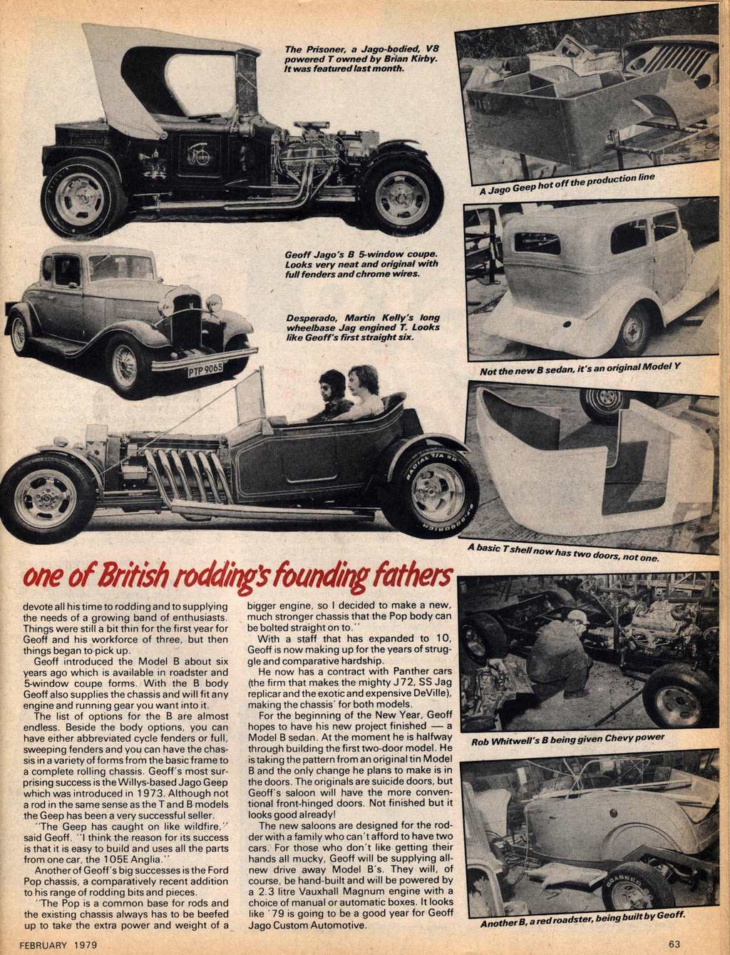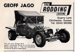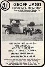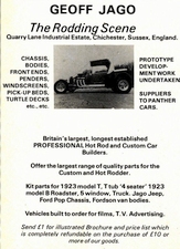 As told exclusively to In this part, Geoff tells the story about the unlikely components for his Big Moose wrecker he built in 1967, then how he developed the body and chassis for a Ford Model B with several configurations and a strong chassis for a Ford Pop. After his father died in 1968 he was able to move to new premises in Chichester, which were named The Rodding Scene. In the 70s he produced the Jago Jeep and worked to build chassis for the Panther sports GT car. Geoff's son Stuart got involved with building rods and became a paint specialist, eventually taking over Geoff's workshop whilst Geoff found and restored his first rod Jago One. I had an old Land Rover; it was a wrecker with a Harvey Frost crane on it. I’d already modified it with twin wheels on the back, and I’d made up wider wings to cover them with wire mesh grilles in the front of each wing. Then this guy came to me one day and said would I like a ‘57 Chevy. I mean what do you say? It had no engine in it just a body and chassis. The guy had had it for years in his drive, he was going to put a diesel engine in it to make it more economical, but his wife was giving him terminal bollockings to get rid of it. So, the ‘57 body went on the Land Rover chassis which I lengthened three feet. It was a 4 door Belair. I cut the back and welded the rear doors up, making it more like an El Camino kind of, you know. I added marker lights on the roof and big mirrors and air horns. I customized all the front, put a new grill on it, took the chevrons off the hood and put in little air scoops. Paint was gold metalflake with red candy over the top and it had the Harvey Frost hand crane in the back. That was now our wrecker, and we called it Big Moose.