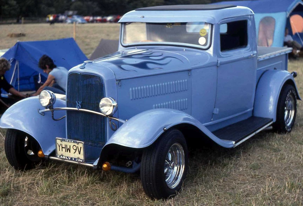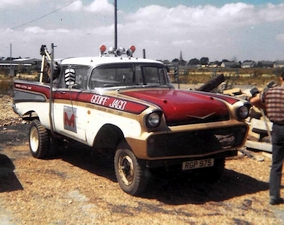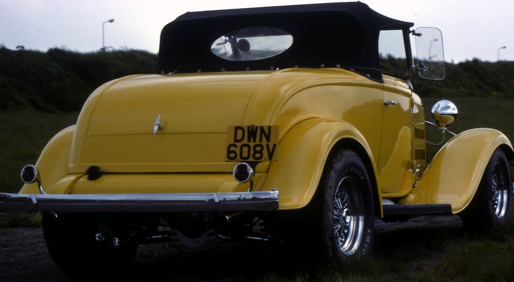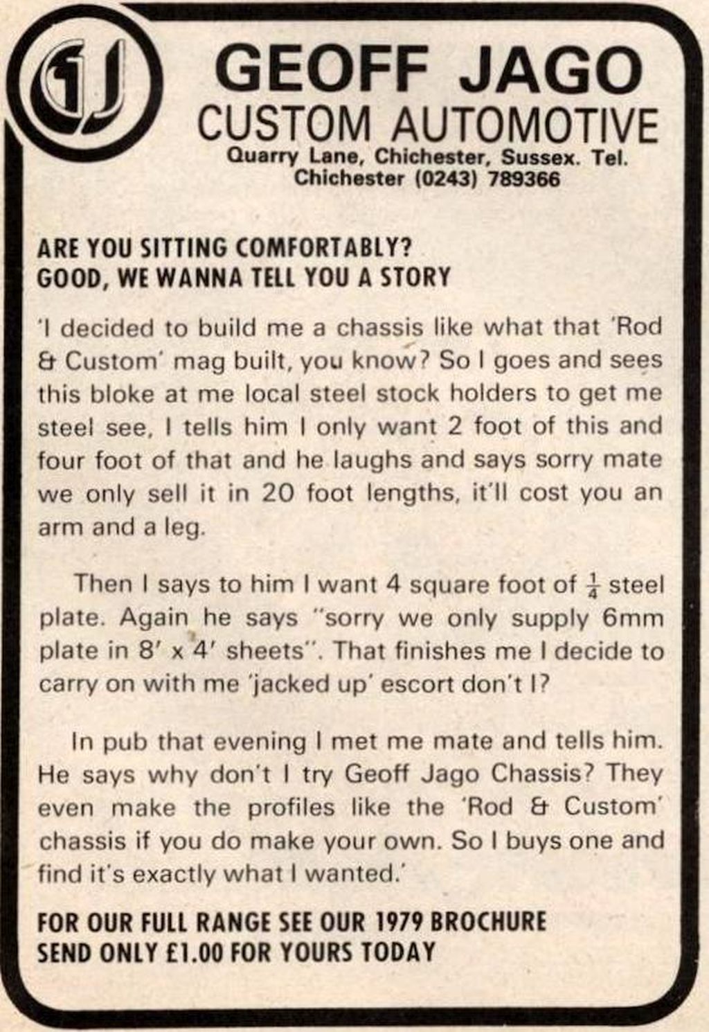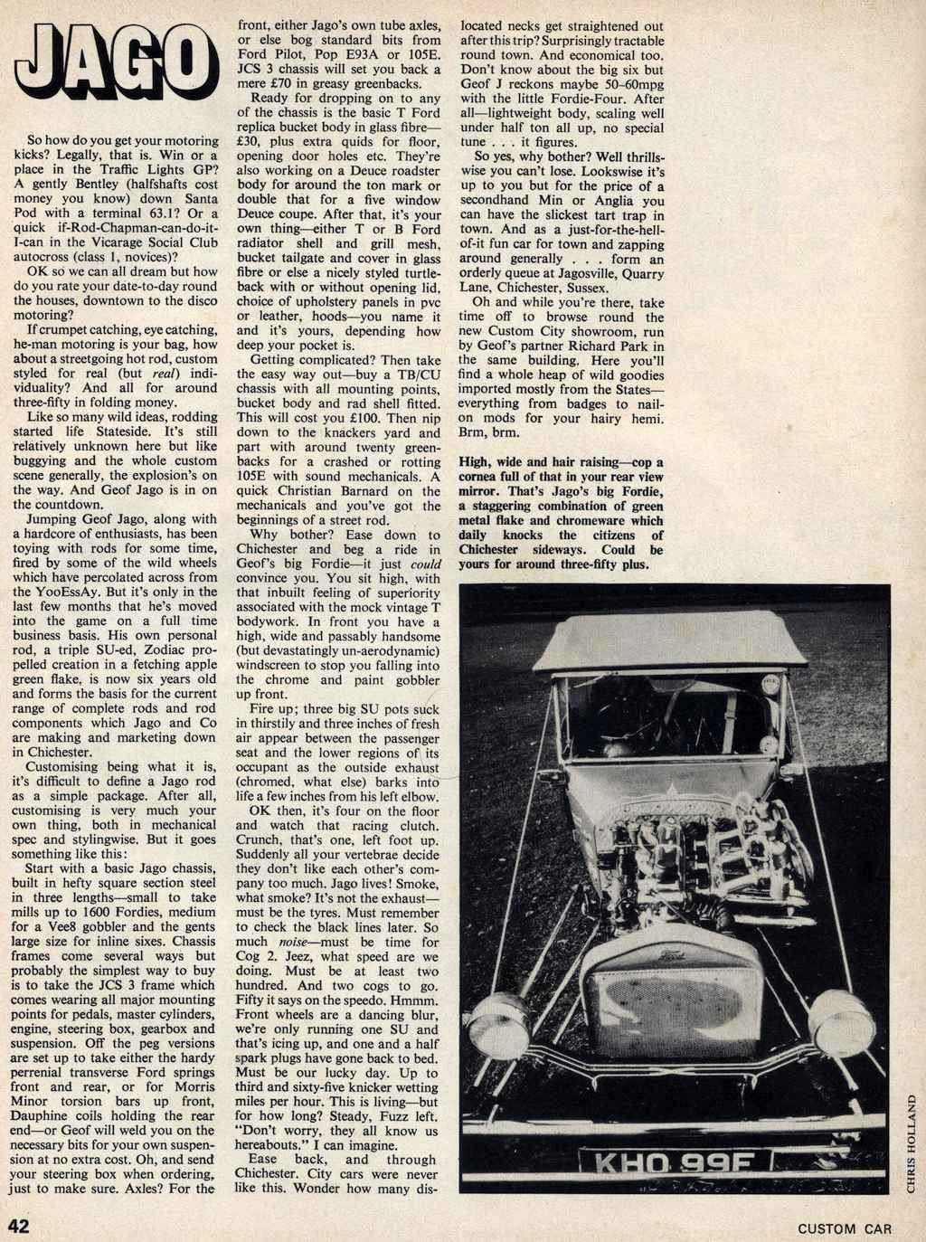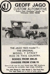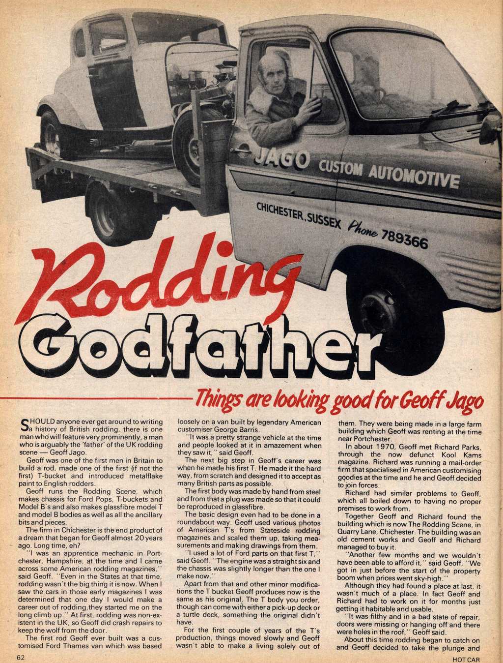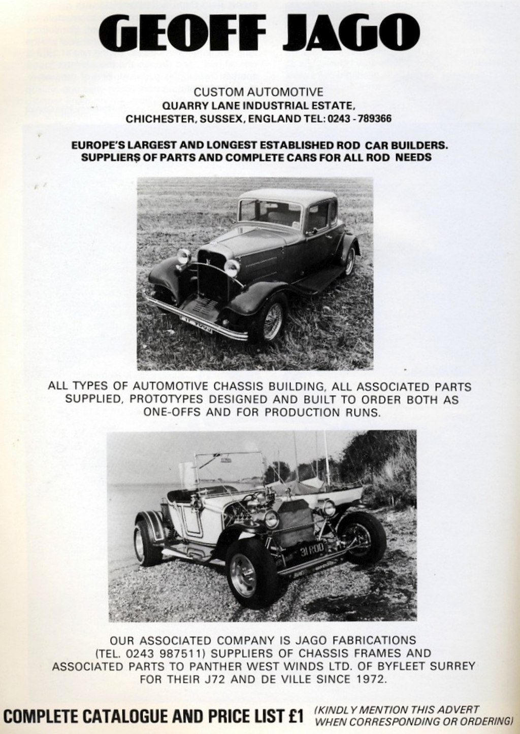 As told exclusively to In this part, Geoff tells the story about the unlikely components for his Big Moose wrecker he built in 1967, then how he developed the body and chassis for a Ford Model B with several configurations and a strong chassis for a Ford Pop. After his father died in 1968 he was able to move to new premises in Chichester, which were named The Rodding Scene. In the 70s he produced the Jago Jeep and worked to build chassis for the Panther sports GT car. Geoff's son Stuart got involved with building rods and became a paint specialist, eventually taking over Geoff's workshop whilst Geoff found and restored his first rod Jago One. I had an old Land Rover; it was a wrecker with a Harvey Frost crane on it. I’d already modified it with twin wheels on the back, and I’d made up wider wings to cover them with wire mesh grilles in the front of each wing. Then this guy came to me one day and said would I like a ‘57 Chevy. I mean what do you say? It had no engine in it just a body and chassis. The guy had had it for years in his drive, he was going to put a diesel engine in it to make it more economical, but his wife was giving him terminal bollockings to get rid of it. So, the ‘57 body went on the Land Rover chassis which I lengthened three feet. It was a 4 door Belair. I cut the back and welded the rear doors up, making it more like an El Camino kind of, you know. I added marker lights on the roof and big mirrors and air horns. I customized all the front, put a new grill on it, took the chevrons off the hood and put in little air scoops. Paint was gold metalflake with red candy over the top and it had the Harvey Frost hand crane in the back. That was now our wrecker, and we called it Big Moose.