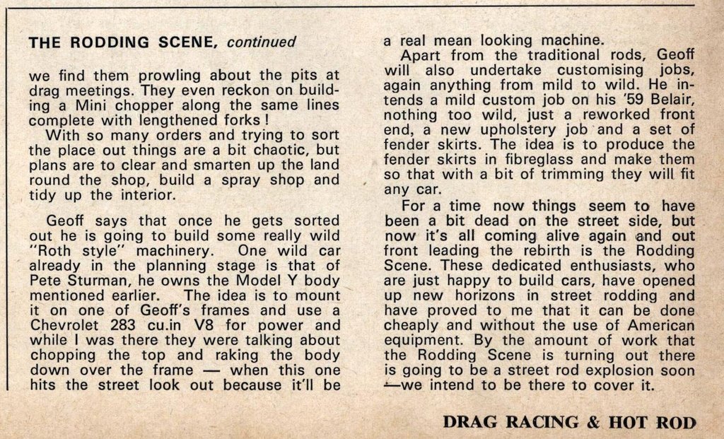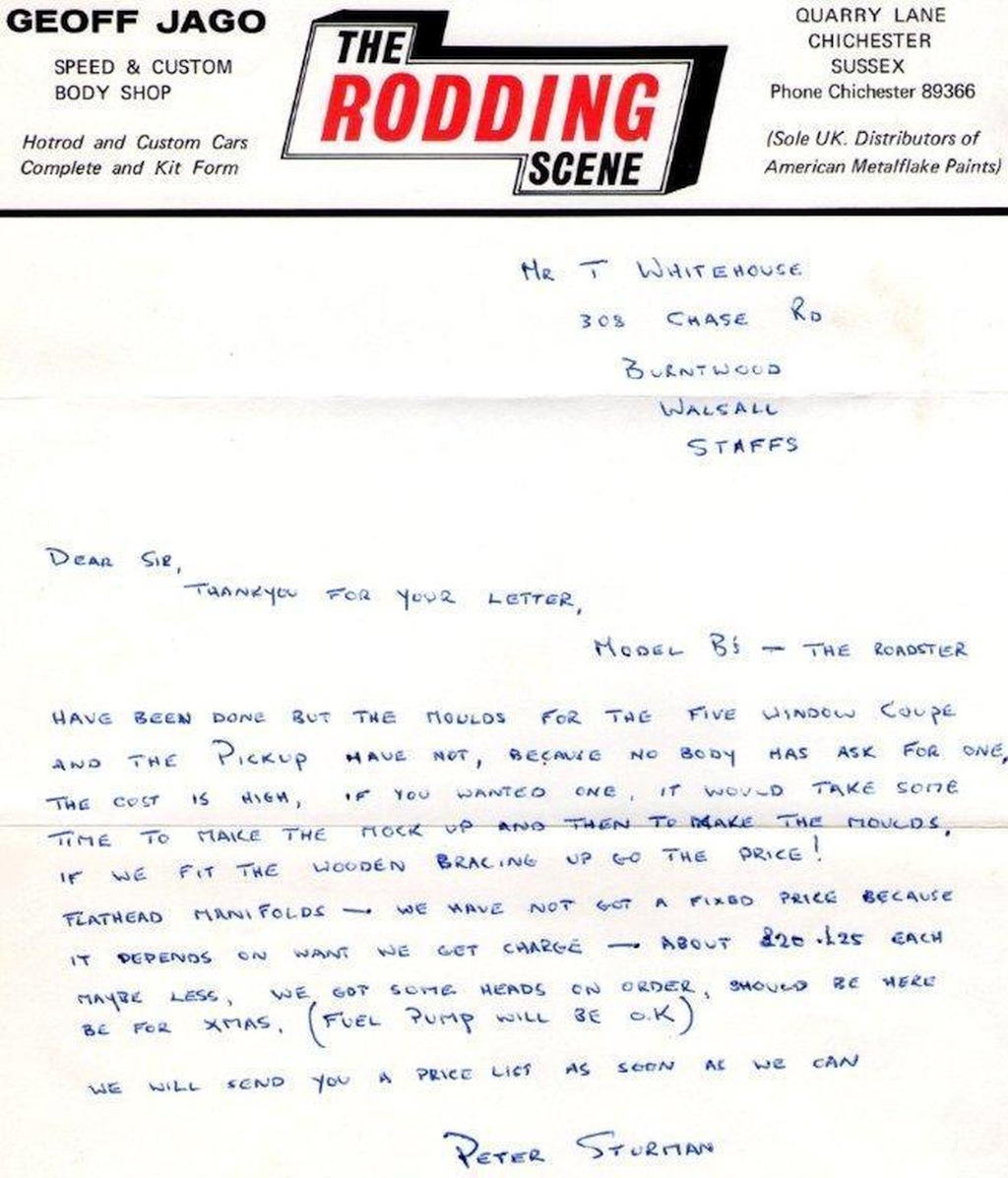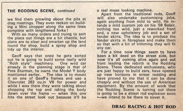 We founded the Rodding Scene in 1969 at a site that was originally a cement works in Quarry Lane, Chichester, which is actually where Stuart my son is now. (Geoff pointed to a picture on the wall) That’s the old building, that’s long gone now, a developer built the front bit on again. Prices were reasonable back then and we got the whole site for £9,000, now it's worth £400,000. Richard and I had £3,000 each then we borrowed £3,000 getting a mortgage. Going on five years Richard decided he wanted to sell his half and sold the front half of the property getting £65,000 for a £4,500 investment. He gave me first refusal on the sale but I couldn’t afford it.