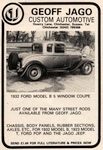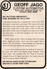 I did build a number of one-off chassis while continuing with the Jeep. With the whole kit car thing going flat at one point about 20 years ago and business just faded away. Fortunately, my son Stuart took on the business and premises doing new things while continuing to turn out bodies from our moulds. Unfortunately, we later sold them thinking we would not use them again. Chris Pattison had them from me then later he sold them to a guy who had a fire in his workshop and all the moulds were lost. We could always get another car and take a mould from it if we wanted to. We were offered not long back a Model B Panel Van which was a project no longer required. Stuart has tried contacting the guy but he doesn't return his calls. We want to restore it to what we had before as our company van, having it sign written in our company name.