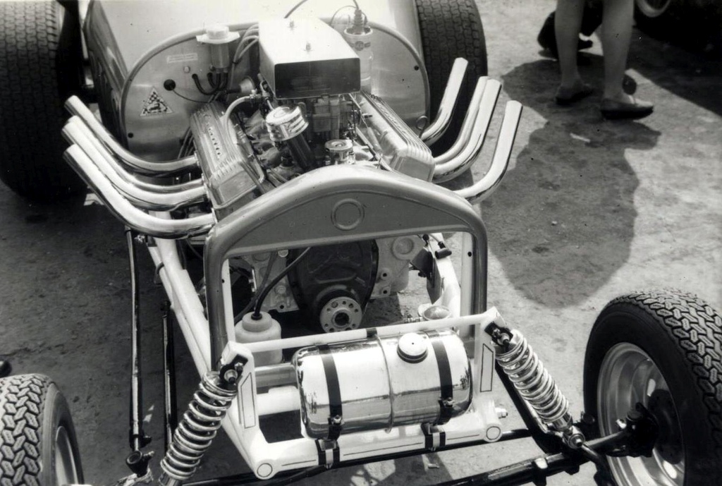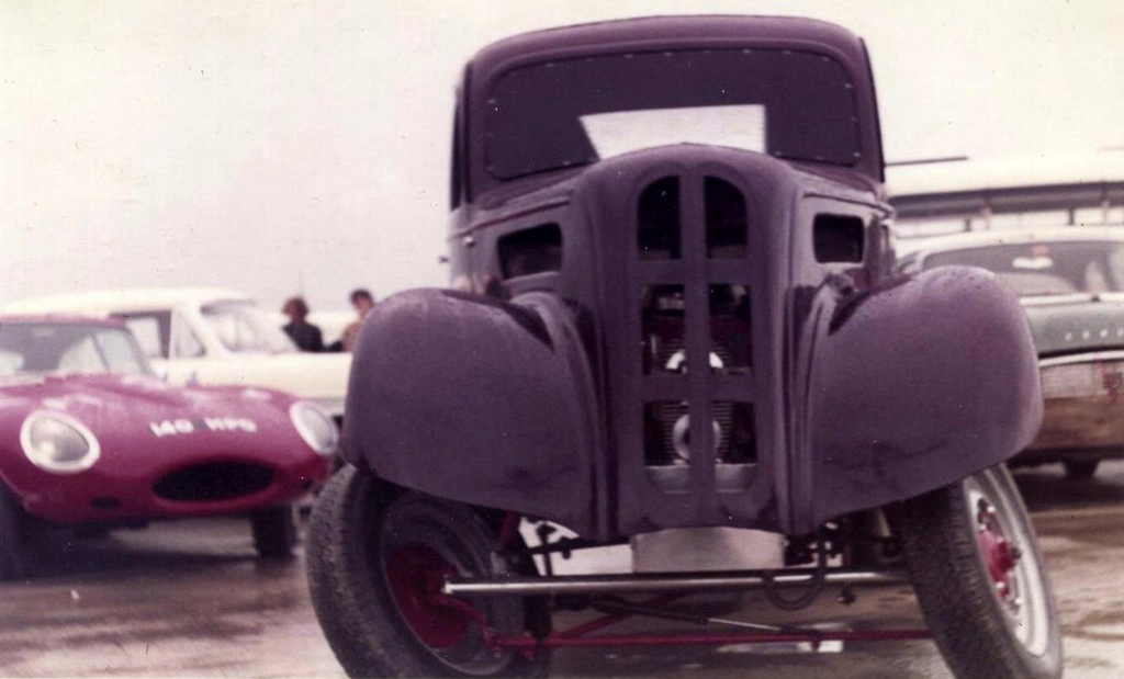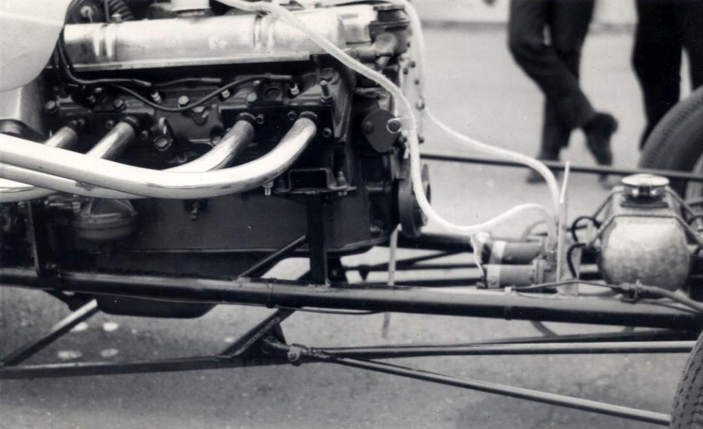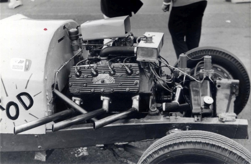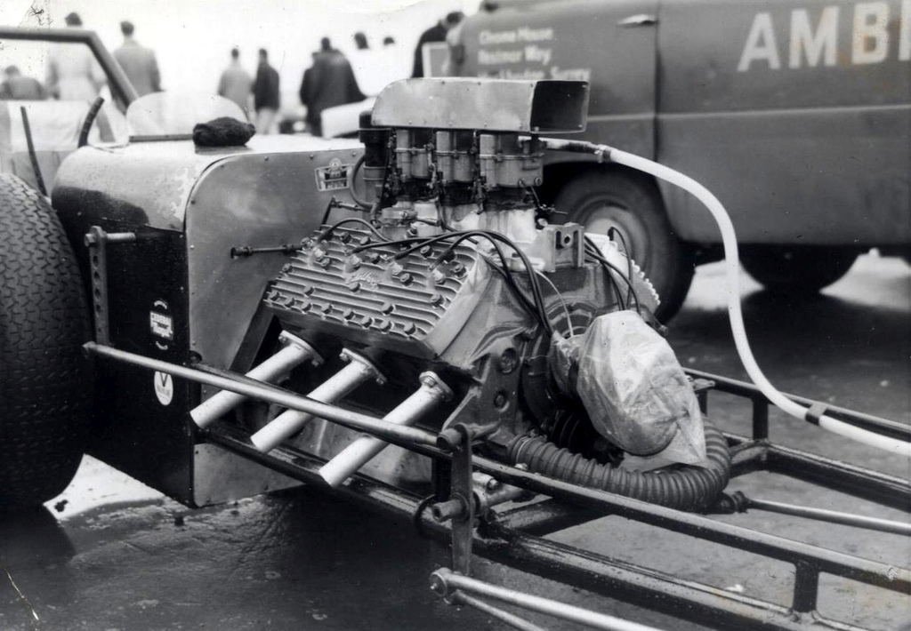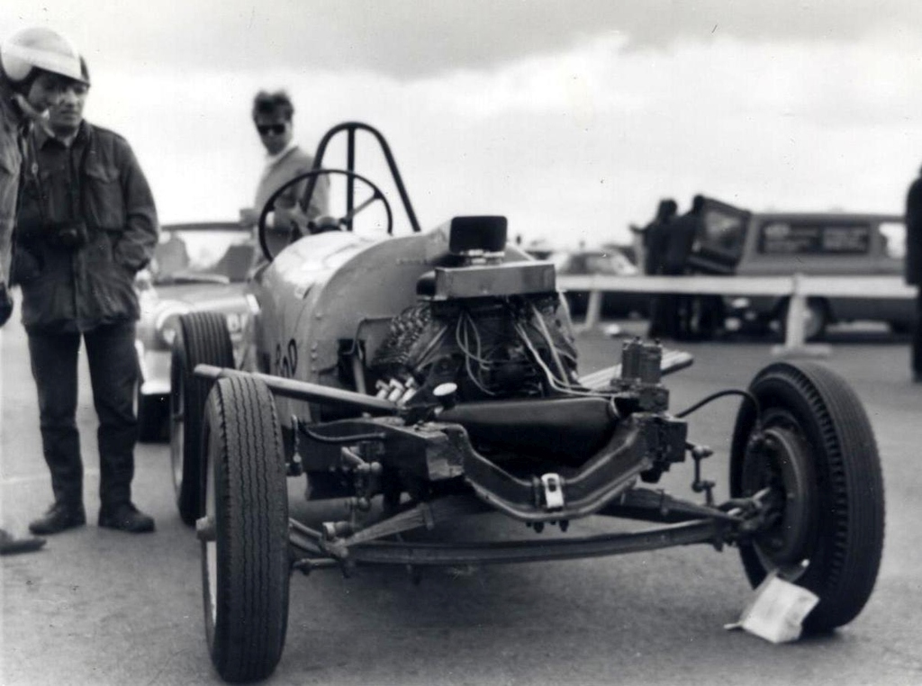 This was our starting point and we towed it with Dad’s Bedford Dormobile bread delivery van to Letchworth some 20 miles away, then to Dad’s Bakery in Baldock. He had a garage on the other side of the wall to the bakery ovens which helped to warm the garage. The car spent some time there before we had to rent a Council lockup on the Grange estate, Letchworth. We stripped out all the old Ford Pop bits and added our own parts. We had a 3.6 litre Ford Flathead V8 engine from a Ford Pilot with the 3-speed gearbox, using aluminium cylinder heads from Sydney Allard with 3 Stromberg carburettors. We bolted an Austin Westminster back axle straight to the chassis, not being in a position to fit suspension at the time. We discovered the Westminster axle looked like an American one as it had an aluminium centre section and was big and strong. In all our years of racing these kinds of cars at that level, we only broke one differential and that was in the dragster with the Flathead engine but this was later on in the late 70s/early 80s.