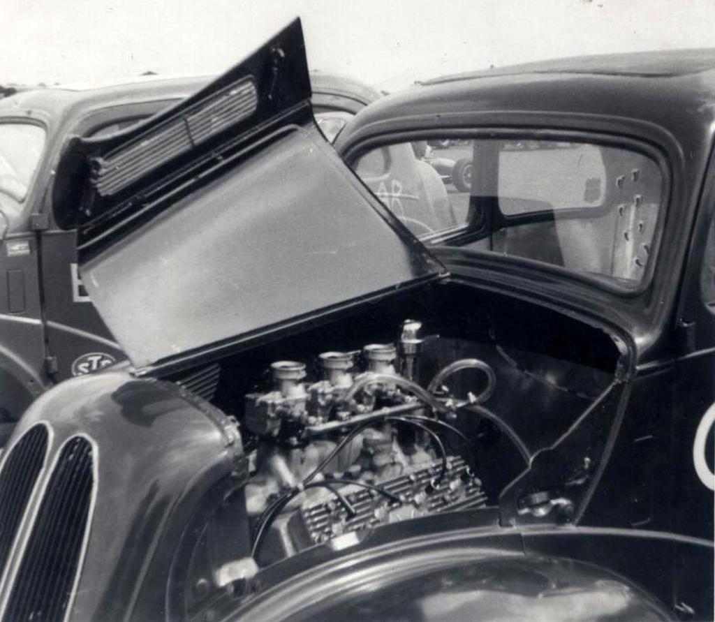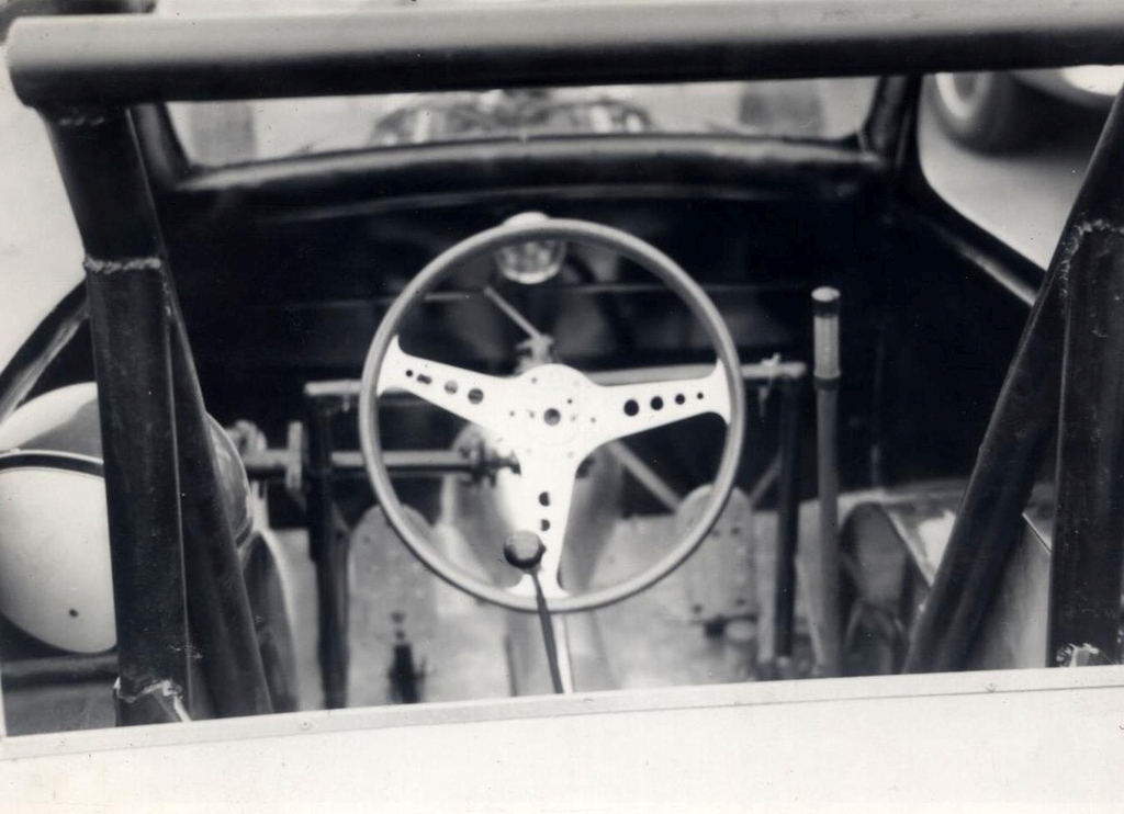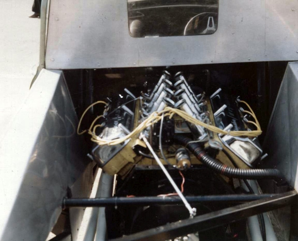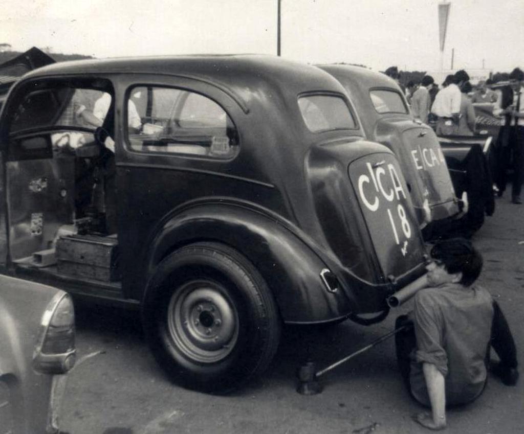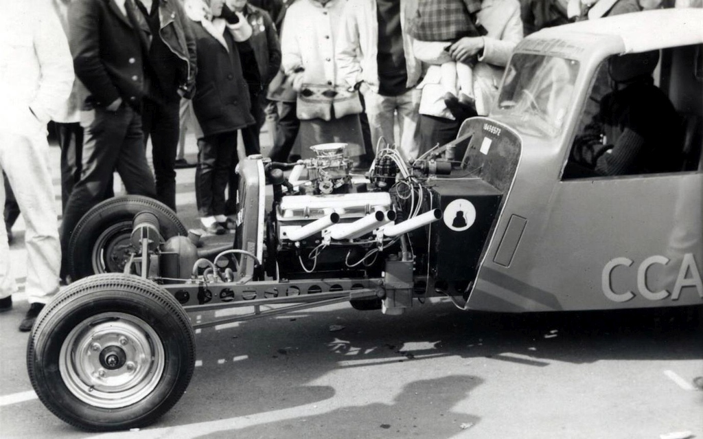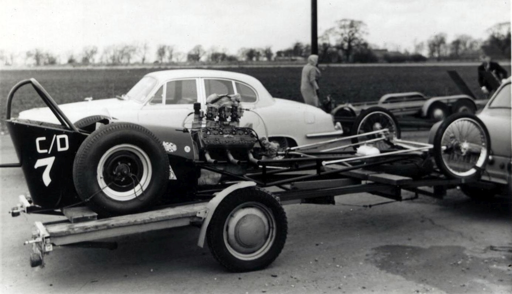 This was our starting point and we towed it with Dad’s Bedford Dormobile bread delivery van to Letchworth some 20 miles away, then to Dad’s Bakery in Baldock. He had a garage on the other side of the wall to the bakery ovens which helped to warm the garage. The car spent some time there before we had to rent a Council lockup on the Grange estate, Letchworth. We stripped out all the old Ford Pop bits and added our own parts. We had a 3.6 litre Ford Flathead V8 engine from a Ford Pilot with the 3-speed gearbox, using aluminium cylinder heads from Sydney Allard with 3 Stromberg carburettors. We bolted an Austin Westminster back axle straight to the chassis, not being in a position to fit suspension at the time. We discovered the Westminster axle looked like an American one as it had an aluminium centre section and was big and strong. In all our years of racing these kinds of cars at that level, we only broke one differential and that was in the dragster with the Flathead engine but this was later on in the late 70s/early 80s.