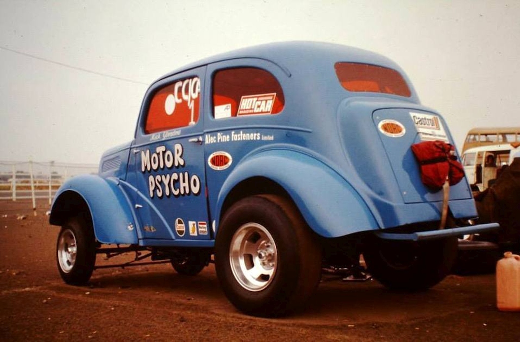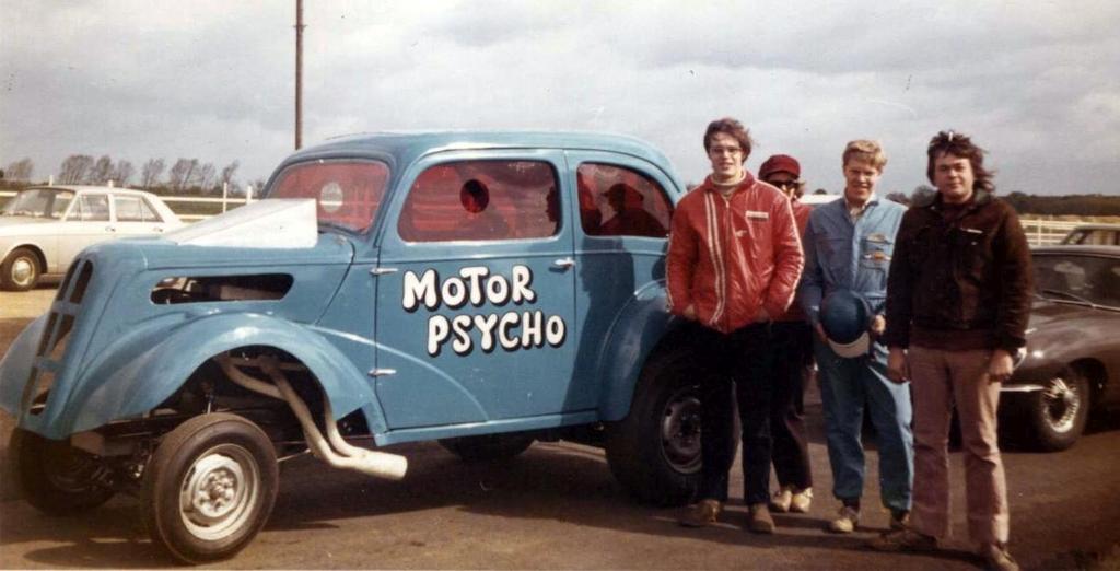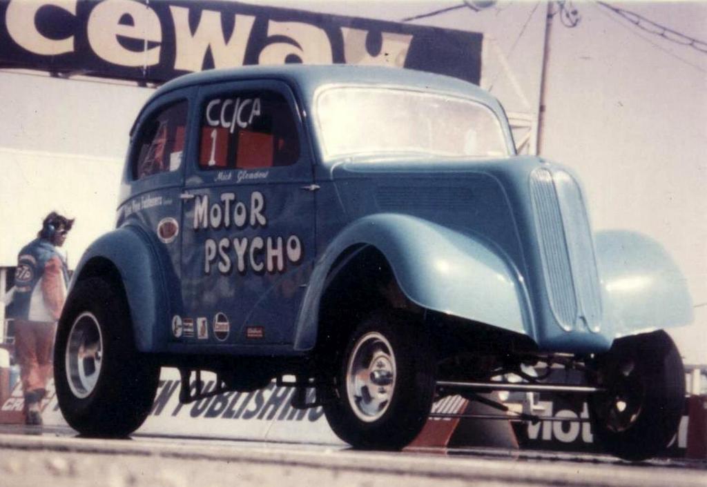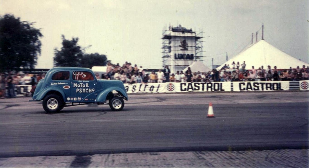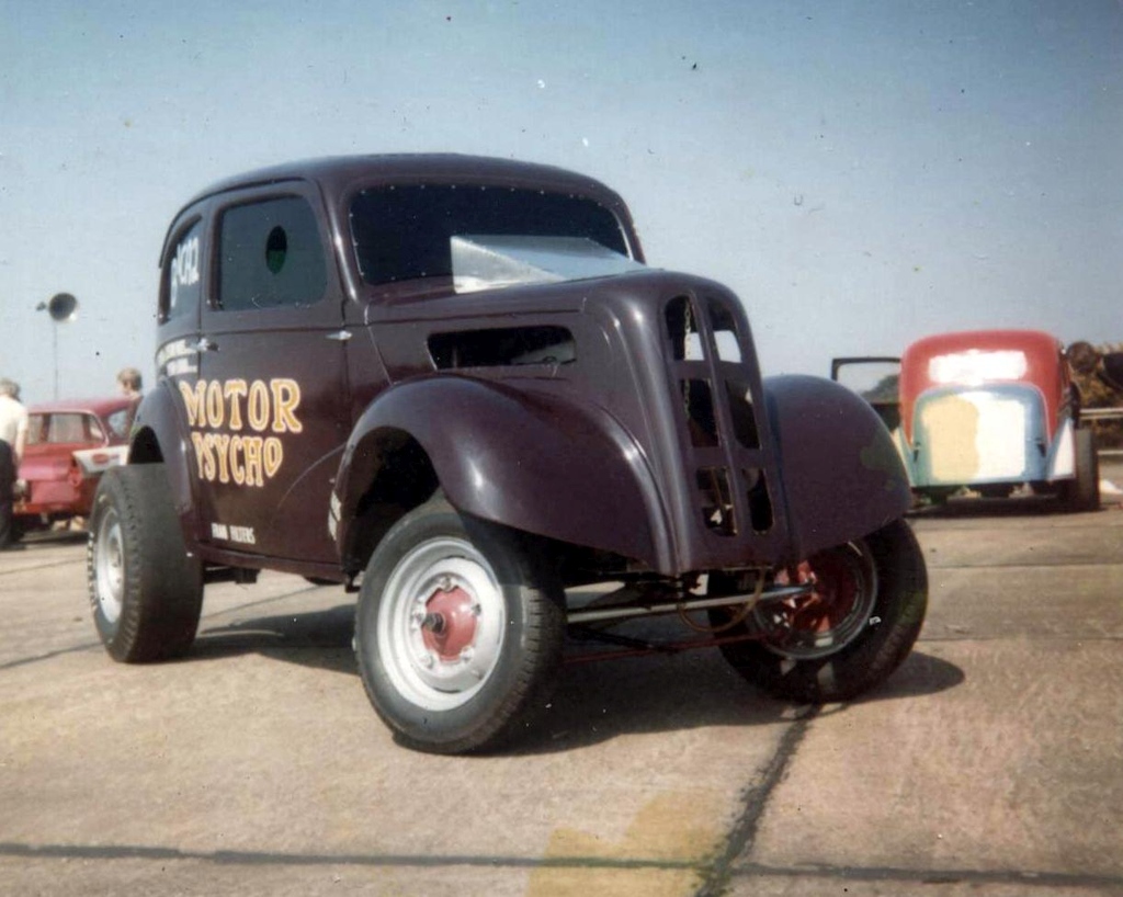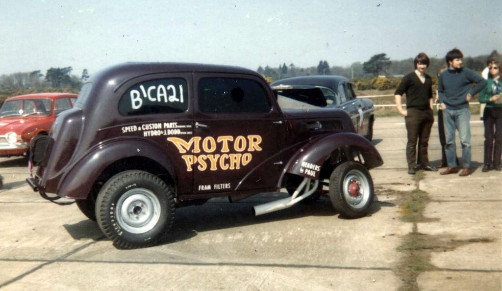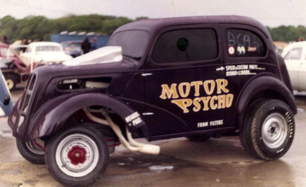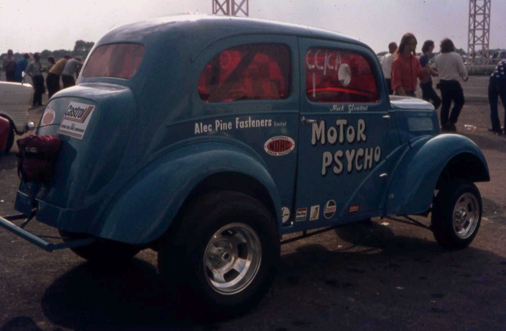 As told exclusively to Brian Mick and Bob Gleadow first got into drag racing seeing an early meet at RAF Chelveston, becoming mobile caterers for some early British events in the sport. Their first car was a Ford Pop which started with a flathead Ford engine, later upgraded to an Olds V8 and named Mangler. Learning more about mechanics and obtaining often hard to get parts, the brothers upgraded the car comprehensively including a strong roll cage and fibreglass body parts with new engine pieces. In 1970 the car was renamed Motor Psycho and was run until the end of 1973, with a new engine in that year, before selling it to Al O'Connor as the original Al's Gasser.