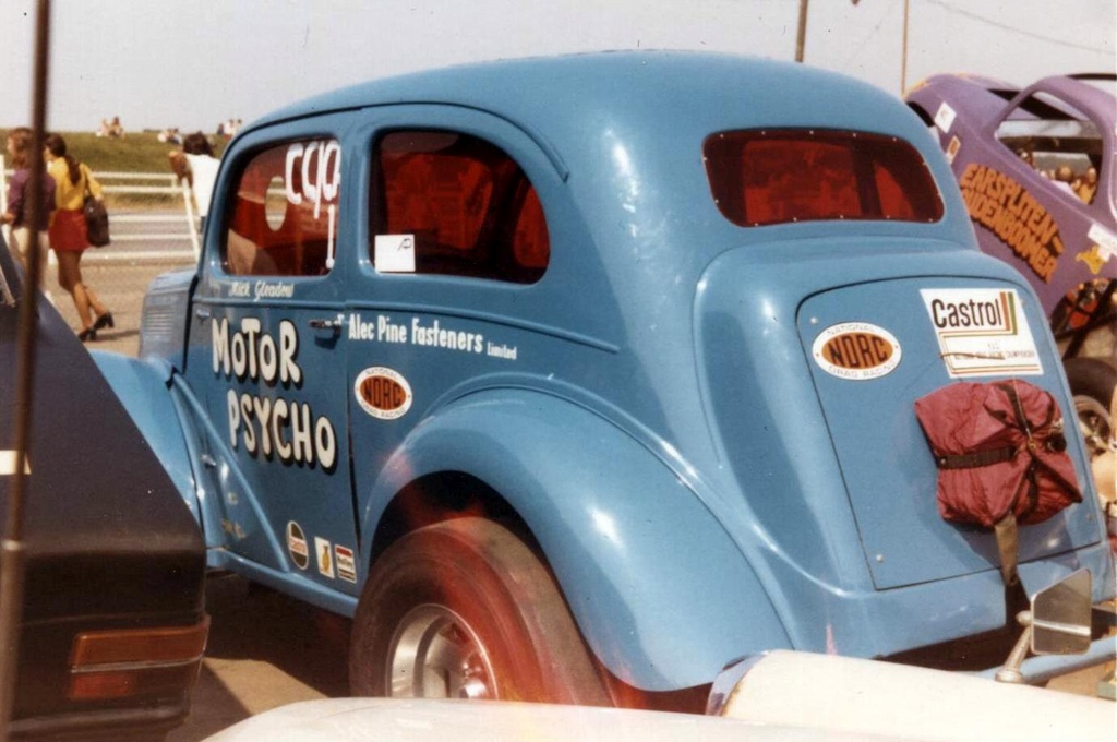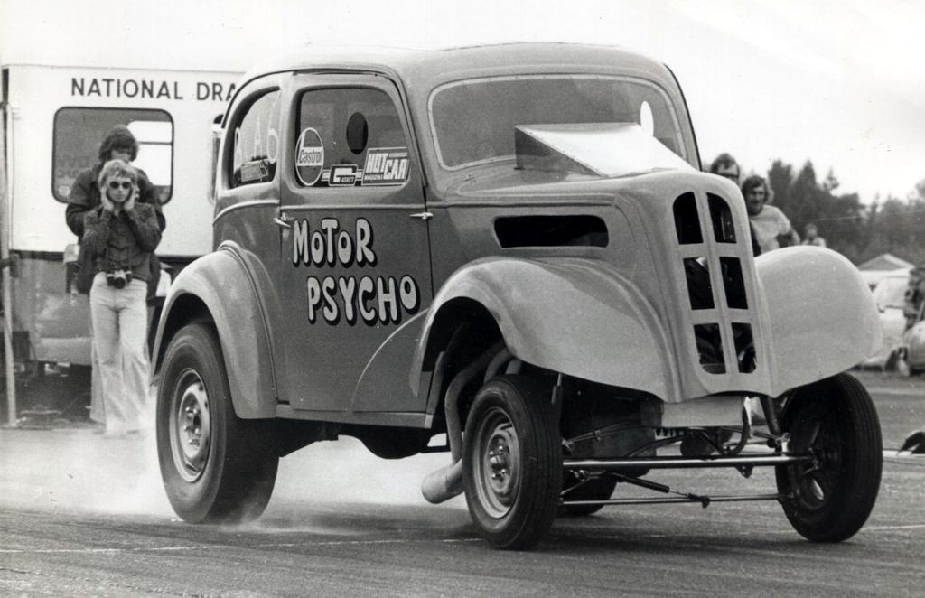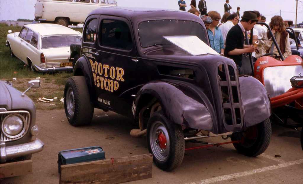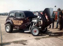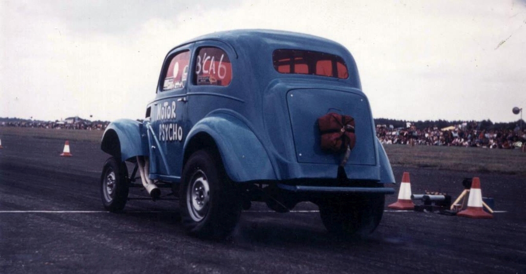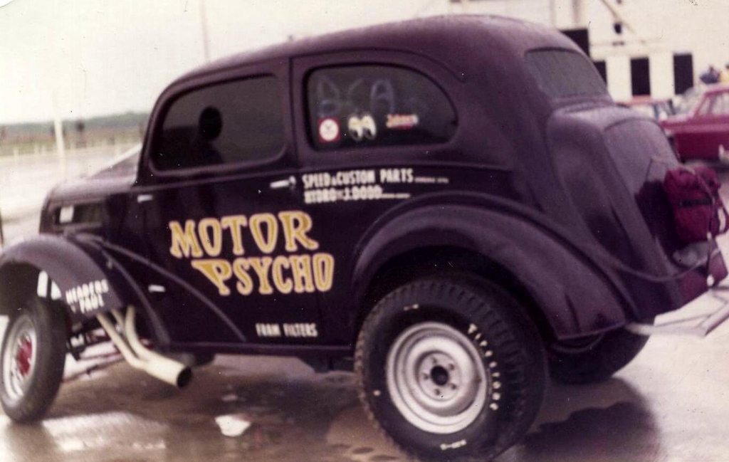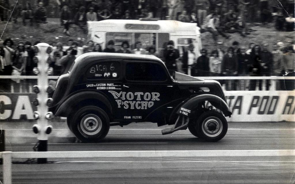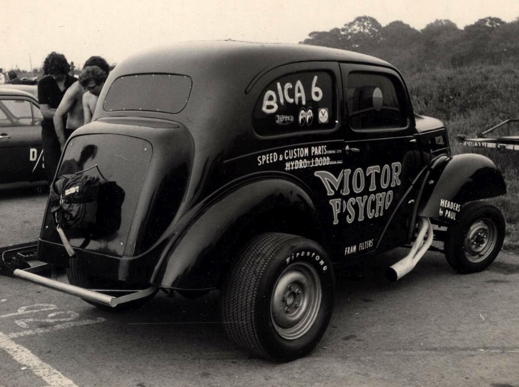 As told exclusively to Brian Mick and Bob Gleadow first got into drag racing seeing an early meet at RAF Chelveston, becoming mobile caterers for some early British events in the sport. Their first car was a Ford Pop which started with a flathead Ford engine, later upgraded to an Olds V8 and named Mangler. Learning more about mechanics and obtaining often hard to get parts, the brothers upgraded the car comprehensively including a strong roll cage and fibreglass body parts with new engine pieces. In 1970 the car was renamed Motor Psycho and was run until the end of 1973, with a new engine in that year, before selling it to Al O'Connor as the original Al's Gasser.