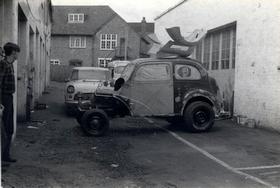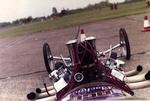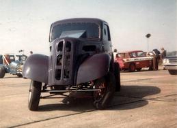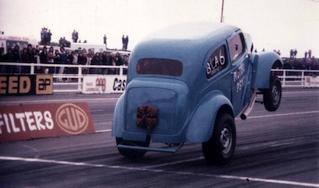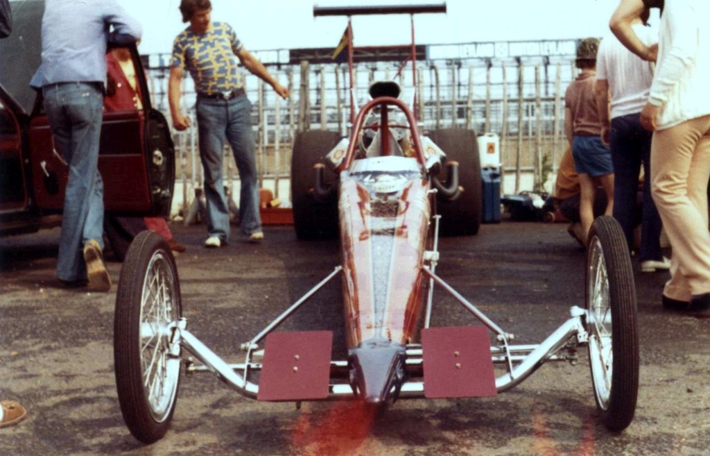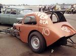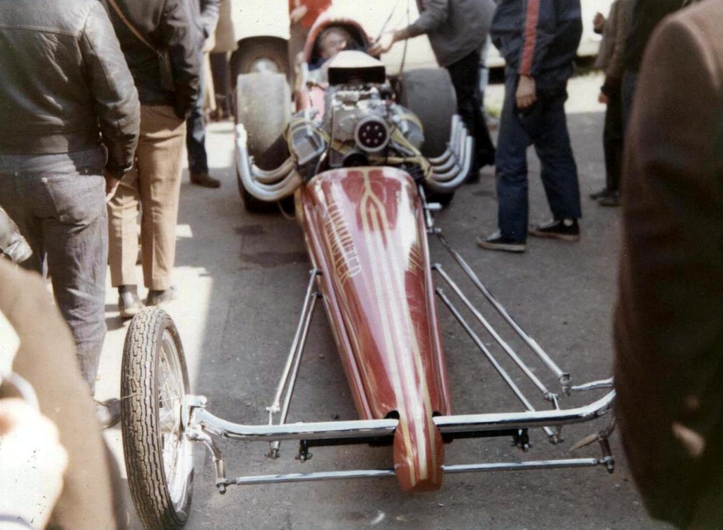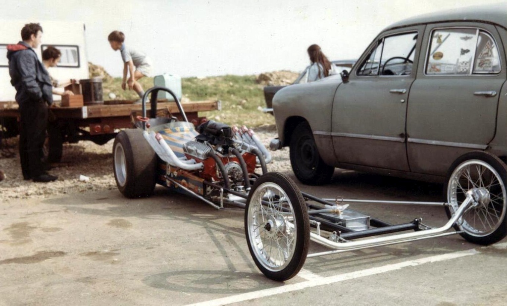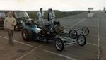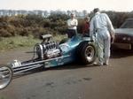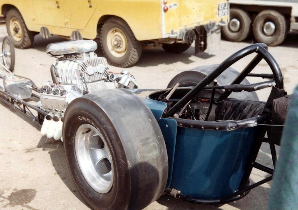 1972 saw another paint job, this time pale blue, by Alexander Coachworks in Hitchin, Hertfordshire and John Collier did the signwriting again. New fibreglass sills and wider rear wings were bought from Pat Cuss at Fibreglass Applications and the perspex windows were now red. Mick took over as the driver. Before he first drove the car, he was petrified not knowing what was going to happen. Brian remembers well before Mick’s first race in the fire up road he was out looking at the car every few minutes. Bob said he still does! Mick replied: When you first drop the clutch, you think the sky is going to fall in but it doesn't of course. Being set up with loads of castor the car basically wants to go straight, providing you don’t have too much wheel spin and once you've overcome this then you're fine, just a bit daunting to start with. Mick achieved a best of 11.88 at Blackbushe and still has the timing ticket! Bob drove the push car mainly, also during these years he organised the logistics and support needed by the team. He admits to not putting a spanner to the car. To get better times, Kelly Springfield slicks had been fitted and after doing a burn out which were just then becoming the norm, we misjudged the increased traction, and Mick pulled a huge wheelie. A few things got bent which we didn't notice until we fired it up next time and the throttle stuck open sending a conrod out the side of the engine block and that was the end for our beautiful Olds engine. We sold the Oldsmobile heads and other engine parts to Peter Lane and Ray Tucker for their Earspliten Loudenboomer Topolino, a year later. We raced at six meetings in 1972.