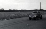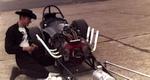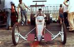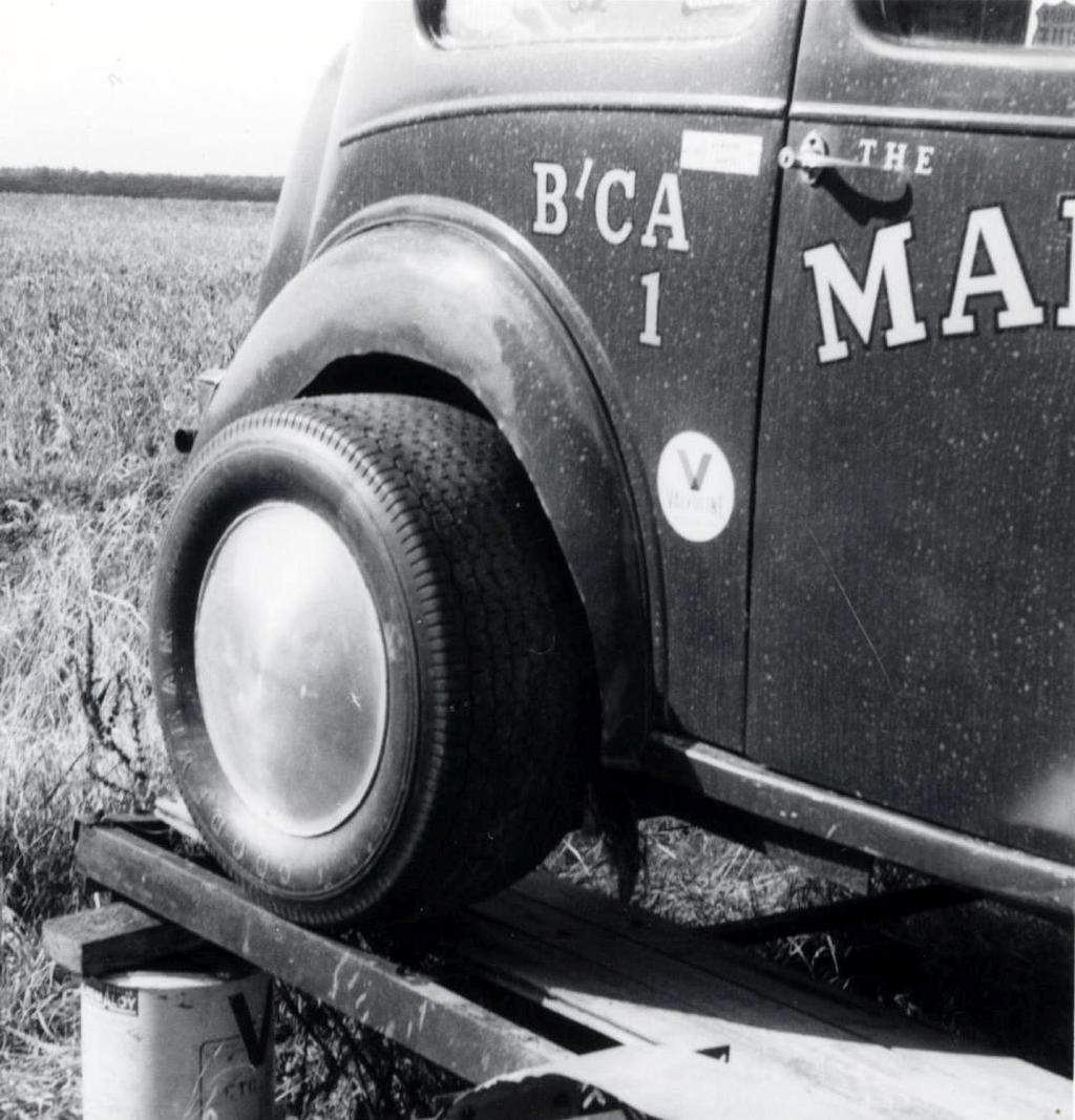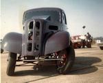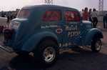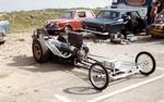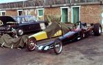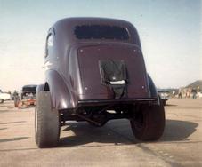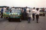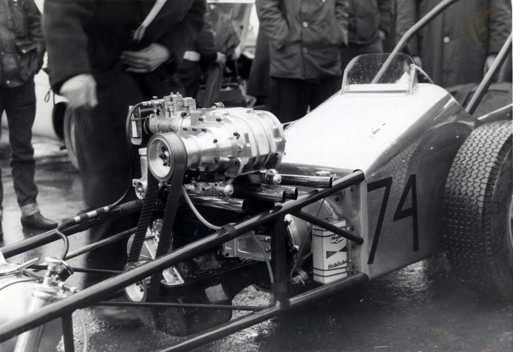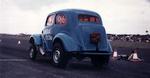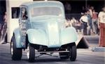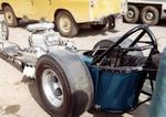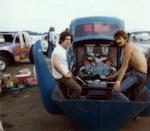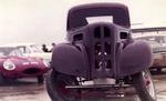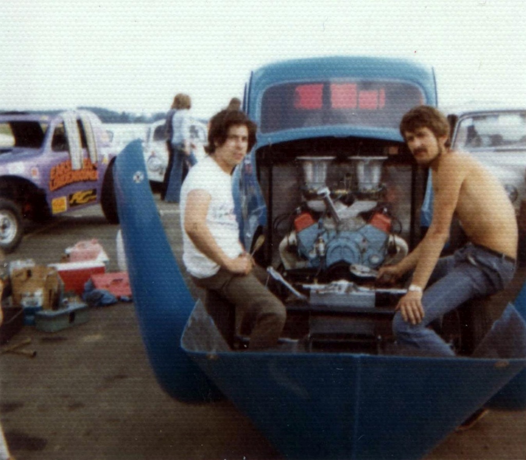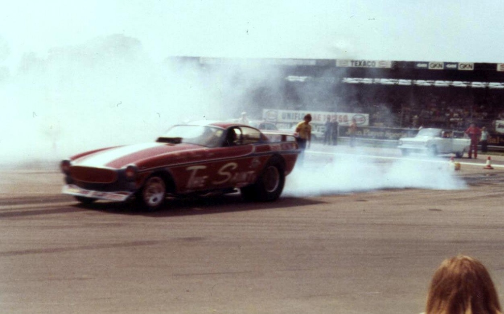 1972 saw another paint job, this time pale blue, by Alexander Coachworks in Hitchin, Hertfordshire and John Collier did the signwriting again. New fibreglass sills and wider rear wings were bought from Pat Cuss at Fibreglass Applications and the perspex windows were now red. Mick took over as the driver. Before he first drove the car, he was petrified not knowing what was going to happen. Brian remembers well before Mick’s first race in the fire up road he was out looking at the car every few minutes. Bob said he still does! Mick replied: When you first drop the clutch, you think the sky is going to fall in but it doesn't of course. Being set up with loads of castor the car basically wants to go straight, providing you don’t have too much wheel spin and once you've overcome this then you're fine, just a bit daunting to start with. Mick achieved a best of 11.88 at Blackbushe and still has the timing ticket! Bob drove the push car mainly, also during these years he organised the logistics and support needed by the team. He admits to not putting a spanner to the car. To get better times, Kelly Springfield slicks had been fitted and after doing a burn out which were just then becoming the norm, we misjudged the increased traction, and Mick pulled a huge wheelie. A few things got bent which we didn't notice until we fired it up next time and the throttle stuck open sending a conrod out the side of the engine block and that was the end for our beautiful Olds engine. We sold the Oldsmobile heads and other engine parts to Peter Lane and Ray Tucker for their Earspliten Loudenboomer Topolino, a year later. We raced at six meetings in 1972.