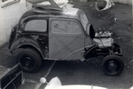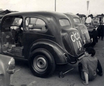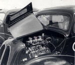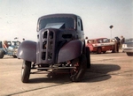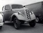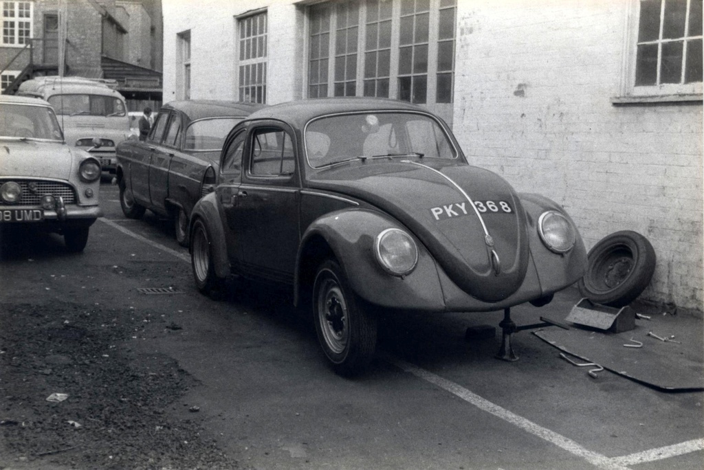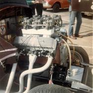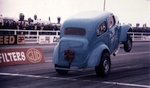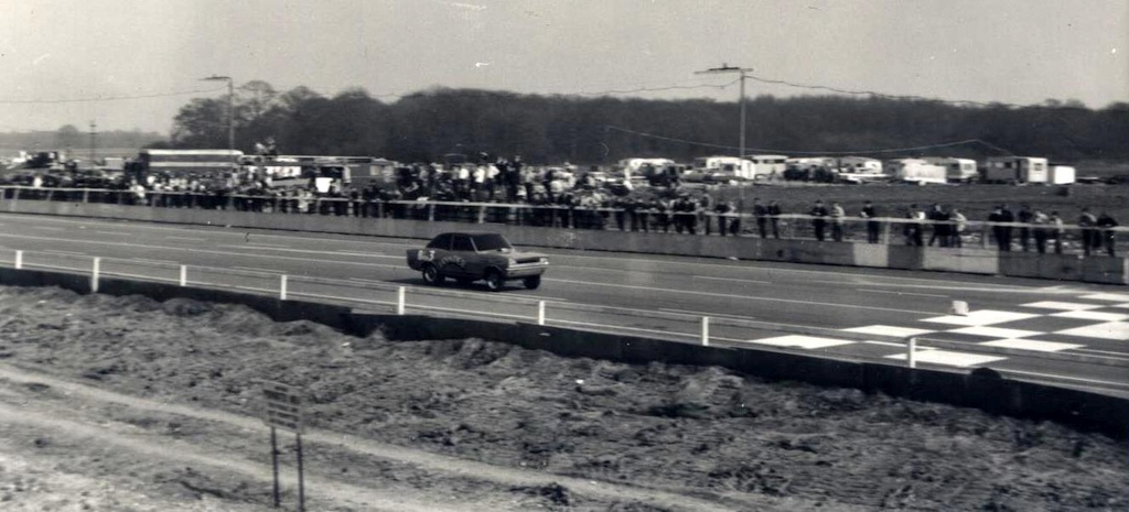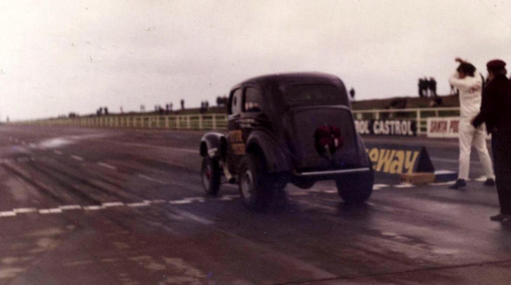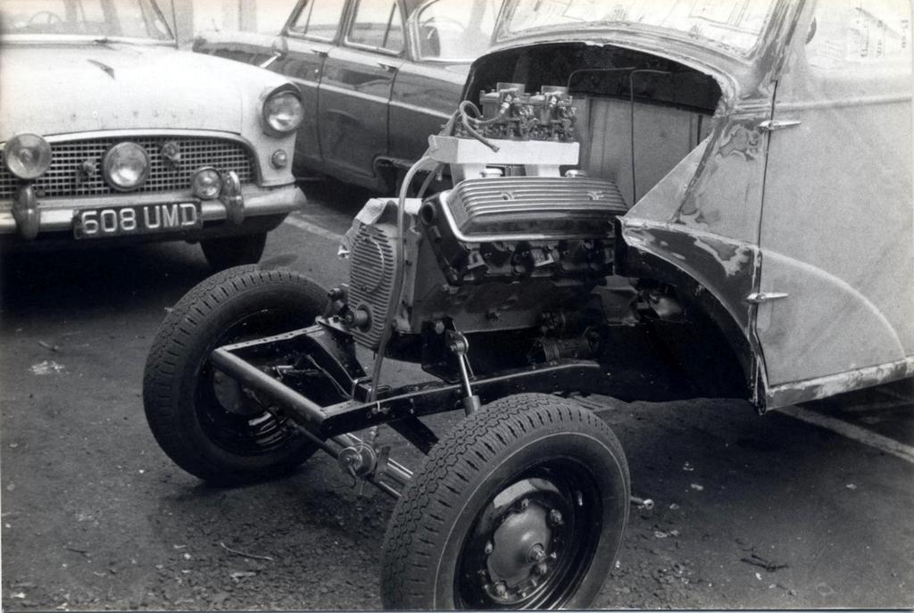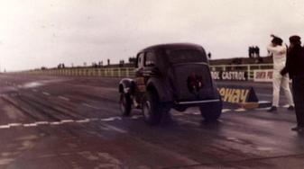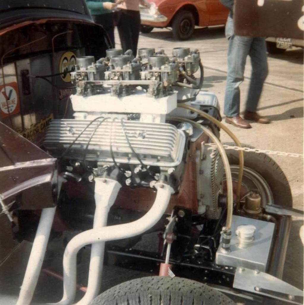 We didn't run the car in 1969 but spent the year further modifying it. A fiberglass mould was borrowed from the ‘Good Vibrations’ team. Buying the materials from FGR and with their invaluable help, Mick made a replacement bonnet and front wings all in one mould, replacing the steel ones. Brian stayed out of this, too messy for him, Bob organised the materials and paint, still being an organiser today. We also got fiberglass doors and boot lid supplied from Jerry Jackson. Alan Herridge made a chrome straight tube front axle fitted with Anglia spindles and Vauxhall Velox wheels which raised the front end. Realising we needed to spend some money to upgrade the engine, we had the Oldsmobile bored out, using Jahns pistons and balanced by Brabhams and a reground camshaft. Allan Herridge made a shatterproof steel flywheel. After initially using the Oldsmobile manifold with a Carter AFB, Allan sold us his homemade manifold originally fitted to his Pulsation Cadillac dragster, using six Stromberg Carburettors running on straight methanol. Also from Allan was a Moon aluminium front cover, Titan aircraft fuel pump and a number of other parts. We mounted an early Oldsmobile rear axle on Vauxhall coil springs with a Watts type linkage to locate it. Rear tyres were 9.00 x 15in rock hard Firestone Smoker Slicks, originally fitted to Dean Moon's Mooneyes dragster that came over to the UK in 1963. We fitted a Hydra Matic 4 speed transmission with cast iron casing which was very heavy, but supplied at no cost to us, from John Dodd, well known for his Rolls Royce Merlin engined street car. A new NASCAR style roll cage was made by a mate in a local garage workshop where we knew the owners. This same roll cage was still fitted when Al O'Connor crashed the car in 1978; it most probably saved his life.