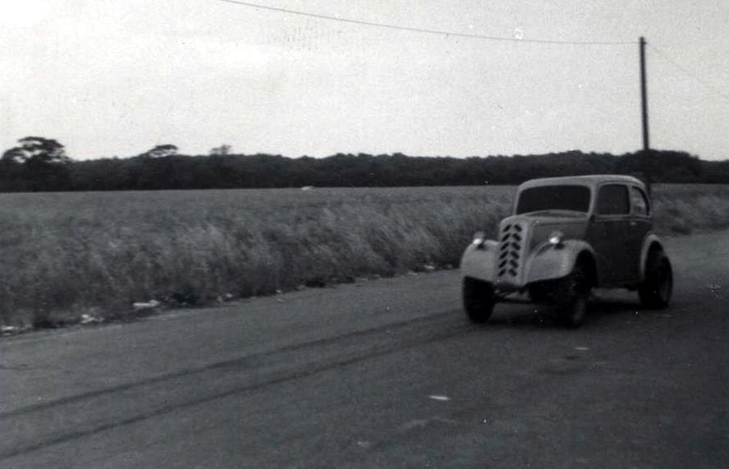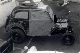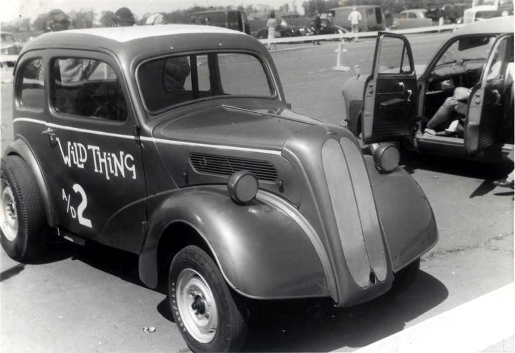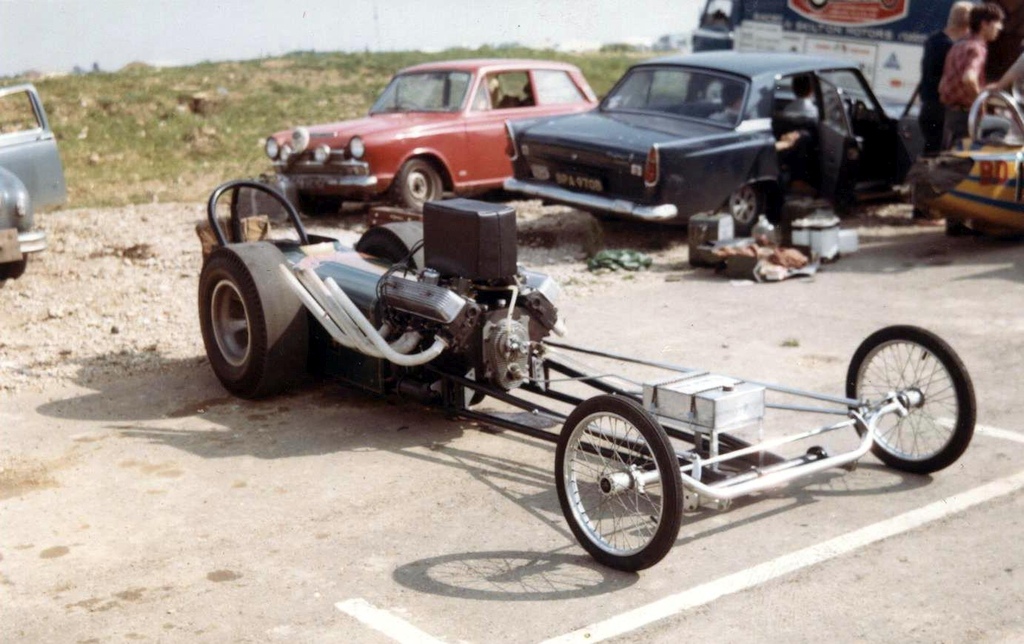 Bob next: I’m the youngest of the three at only 71. I left school at 16 and became a trainee accountant which I really hated, so I got a job in a garage and have been in the motor trade all my life. Going to school together with Brian and Mick, working with Dad and his catering business. At the 1964 Chelveston Dragfest I had the pleasure of serving Don Garlits and Tommy Ivo hot dogs. I’m here today 50 years later having just debuted a new Fuel Altered, and why am I still doing it? I really don’t know!! We have all dropped out of racing at different times during this period of over 50 years for various reasons, mostly financial. I remember when my daughter was born, I was off collecting the dragster chassis on the roof of my car. Coming back to 1964 and my first experience of seeing drag racing. It was George Montgomery and his ‘33 Willys Gasser, that was the car which did it for me. Brian, Mick and Bob talk about their first race car: Inspired by Johnny Loper’s 'Little Hoss' Anglia A/Gasser featured in Hot Rod Magazine at the time, we bought a Ford Popular minus engine and gearbox from a scrapyard in Gamlingay, Cambridgeshire.