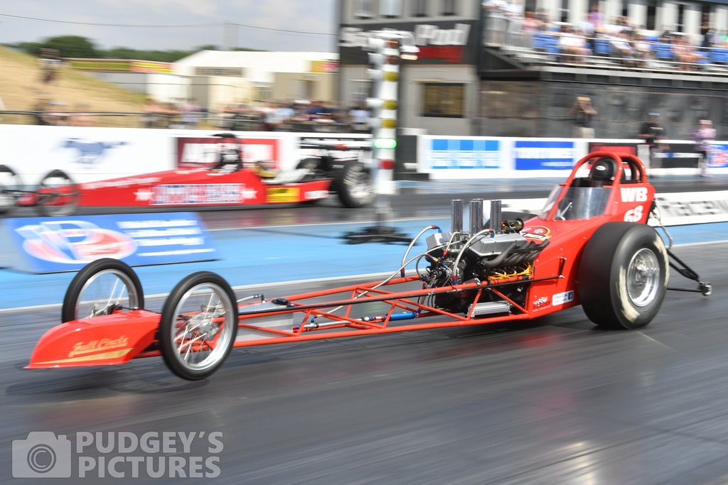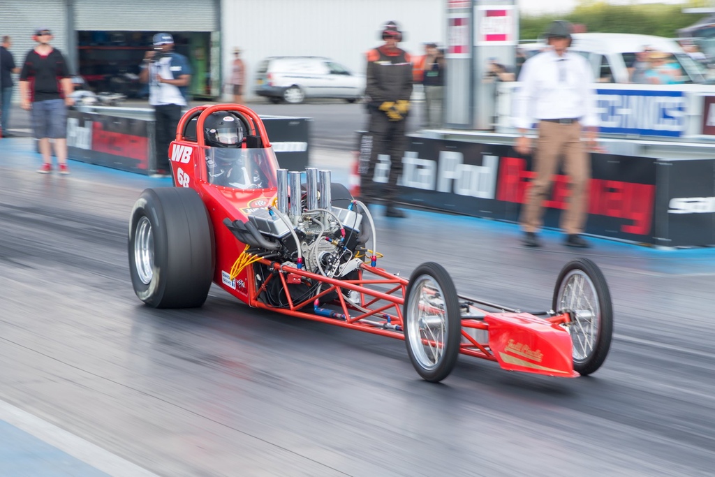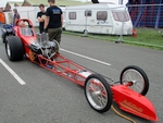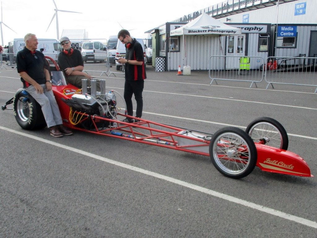 Of course there were other important decisions to be made such as the paint job and name! I tend to prefer bold single colours over more elaborate paint jobs – and it’s cheaper! I decided to go with Red, the colour used on Vintage Tin, with a black chassis. I like red and black as bold contrasting colours and I stayed with that on my second dragster; even my generator and compressor are red and black, a bit of a theme emerging because so is my mobile phone cover;-) Regarding the name I wanted a nostalgia themed name and a name not used before; it came to me when I was browsing on the net and found a scrap yard in the States, called – Jurassic Parts! Perfect! I gradually built the car up and in September 2010 actually made it to a RWYB, we had some oil pressure problems initially but got those sorted and the car sounded really good. Got the car in the 10s pretty quickly and to a best of 10.17; decent times for a gas burner with stock heads, 10:1 compression; a single 4 barrel with a hydraulic cam. I never leant on that motor because I wanted a low maintenance, low cost set up. So up to 2014 I ran at some Motorsport UK meetings, Dragstalgia and RWYBs and had fun with it. By this time I thought I had reached the limits of the car and I was pretty taken with the look of modern nostalgia cars, Wayne Ramay’s car in particular – also red! Lots of chassis builders were really busy then and I was lucky that Bill Felstead of Comanche Race Cars had a gap in the schedule and was able to build for me a new front engine chassis. We brainstormed how it should look, had lots of pictures of front engine dragsters spread out in his workshop, but guess what, Wayne Ramay’s car stood out so that was how it would look! I sold the first chassis to James Ford who must have sold it on because it’s now run by Robert White in Wild Bunch. Bill finished the car in October 2015, over the winter and into 2016 I rebuilt the engine with 12:1 Ross Pistons, Eagle Rods, Comp Cams mechanical tappet cam, ported heads and, the highlight, Hilborn stack injection, (made in 1967) and alcohol fuel. I finally got to race a Junior Fuel car, which I thought about first in 1975! This second car was named Jurassic Parts 2 (shown as 2 claw marks on the top panel logo).