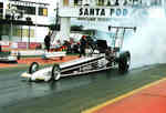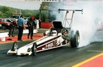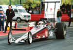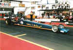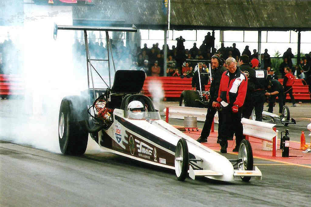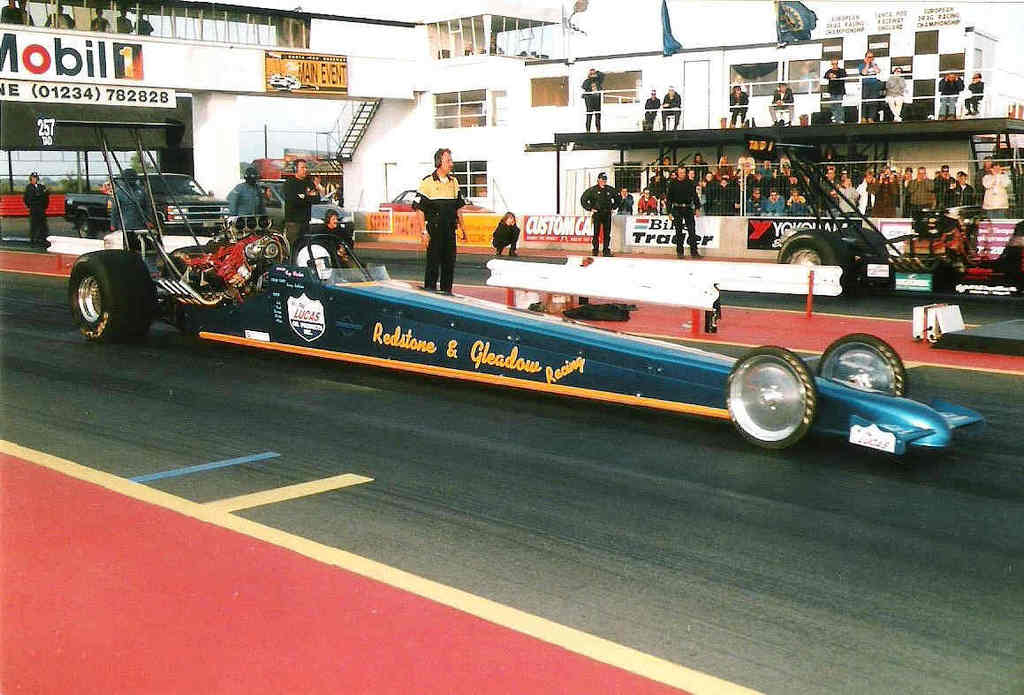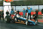 Time Machine 6 1998 saw the aging Le Patron chassis sold to Martin Canto, driven initially by Andy Frost then by future Top Fuel driver and SPR commentator/TV presenter and long time friend of the team, Darryl Bradford. A new arrival for the Redstone & Gleadow team was a much more up to date car from the Leppannen brothers in Finland that had only done a couple of runs before being parked and came complete with their Fat Head Hemi and hi-helix blower. At the Summer Nationals Fay broke Roz Prior's long standing record for the quickest female racer in the UK with a 6.33@214mph. The team headed to Hockenheim and ran well with a 6.38 slowing to 206mph as the burst panel went long before the finish line, unfortunately low entries meant it was elected to run a 4 car field, and controversially the team were held from going to collect Fay from the top end while other classes were run, this didn't leave enough time to turn the car round for the next session and rain moved in stopping any chance to improve on the qualifying time to make the field. The Night Show in pouring rain was something only Hockenheim could provide! This year also saw the start of a 20 year relationship with Lucas Oil when we became the first team in Europe to receive backing from Forrest & Charlotte Lucas as they developed their now world conquering oil empire. Long time spectator Andy Bisset turned crew-man joined us this year, and has since gone on to work with Dave Wilson for many years before moving to America and working for John Force Racing, eventually becoming car chief for Ashley's Funny Car. Fay finished 3rd in the MSA TMD championship in 1998.