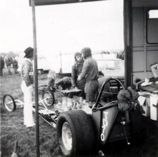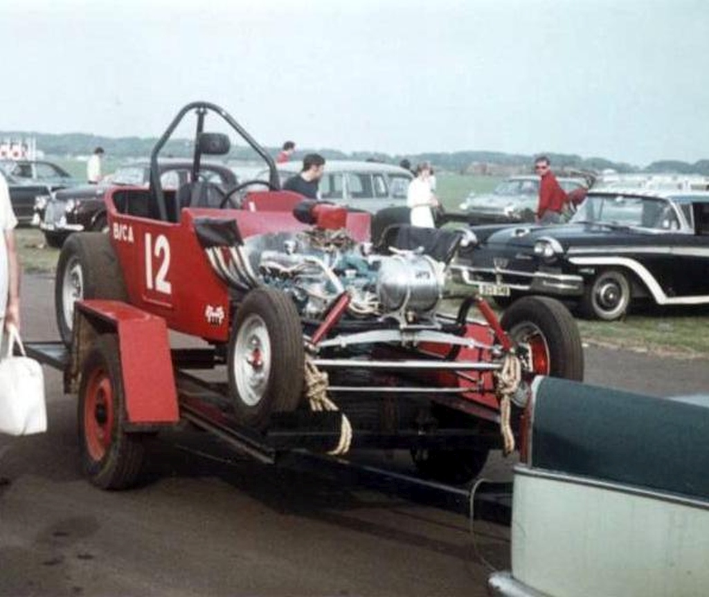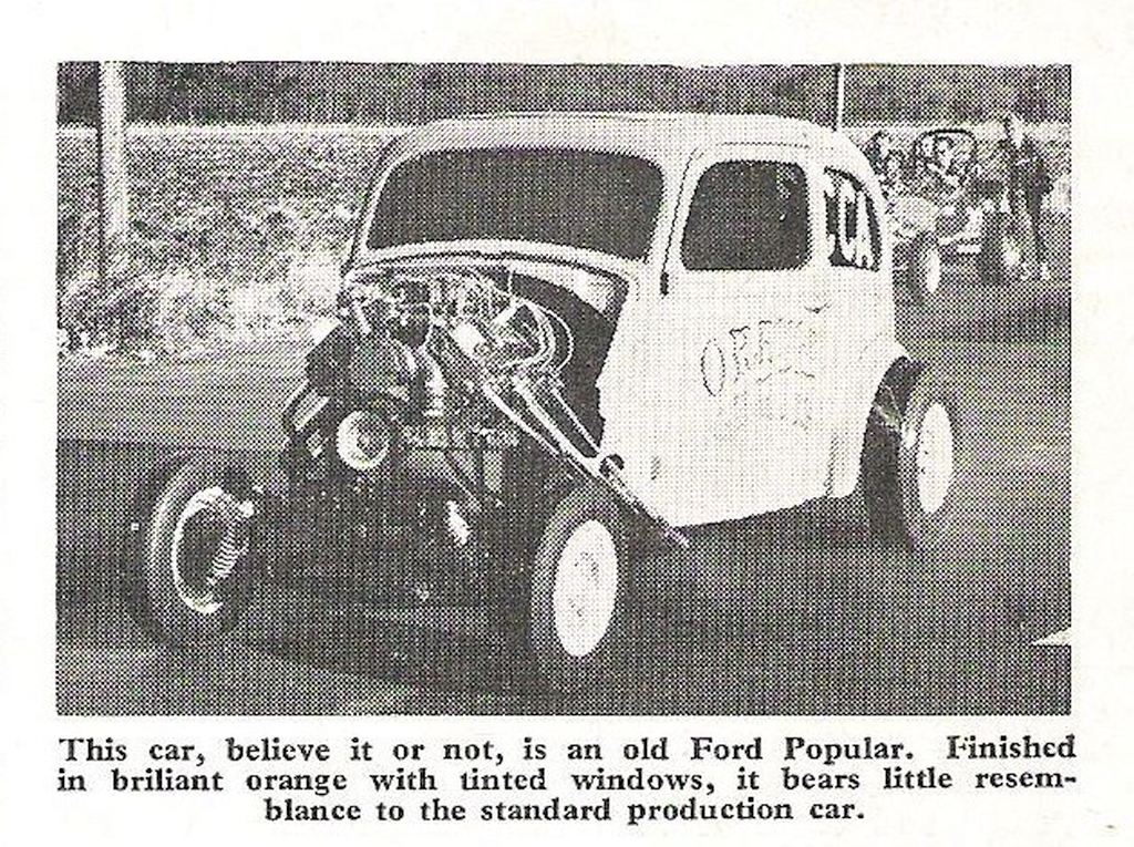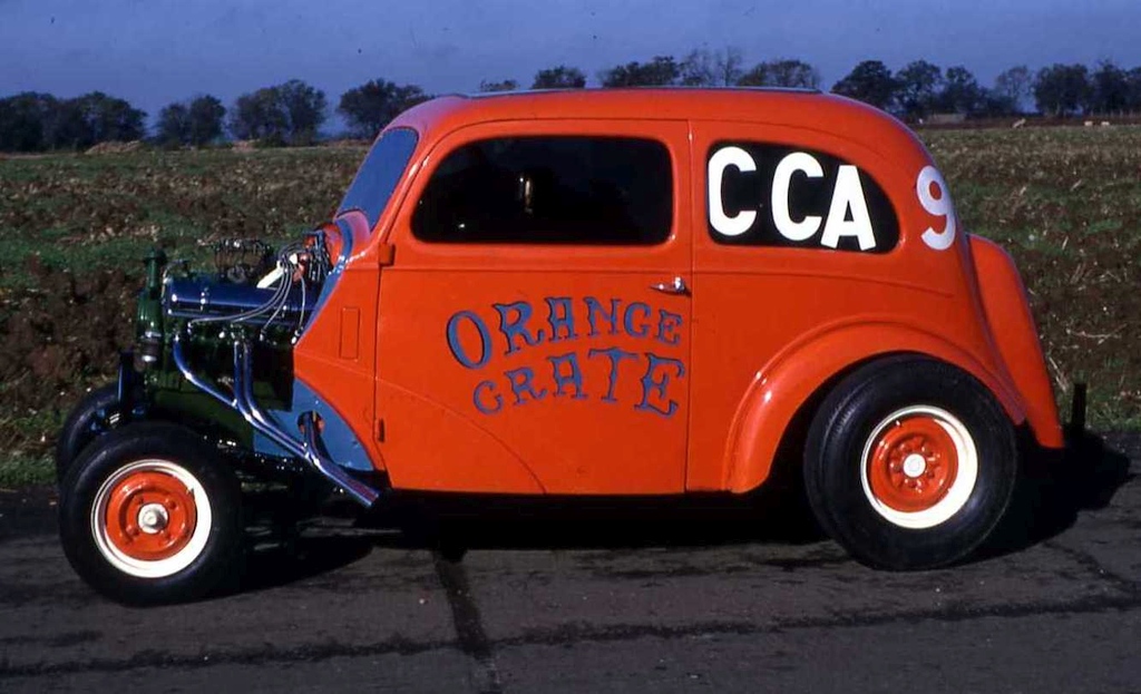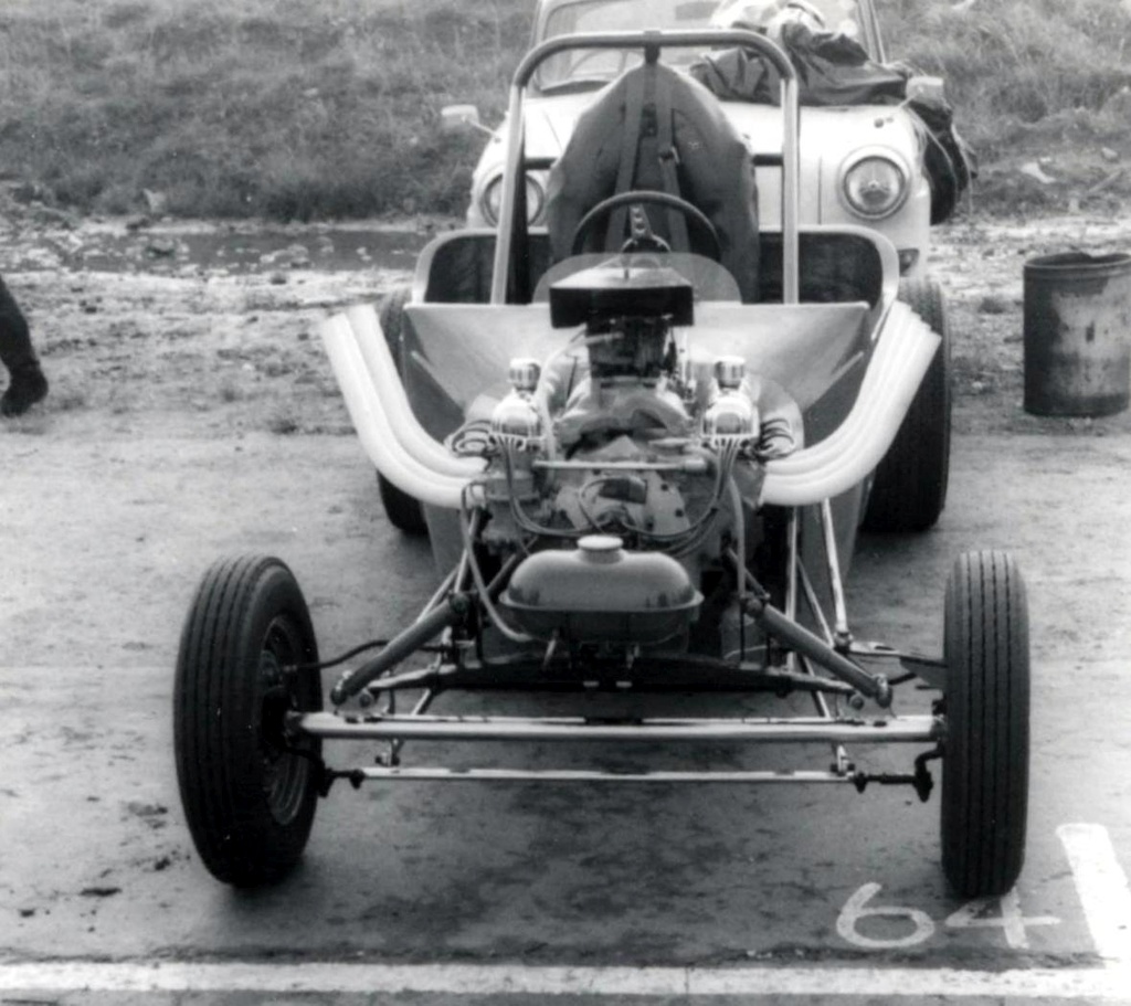 Our first car was called Orange Crate. We used an Oldsmobile V8 in a Ford Popular. We bought the Ford Pop from an elderly lady in Sutton Coldfield and completely gutted out the car. We had a problem finding a V8 engine but the Formula 1 stock car lads had them in abundance. One lad lived in Mere Green and had a 303 Oldsmobile mostly complete and a Chrysler Hemi of unknown capacity. Being naive and not having done our homework we choose the Oldsmobile engine for completeness, realising later that we made the wrong choice because the Chrysler would have been the way to go. We got the Oldsmobile up and running with a Ford 3 speed manual gearbox and Westminster rear axle. It worked and went but the performance didn’t live up to expectations, the build quality wasn’t good enough. Other teams were using tube chassis, we used the original one and it just didn’t look as professional.