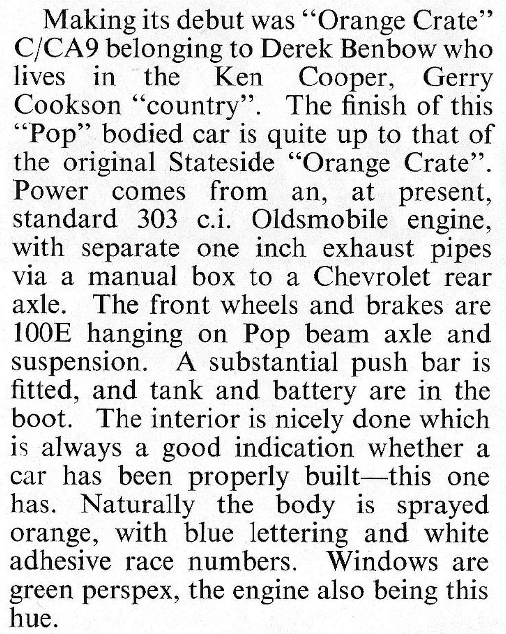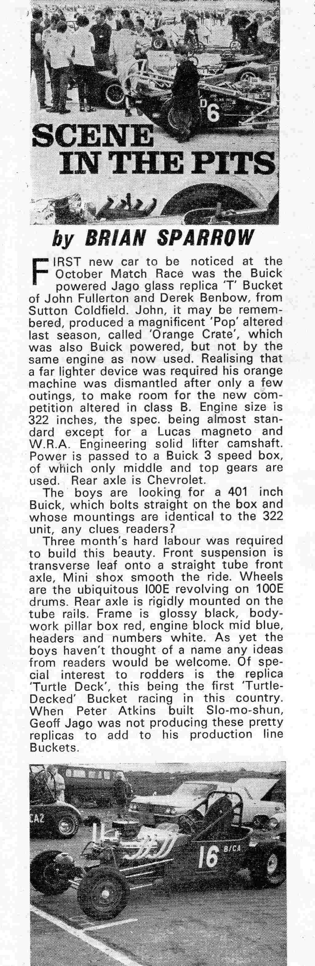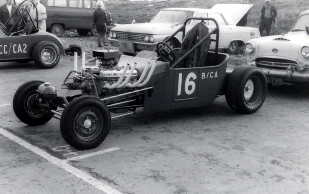 When I was still at school, I didn’t know it then, but Ken Cooper lived very close to my family home. He worked at a garage close by. I think he was only in his early teens and would drive past our house on a regular basis. In my opinion Ken would probably have been one of the first, if not the first Hot Rodder in the UK. He had a Hot Rod then that probably had a Flathead V8 out of a Ford Pilot or something. He continued and persevered with the Flathead engine and became really famous doing it. I notice he has been recognised by the Hall of Fame for his years of service as a Drag Racer. I spoke to him by phone fairly recently. His son Bradley I’ve never met but he seems to have taken over from where Ken left off. Competition record of John Fullerton and Derek Benbow, compiled by Clive Rooms: 1967: 24th September, Orange Crate, not entered in the programme, but made its debut. See scans. 1968: 6th October, B/CA16 Derek Benbow, Ford T, Buick 5278cc (This was its debut, see scan); 3rd November, B/CA16 Derek Benbow, Ford T, Buick 5278cc, 1969: